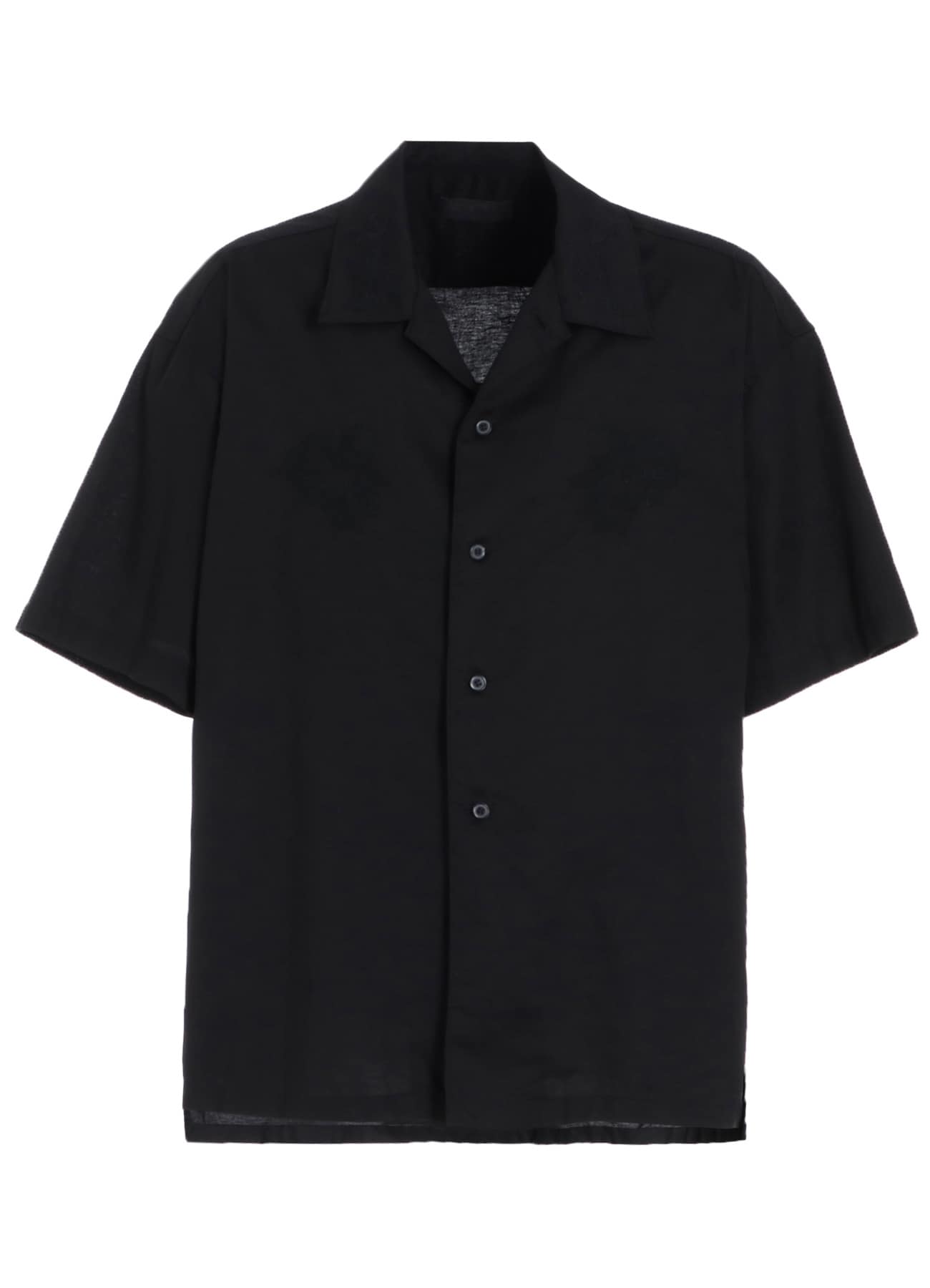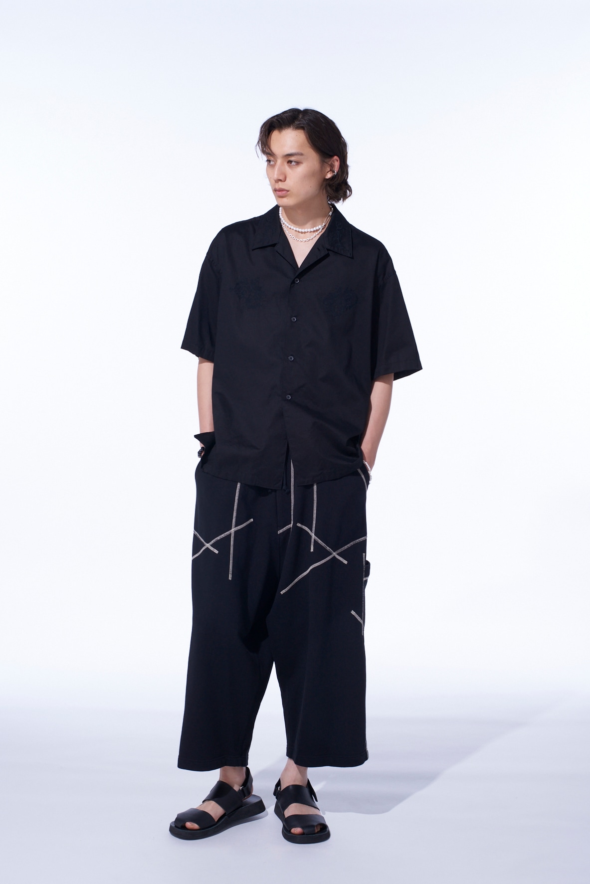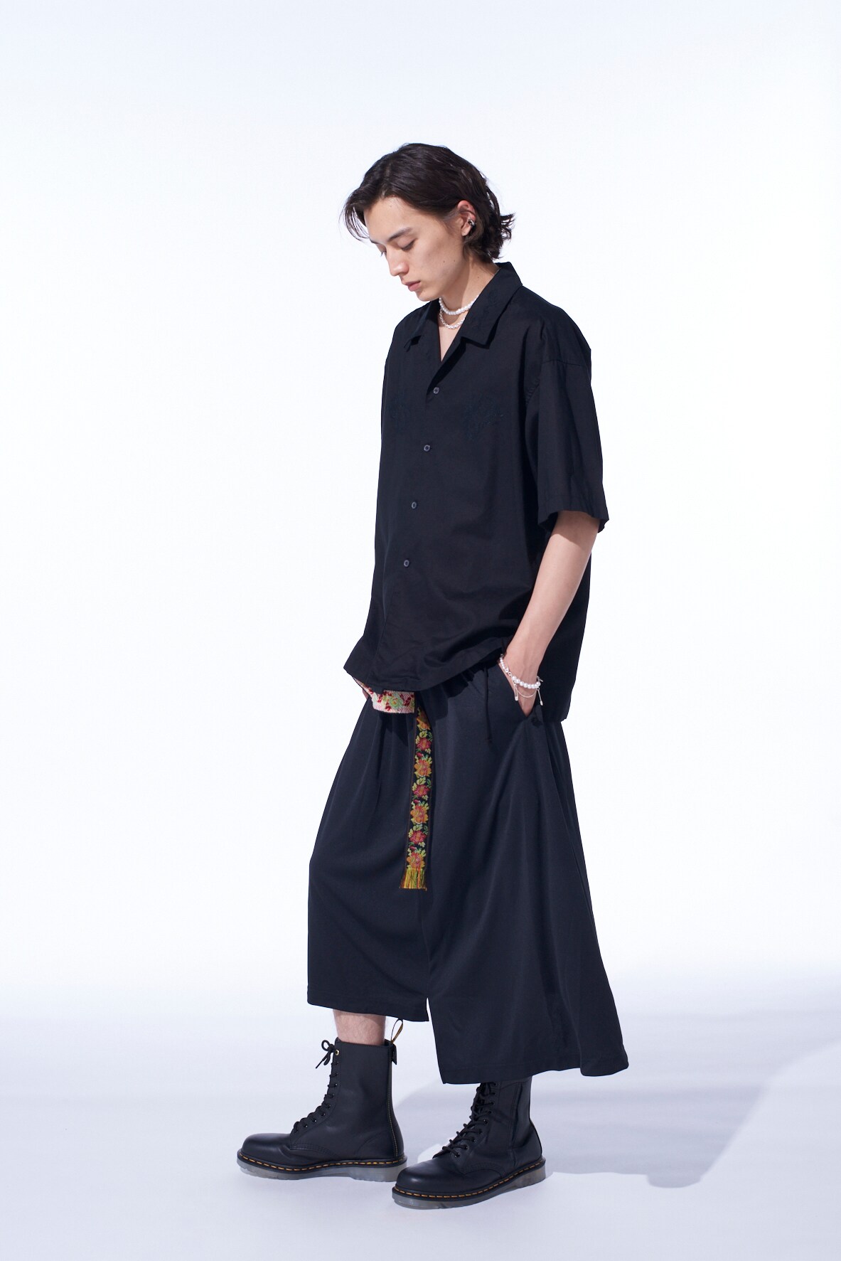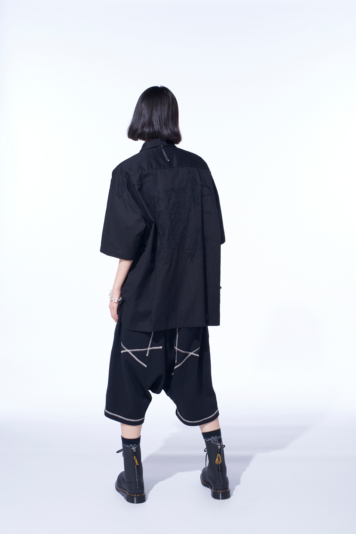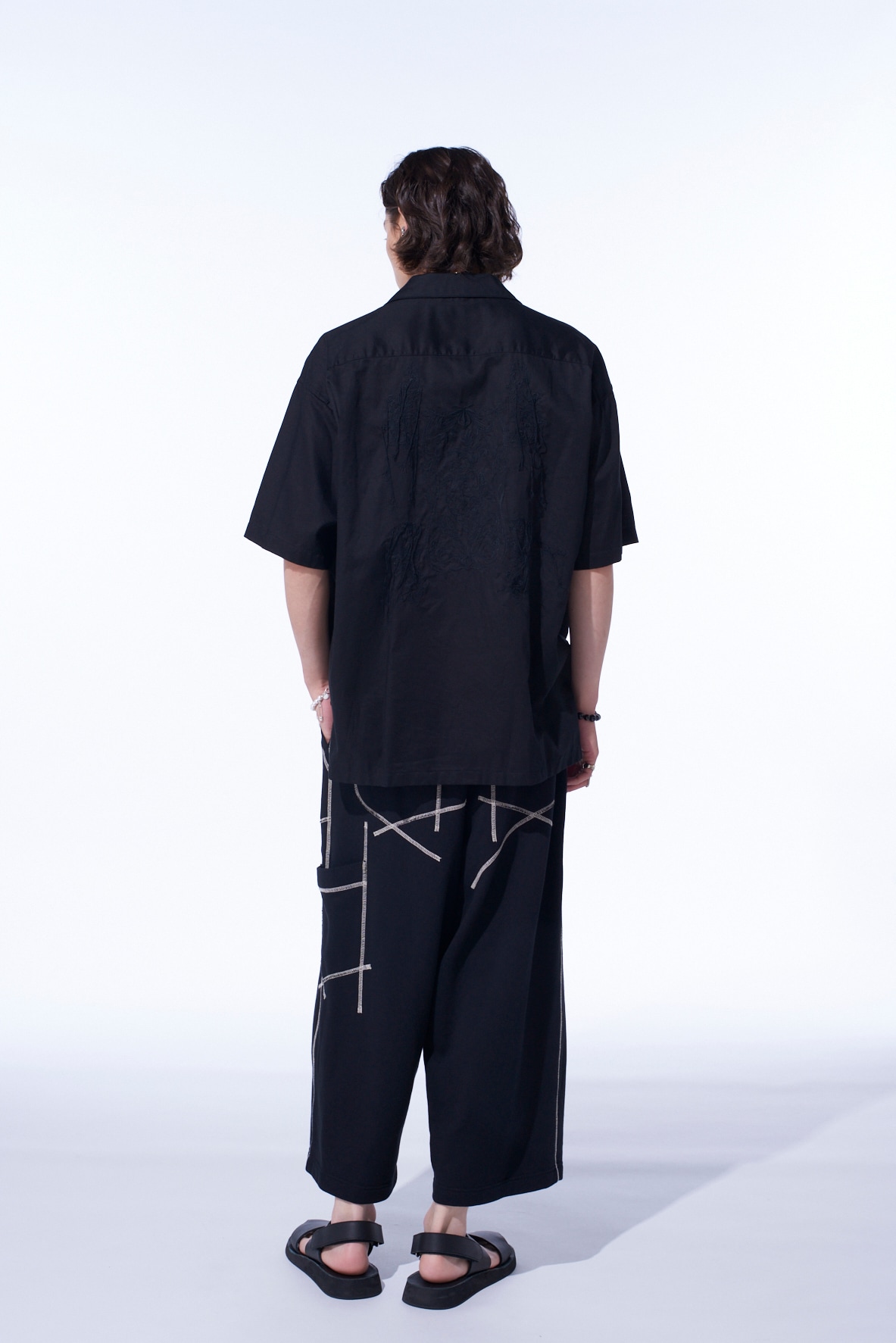 華麗で複雑な模様のバロック柄刺繍を襟、胸、背中に入れたオープンカラーシャツ。バックスタイルを飾る大きな構図の刺繍は1本1本の輪郭線にこだわり抜き、あえて刺繍糸を長く垂らすことで風に靡き、スタイリングのアクセントになる独特のニュアンスと華やかさが魅力。胸元を涼やかに演出するオープンカラーはトップボタンを留めることで首元のニュアンスアレンジが可能。柔らかい風合いに仕上げた薄手のコットンツイルは耐久性があり、着用を繰り返すことで綿素材ならではの雰囲気あるヤレ感を楽しめる。クセのないシルエットなのでさまざまなボトムとのコーディネートを楽しめる。