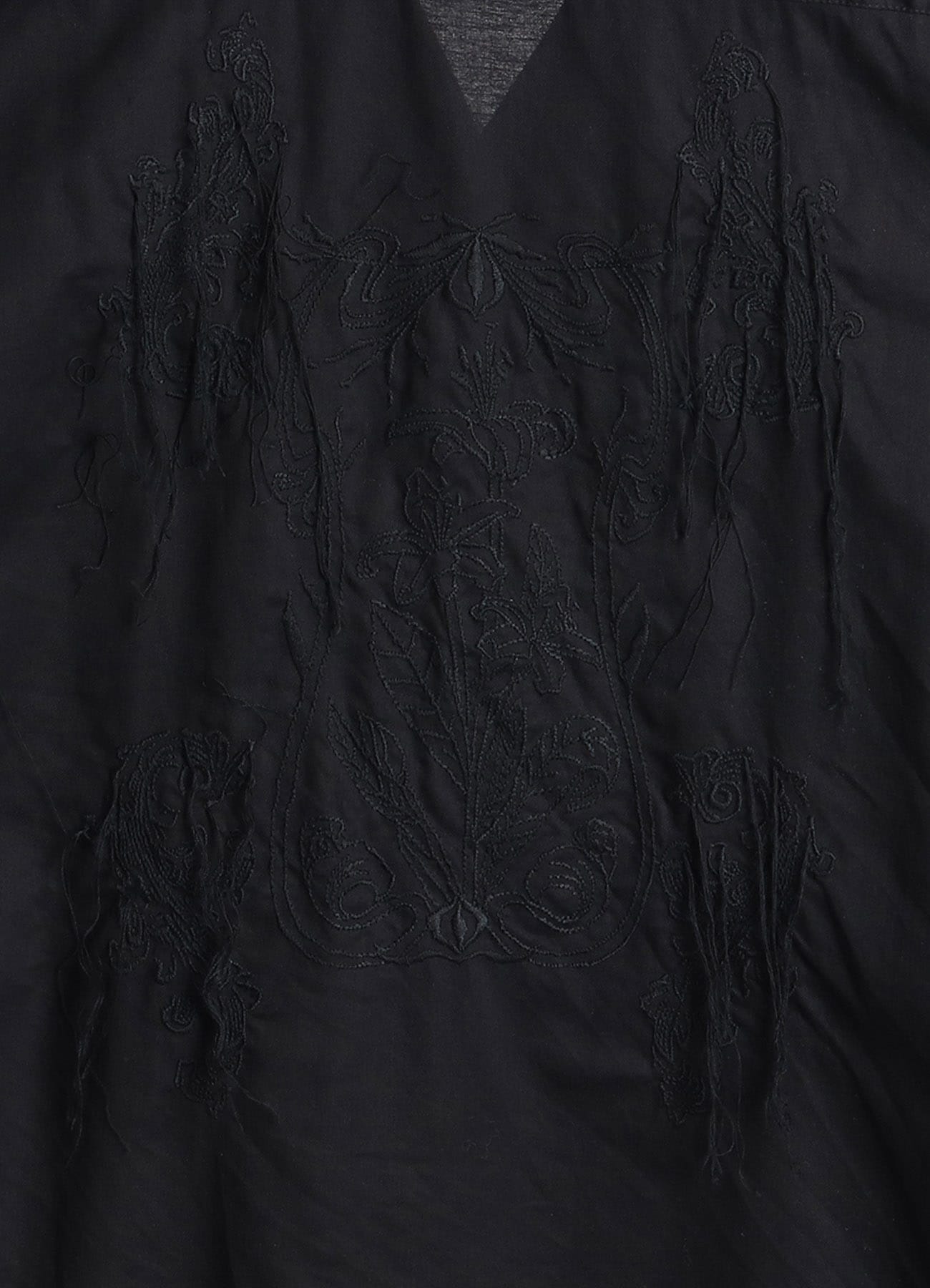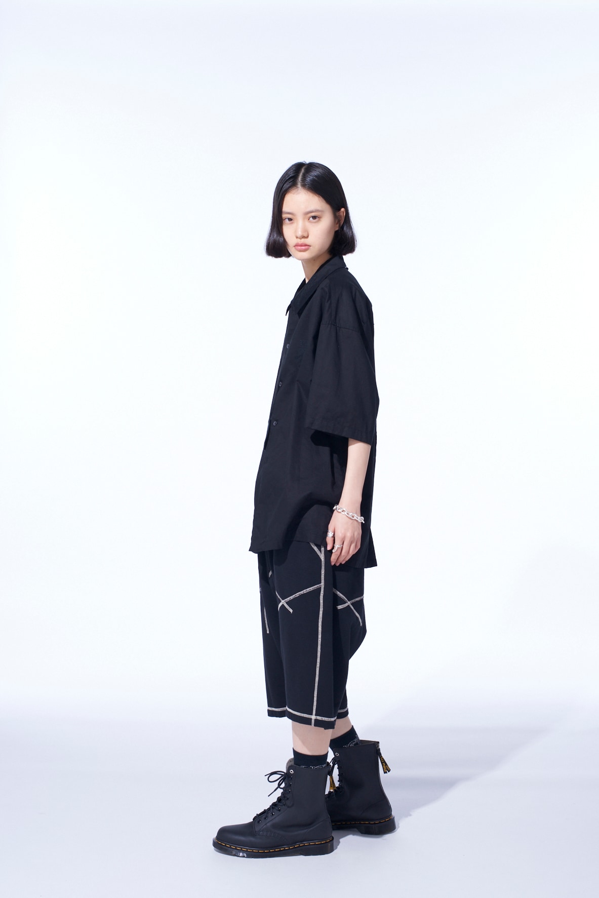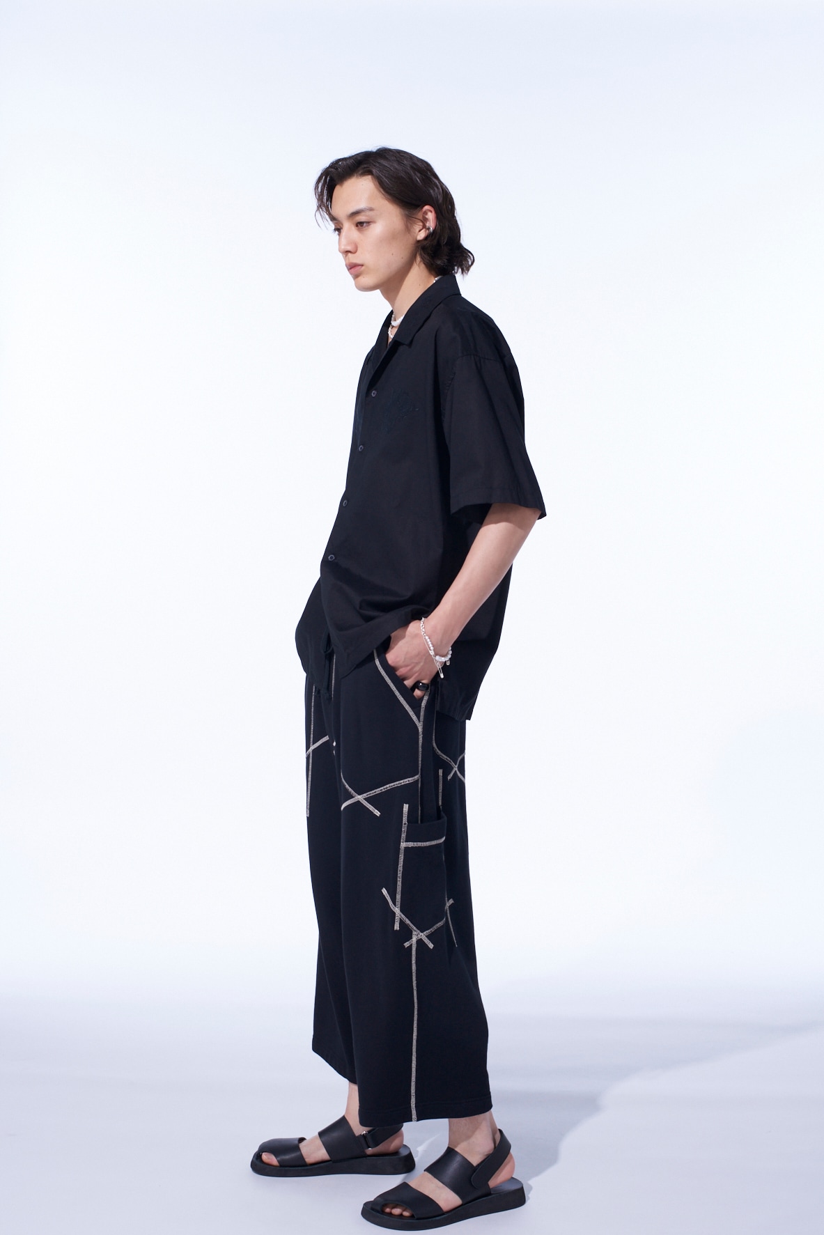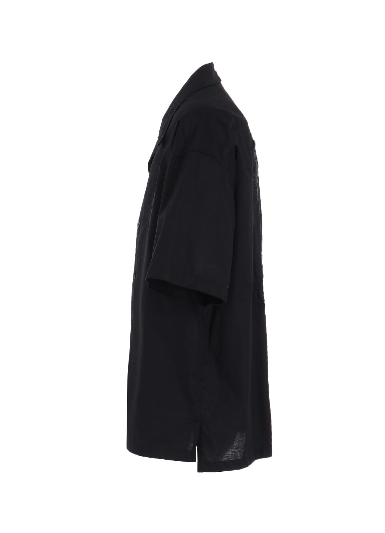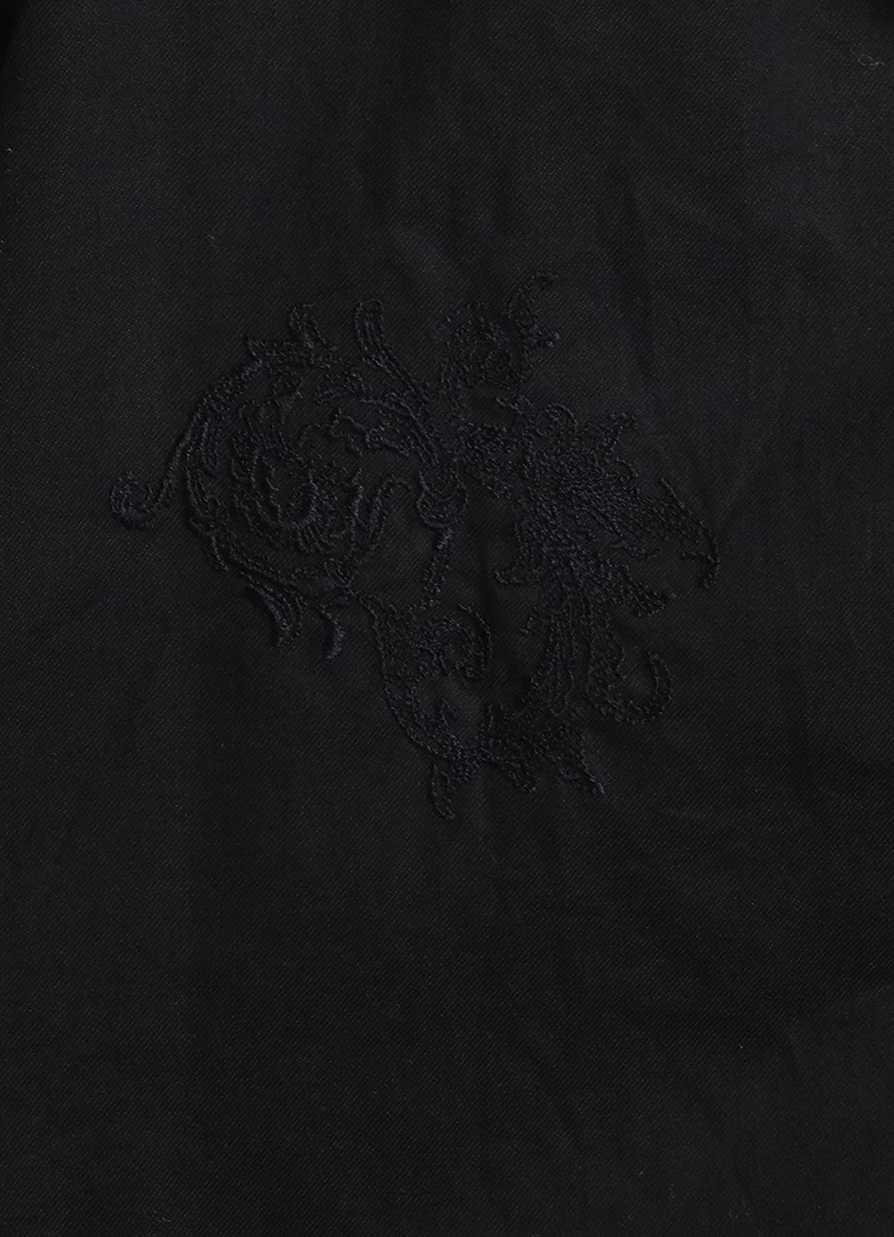 華麗で複雑な模様のバロック柄刺繍を襟、胸、背中に入れたオープンカラーシャツ。バックスタイルを飾る大きな構図の刺繍は1本1本の輪郭線にこだわり抜き、あえて刺繍糸を長く垂らすことで風に靡き、スタイリングのアクセントになる独特のニュアンスと華やかさが魅力。胸元を涼やかに演出するオープンカラーはトップボタンを留めることで首元のニュアンスアレンジが可能。柔らかい風合いに仕上げた薄手のコットンツイルは耐久性があり、着用を繰り返すことで綿素材ならではの雰囲気あるヤレ感を楽しめる。クセのないシルエットなのでさまざまなボトムとのコーディネートを楽しめる。