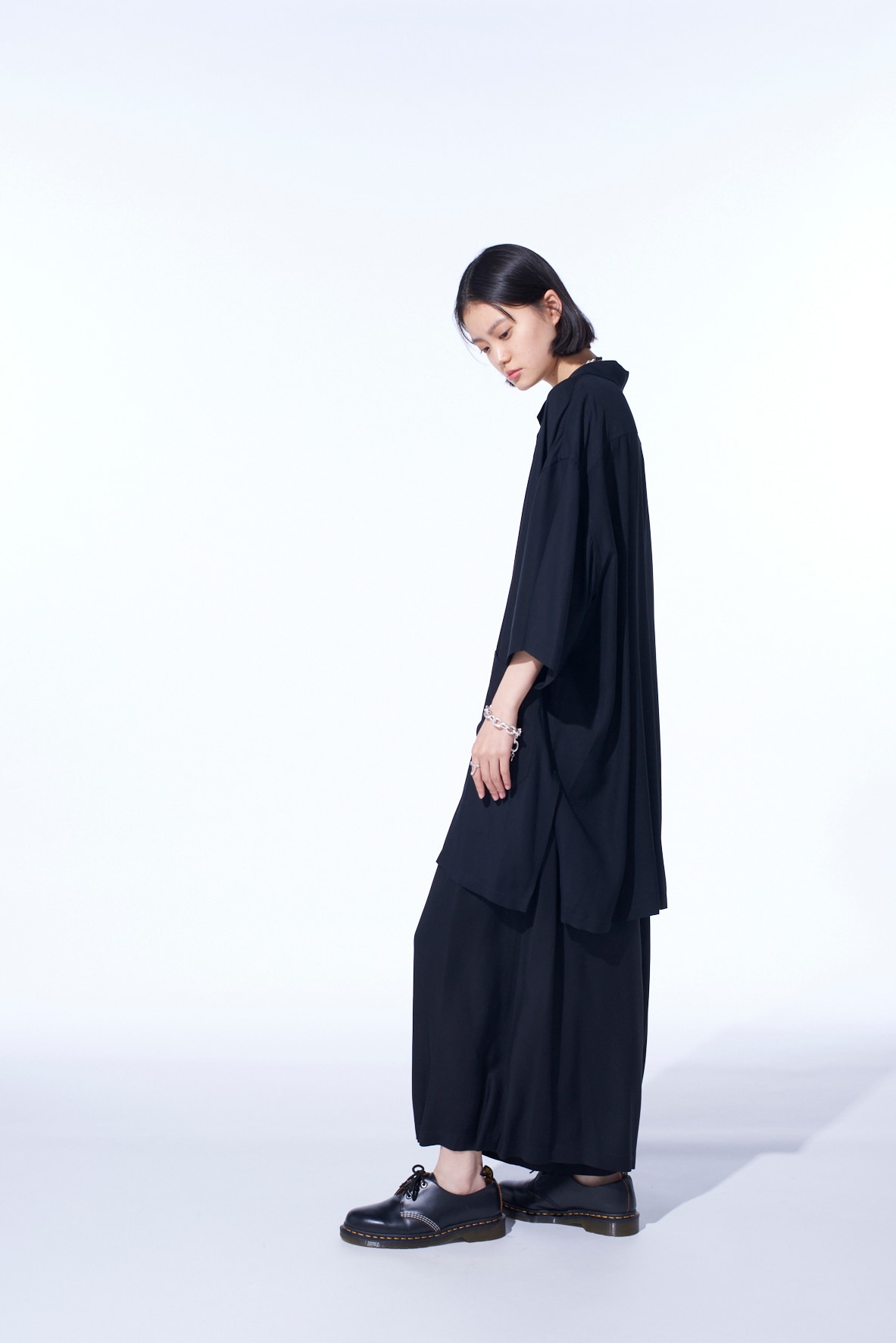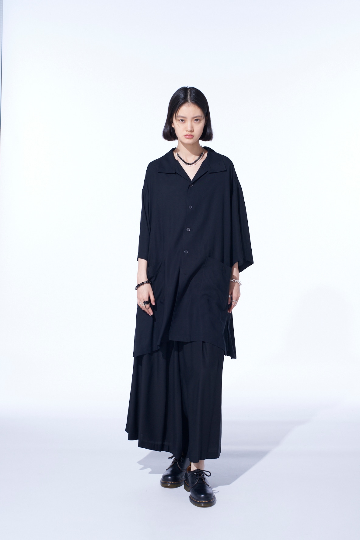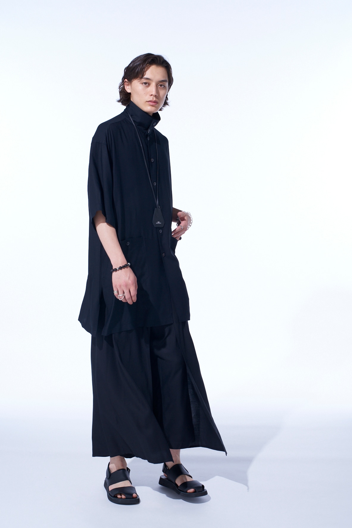 滑らかで肌馴染みの良い質感、光沢のある美しいドレープ感が特徴のレーヨンツイルで仕立てたオーバーサイズスタンドカラーシャツ。2連留めで高さのあるスタンドカラーはボタンを開け、オープンカラーのように首元のニュアンスアレンジが可能。長めの着丈で腰元にはポケットをつけており、前を開け羽織り物感覚でも楽しめる。薄手のレーヨンツイル生地は多汗な時期に心地よく着用できる生地。動きと共に変化する軽やかなシルエットで涼感のあるスタイリングに重宝する。