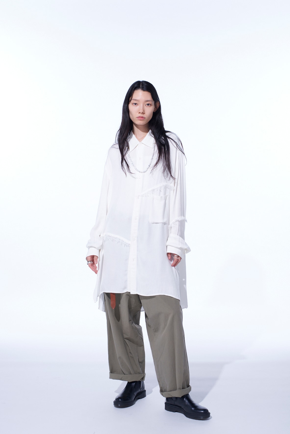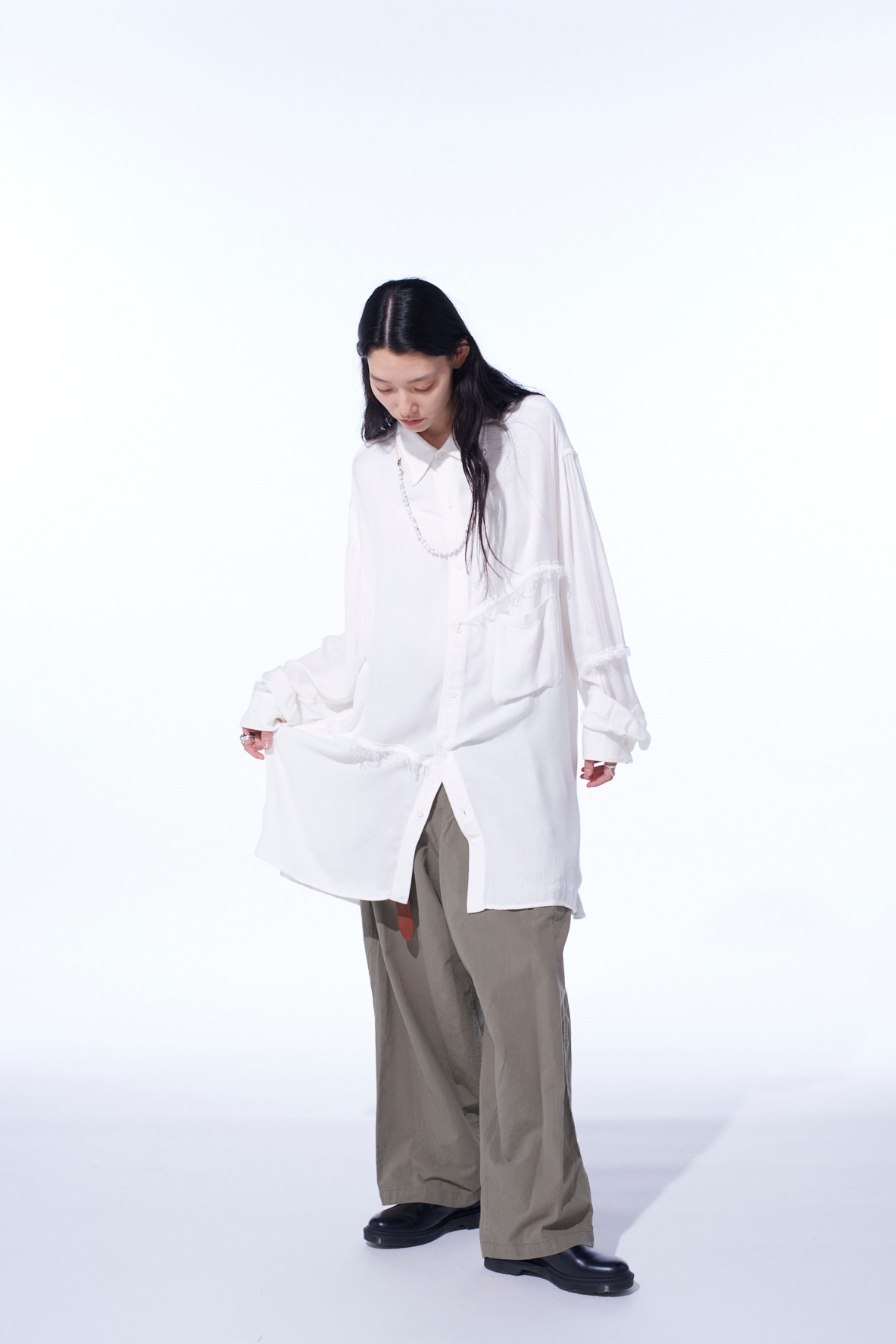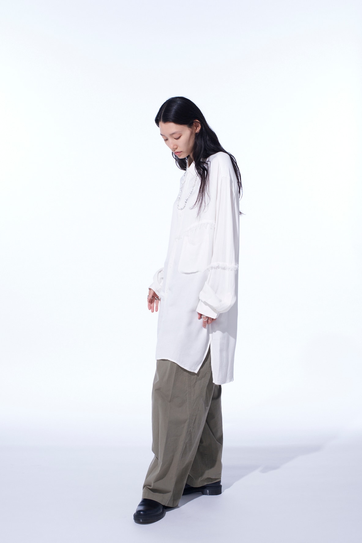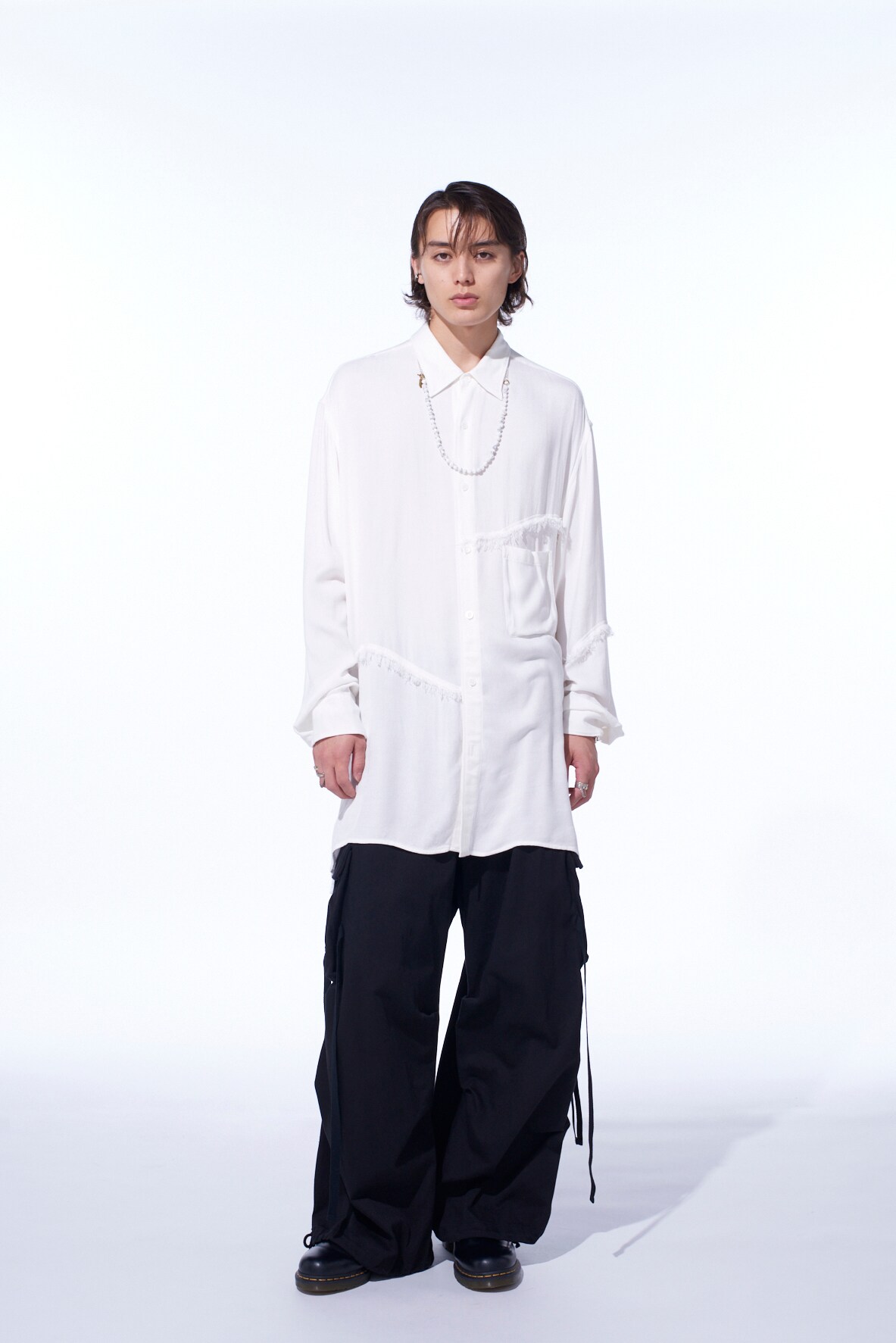 身頃へランダムに入れた裁ち切りの切り替えが目を引くビッグシルエットの台襟付きレギュラーカラーシャツ。