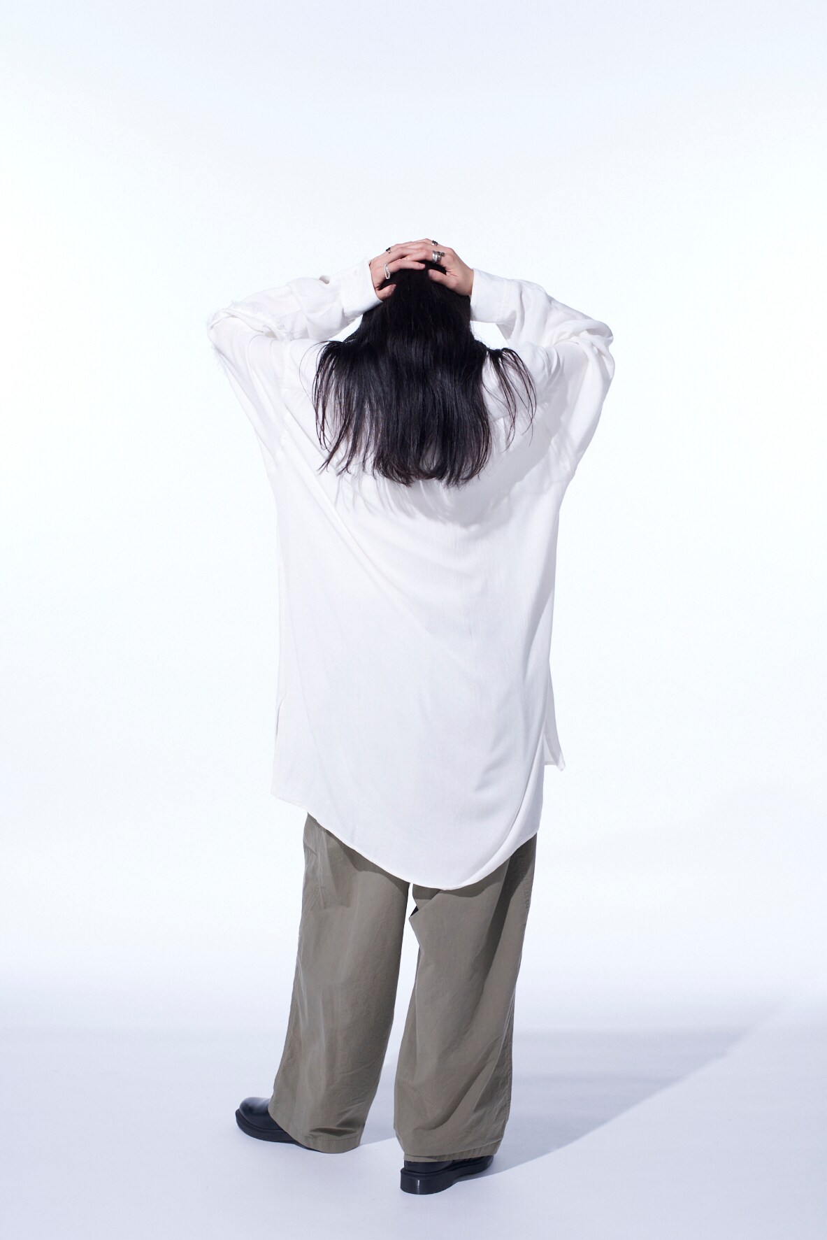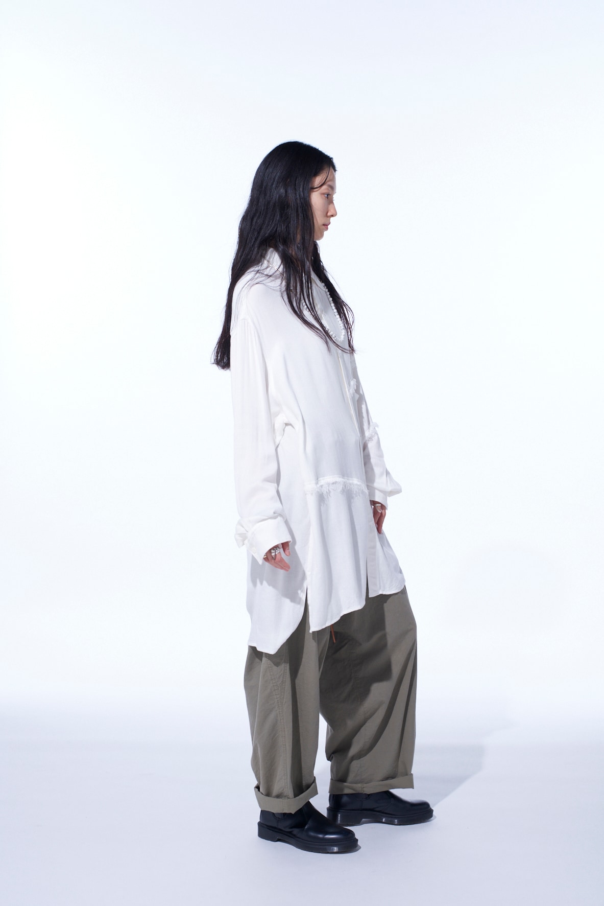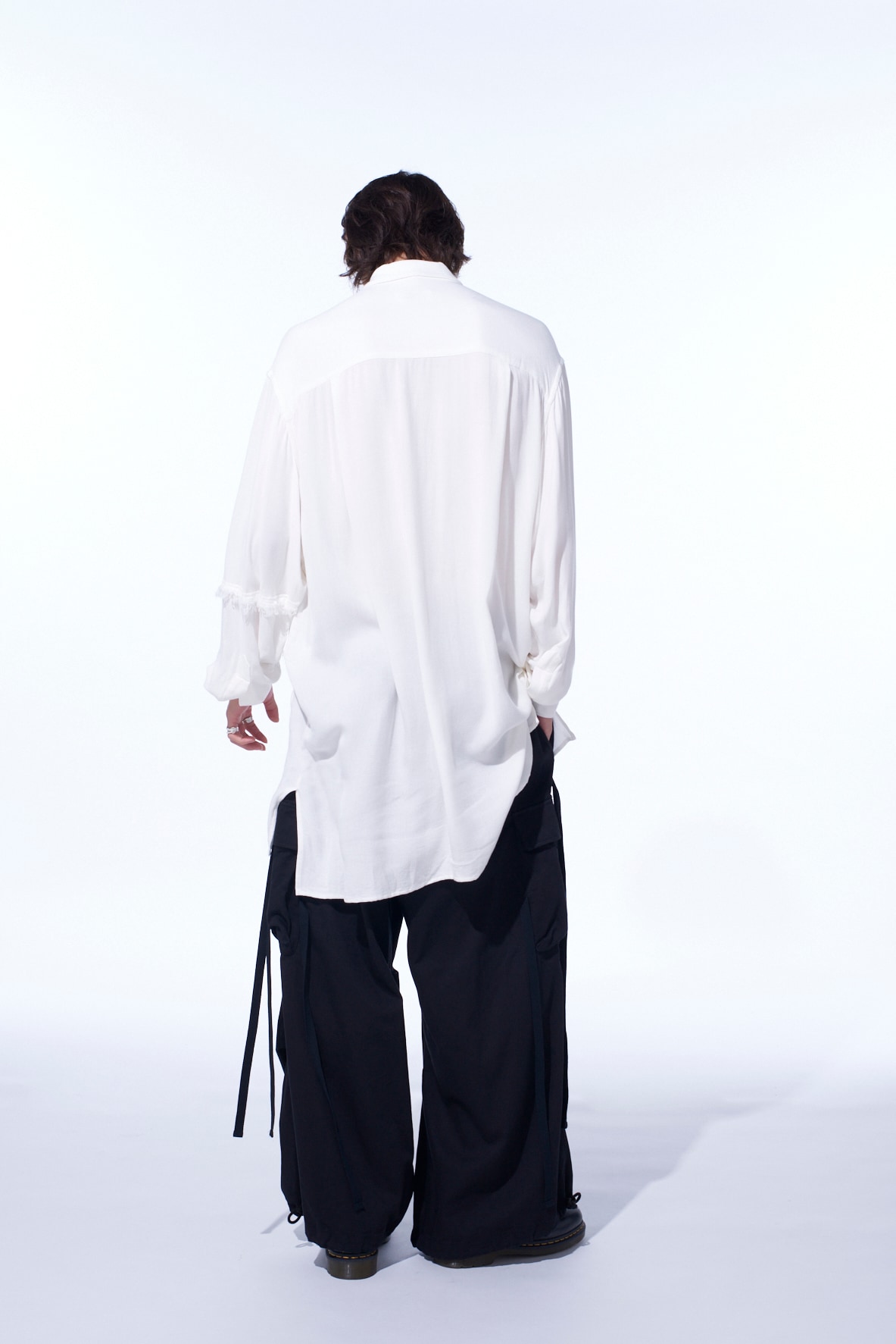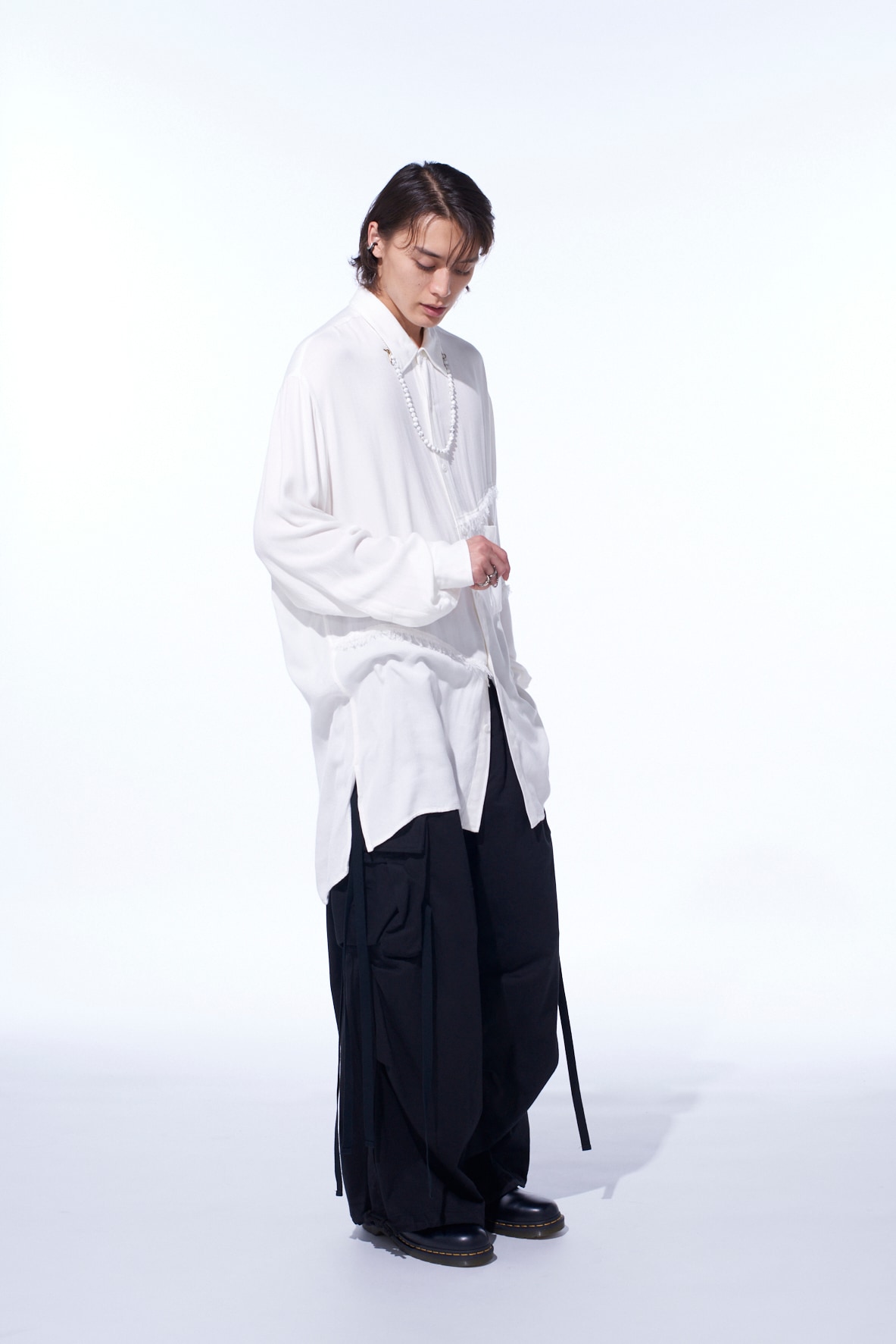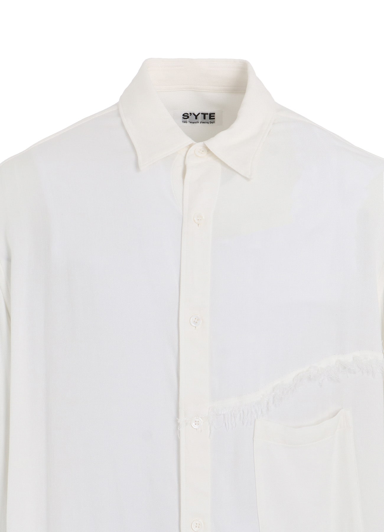 身頃へランダムに入れた裁ち切りの切り替えが目を引くビッグシルエットの台襟付きレギュラーカラーシャツ。