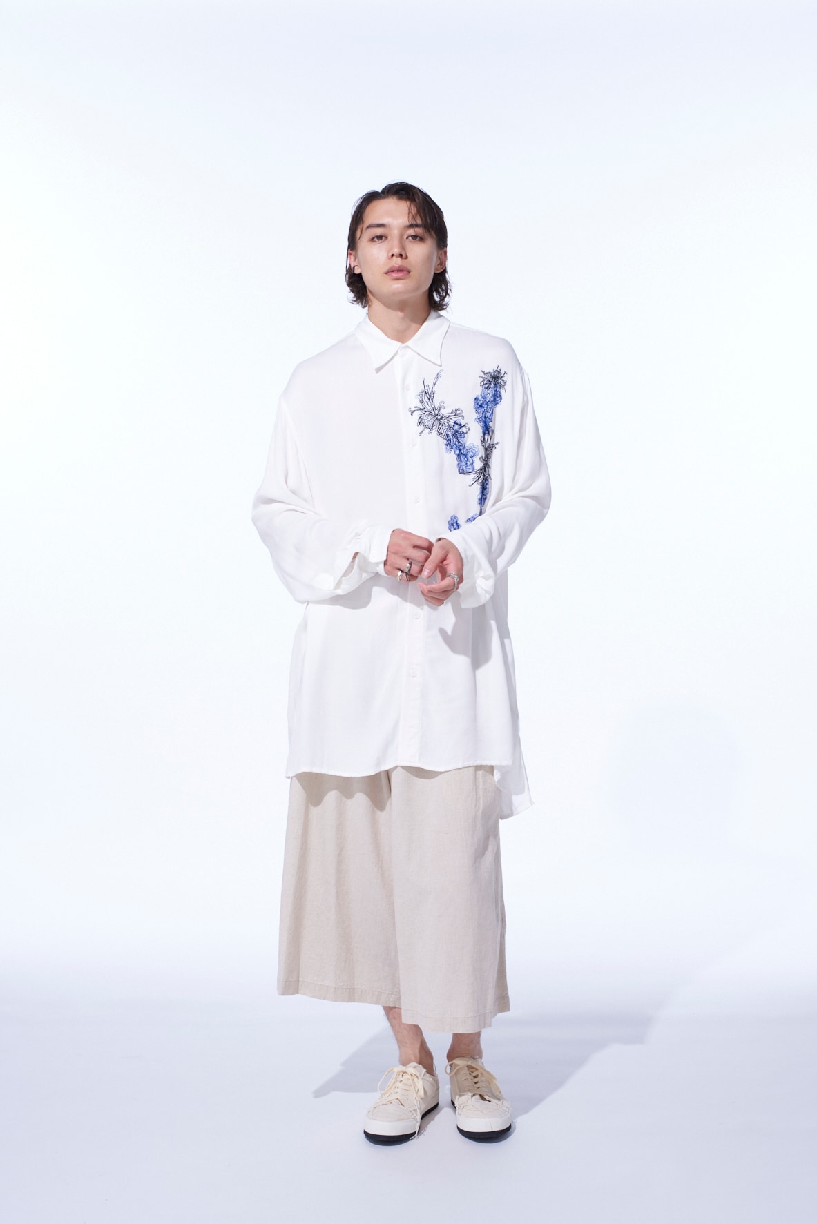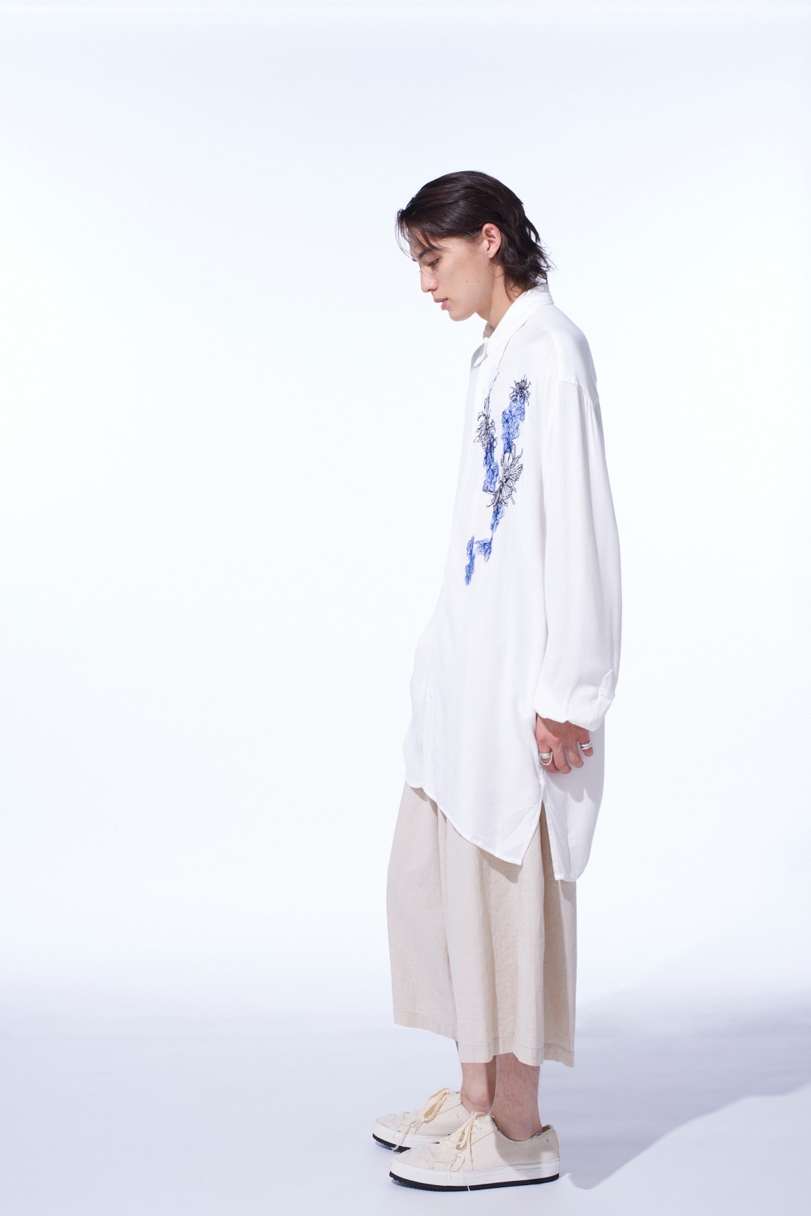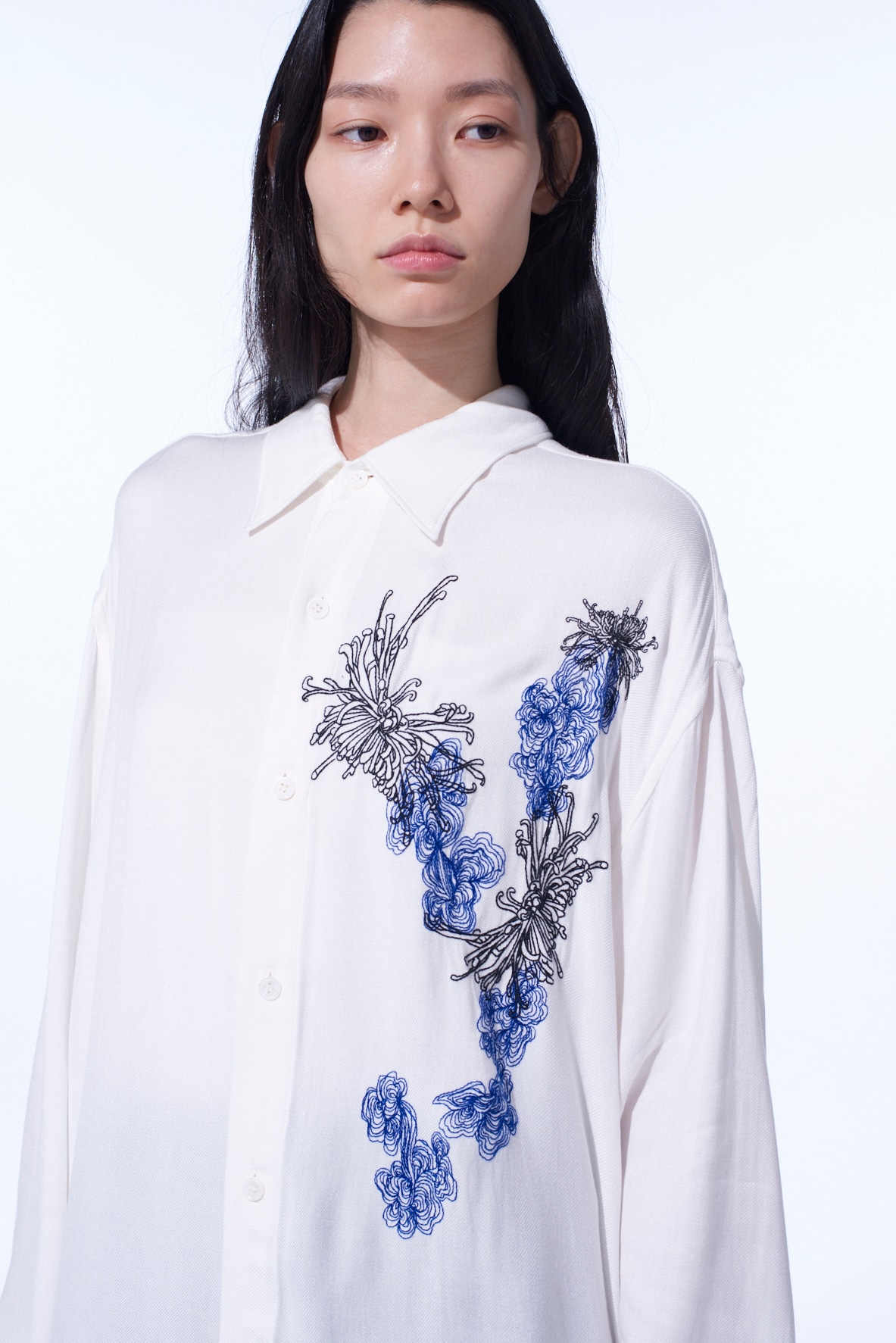 菊と靄(もや)のモチーフを掛け合わせ”y”を表現した刺繍が胸元を飾る、オーバーサイズの台襟付きレギュラーカラーシャツ。インド織機で織られた独特な風合いがナチュラルな雰囲気を演出してくれるビスコースツイルは滑りの良い肌触りで汗ばむ季節でも心地よい着用感を得られる。とろみと適度なコシが生む、動きのある軽やかなシルエットを楽しめ、ビスコースならではの流れるようなドレープ感を堪能できる。タックインスタイルで程よくブラウジングさせるスタイリングもおすすめ。※本製品はインド製手織りのためネップなどナチュラルな風合いが見られます。メンズモデル着用サイズ:Mサイズレディースモデル着用サイズ:Sサイズ