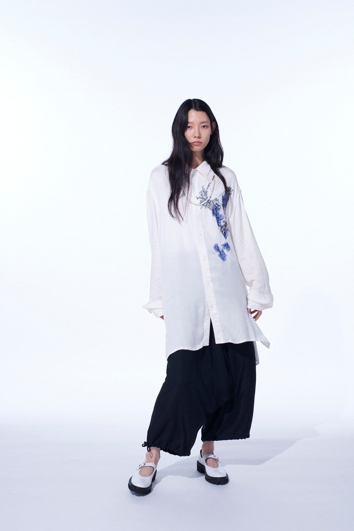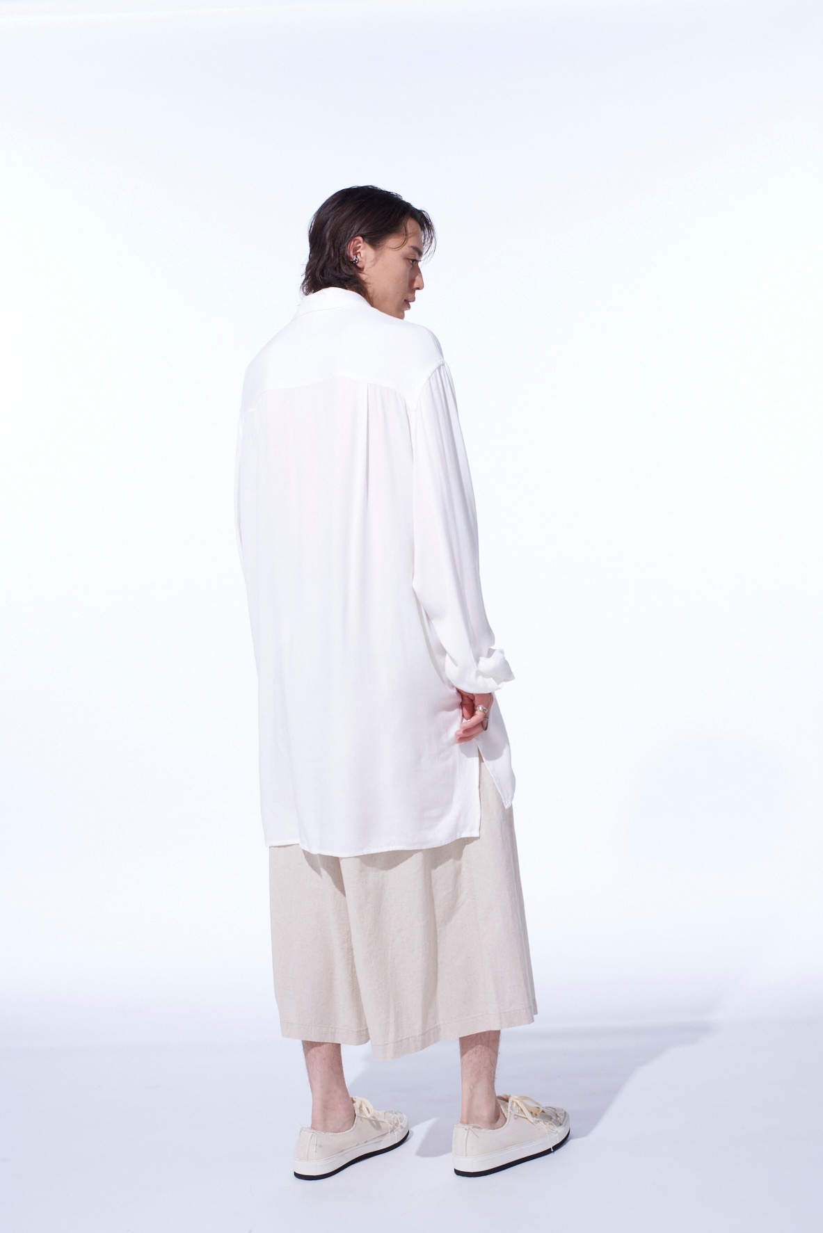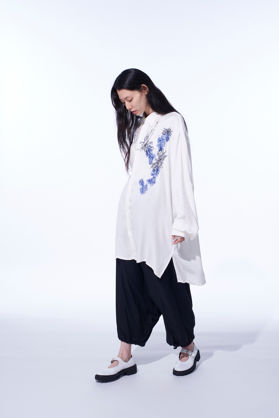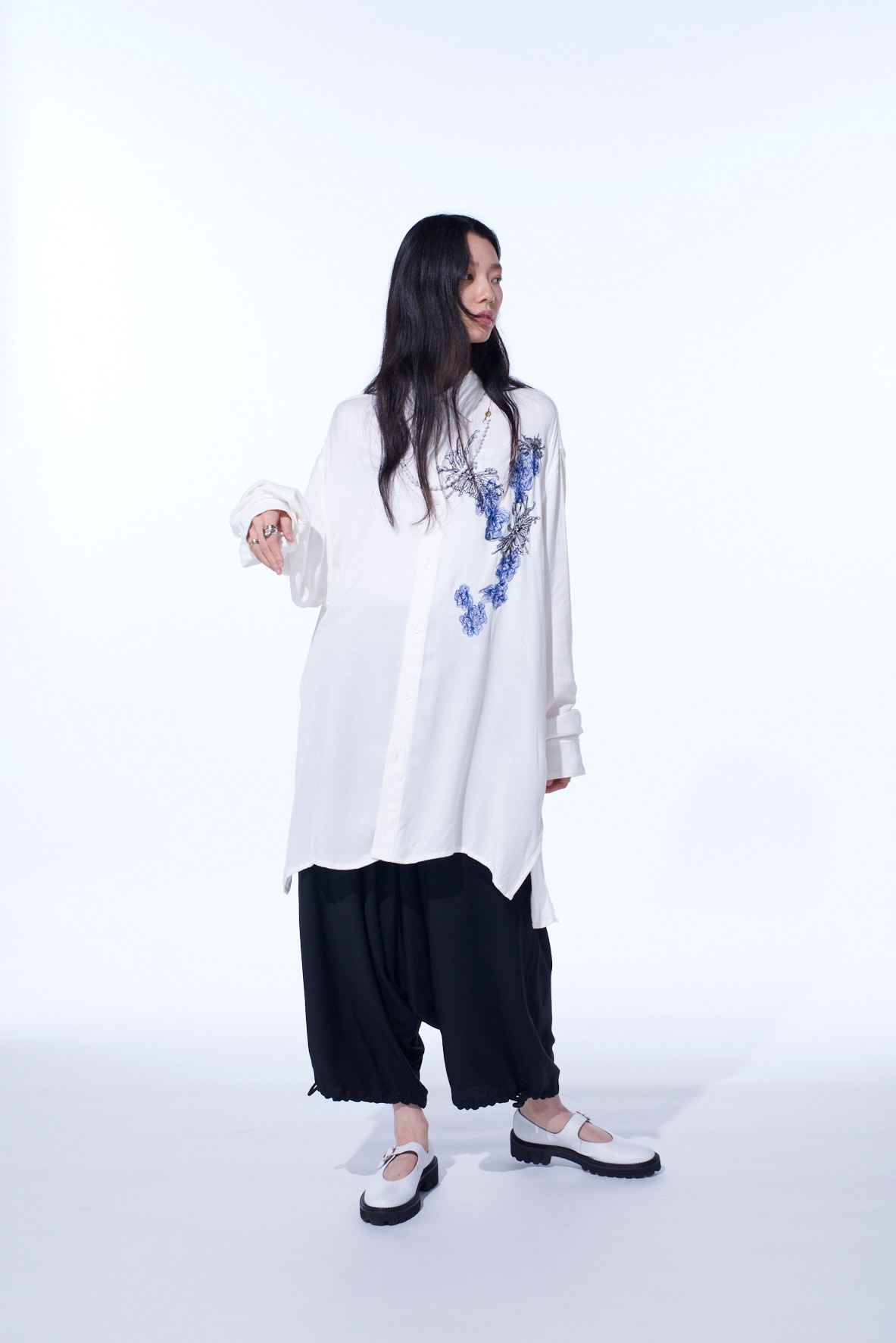 菊と靄(もや)のモチーフを掛け合わせ”y”を表現した刺繍が胸元を飾る、オーバーサイズの台襟付きレギュラーカラーシャツ。インド織機で織られた独特な風合いがナチュラルな雰囲気を演出してくれるビスコースツイルは滑りの良い肌触りで汗ばむ季節でも心地よい着用感を得られる。とろみと適度なコシが生む、動きのある軽やかなシルエットを楽しめ、ビスコースならではの流れるようなドレープ感を堪能できる。タックインスタイルで程よくブラウジングさせるスタイリングもおすすめ。※本製品はインド製手織りのためネップなどナチュラルな風合いが見られます。メンズモデル着用サイズ:Mサイズレディースモデル着用サイズ:Sサイズ