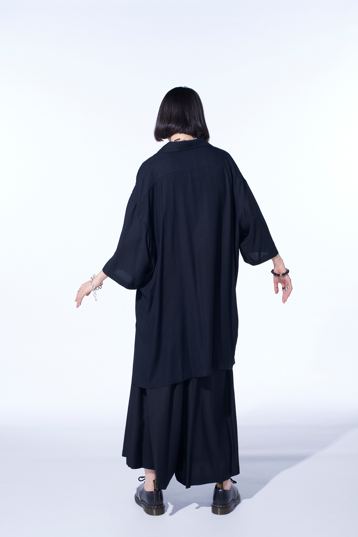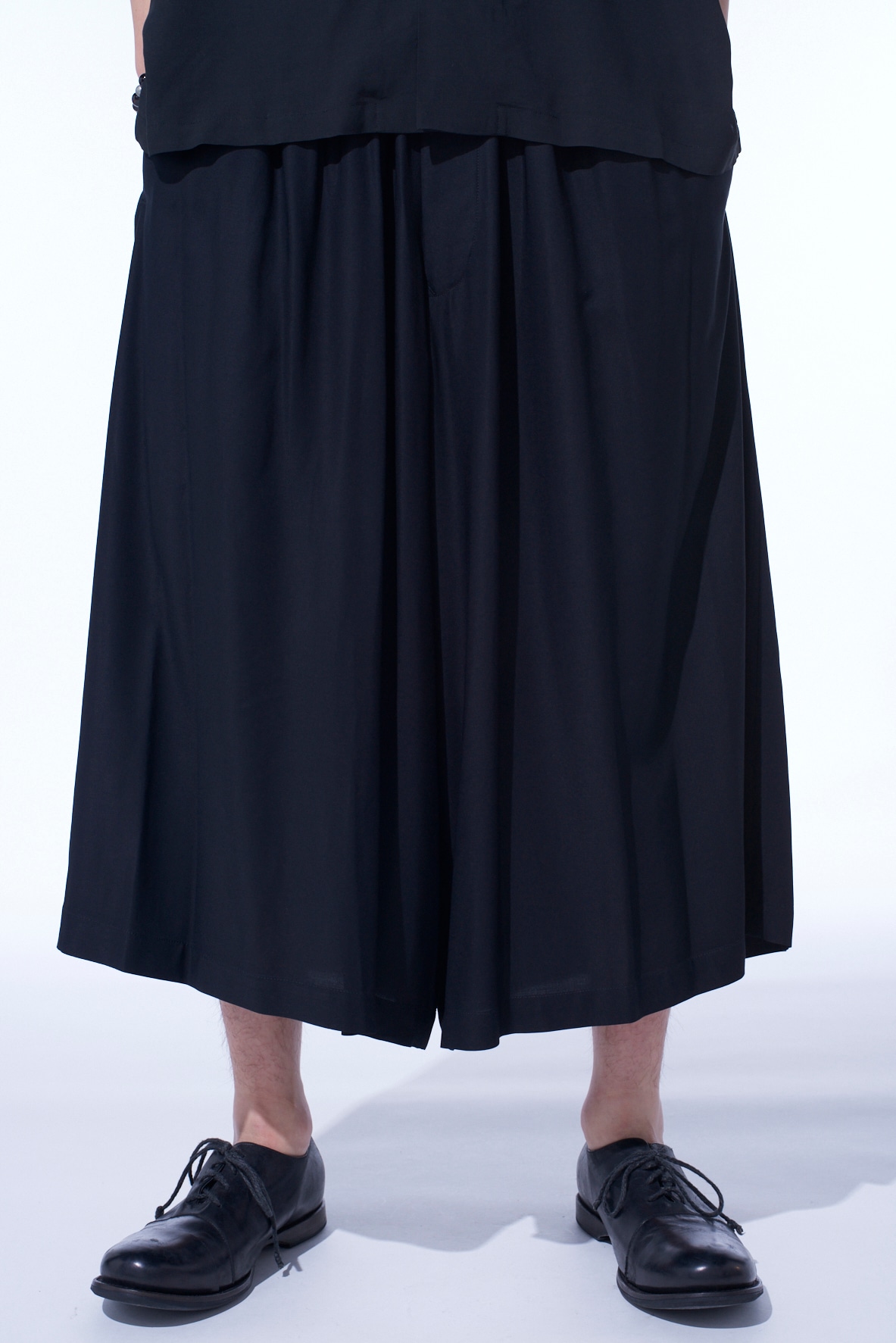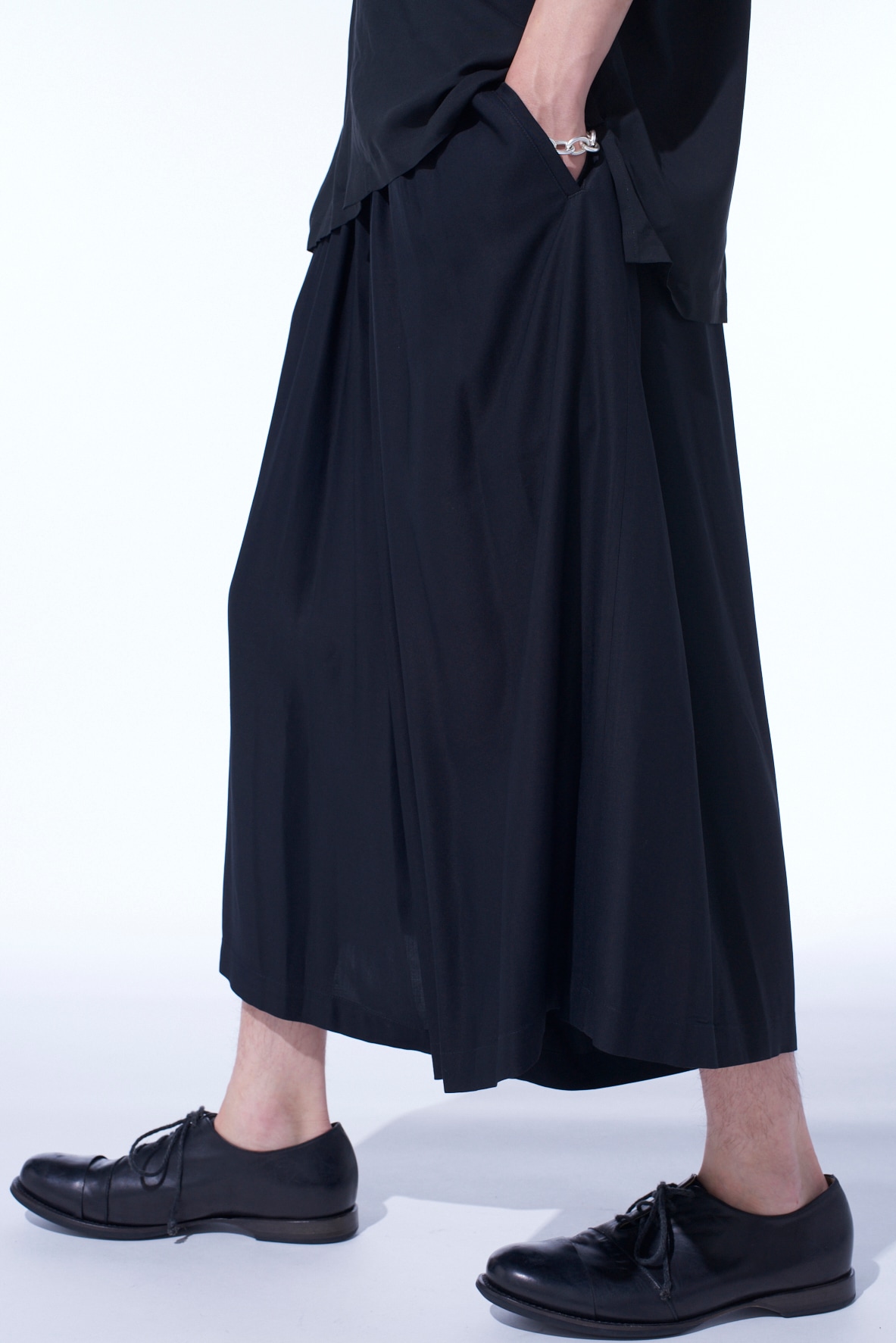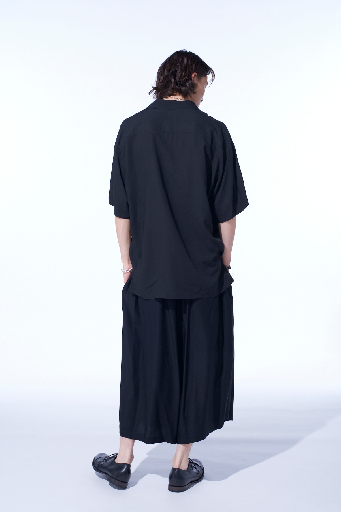 滑らかで肌馴染みの良い質感、光沢のある美しいドレープ感が特徴のレーヨンツイルで仕立てたキュロットパンツ。スカートとパンツを共有するガウチョワイドシルエットで最もイージーに”らしさ”を出せる丈とボリュームが魅力。とろみのあるシャツやカットソーと親和性が高く、風に靡く布地の美しさ、動きとともに刻々と変化するシルエットを楽しめるのはこの生地ならでは。季節に合わせブーツ、スニーカー、サンダルと足元をアレンジできる万能なレングス設定。着合わせを選ばないシンプルな形はコーディネートバリエーションに富み、夏に最適解な涼やかなブラックスタイルに重宝する。