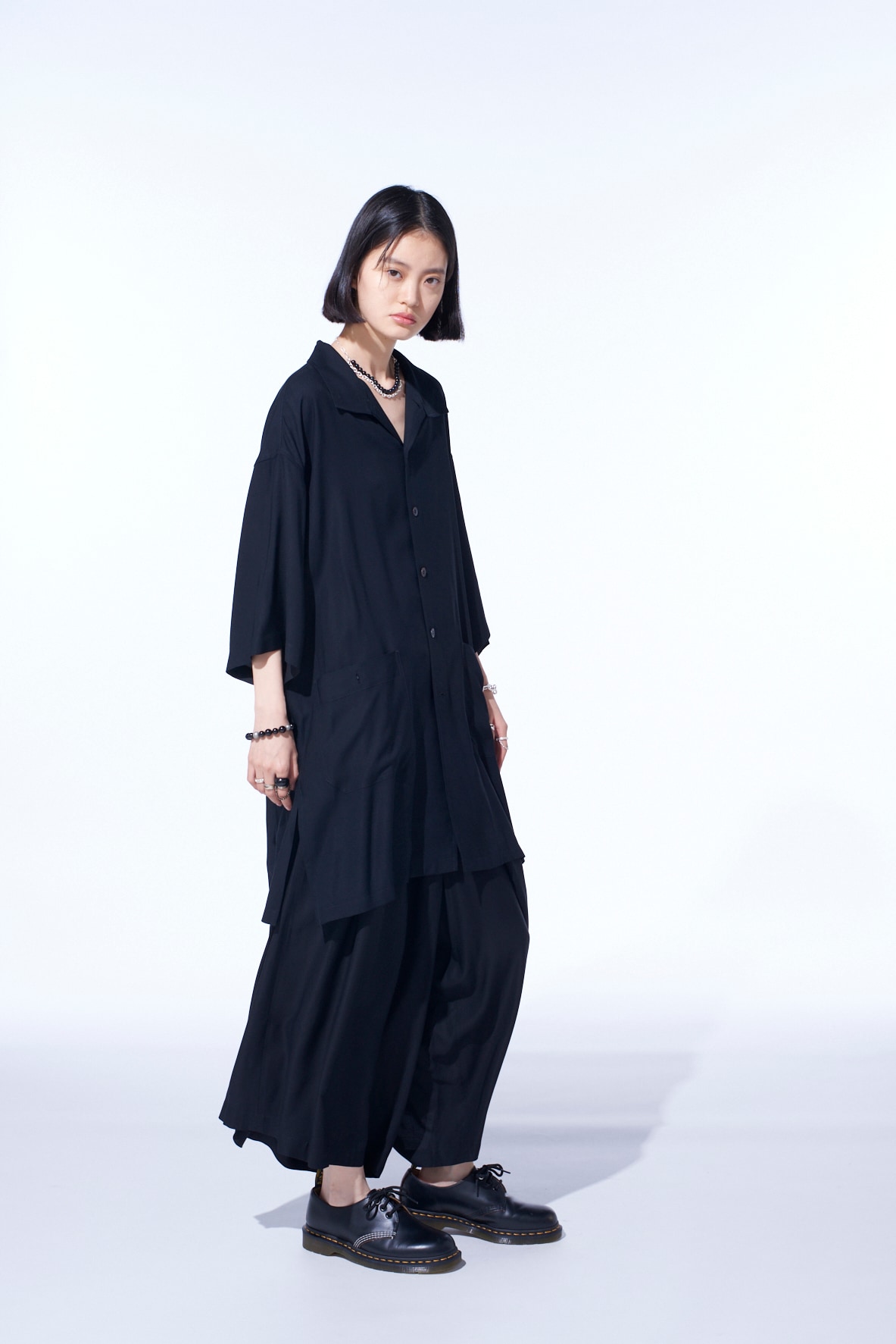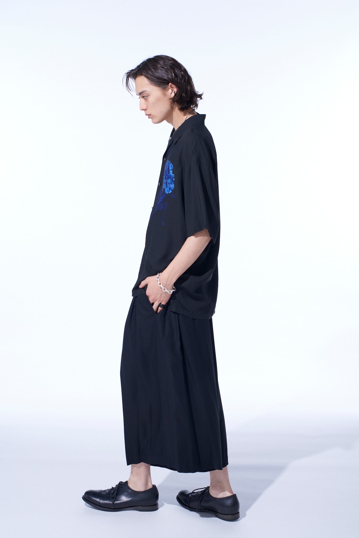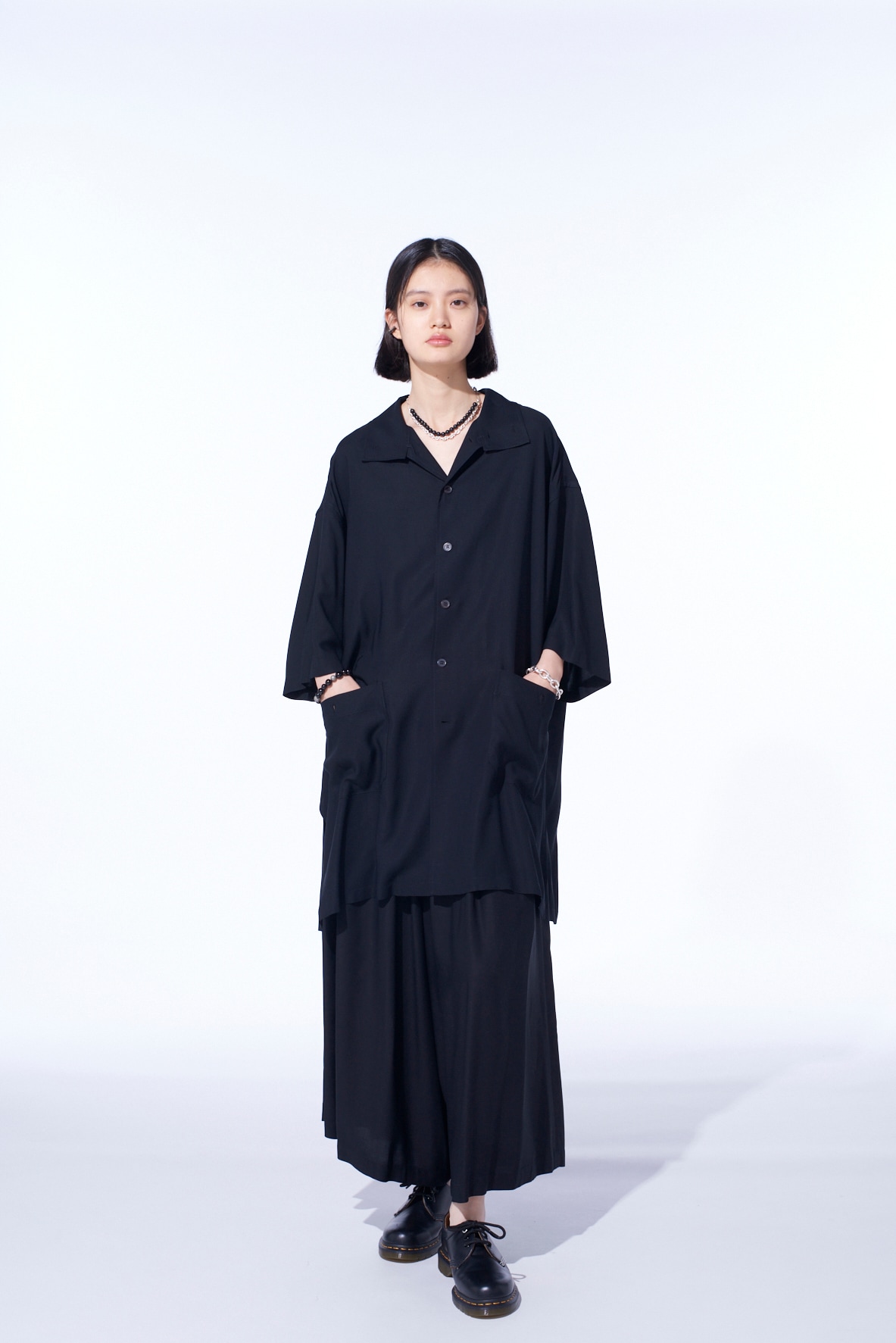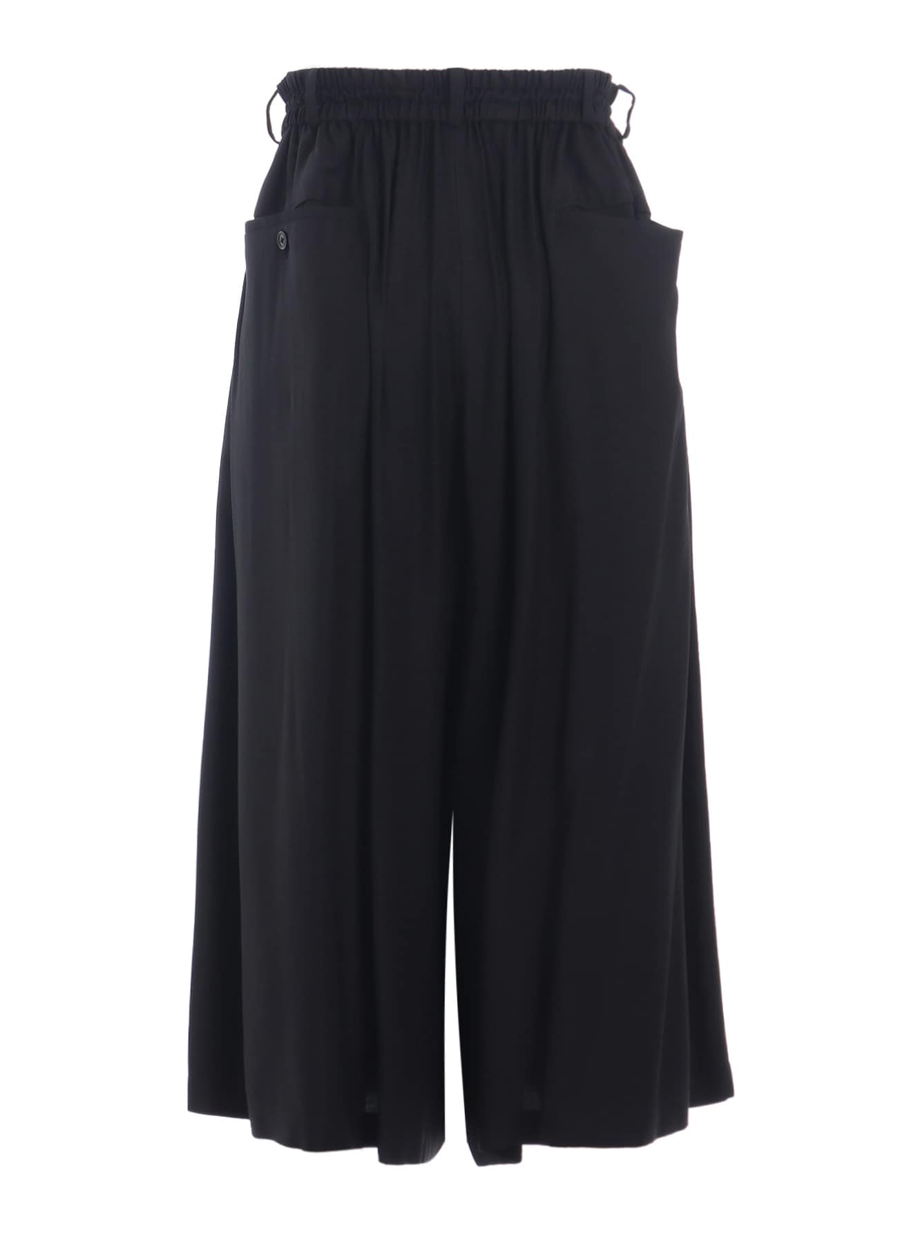 滑らかで肌馴染みの良い質感、光沢のある美しいドレープ感が特徴のレーヨンツイルで仕立てたキュロットパンツ。スカートとパンツを共有するガウチョワイドシルエットで最もイージーに”らしさ”を出せる丈とボリュームが魅力。とろみのあるシャツやカットソーと親和性が高く、風に靡く布地の美しさ、動きとともに刻々と変化するシルエットを楽しめるのはこの生地ならでは。季節に合わせブーツ、スニーカー、サンダルと足元をアレンジできる万能なレングス設定。着合わせを選ばないシンプルな形はコーディネートバリエーションに富み、夏に最適解な涼やかなブラックスタイルに重宝する。