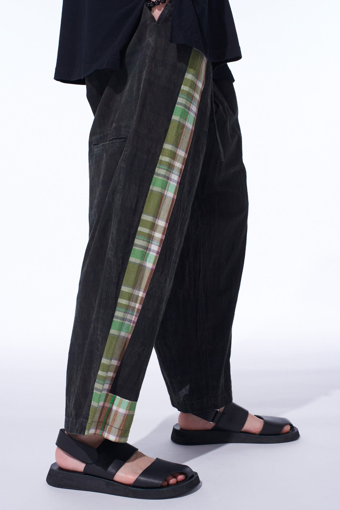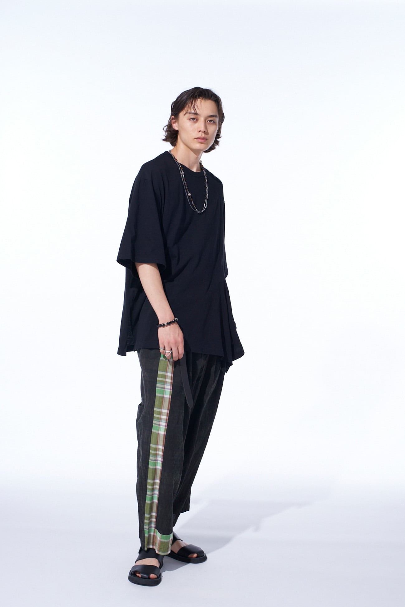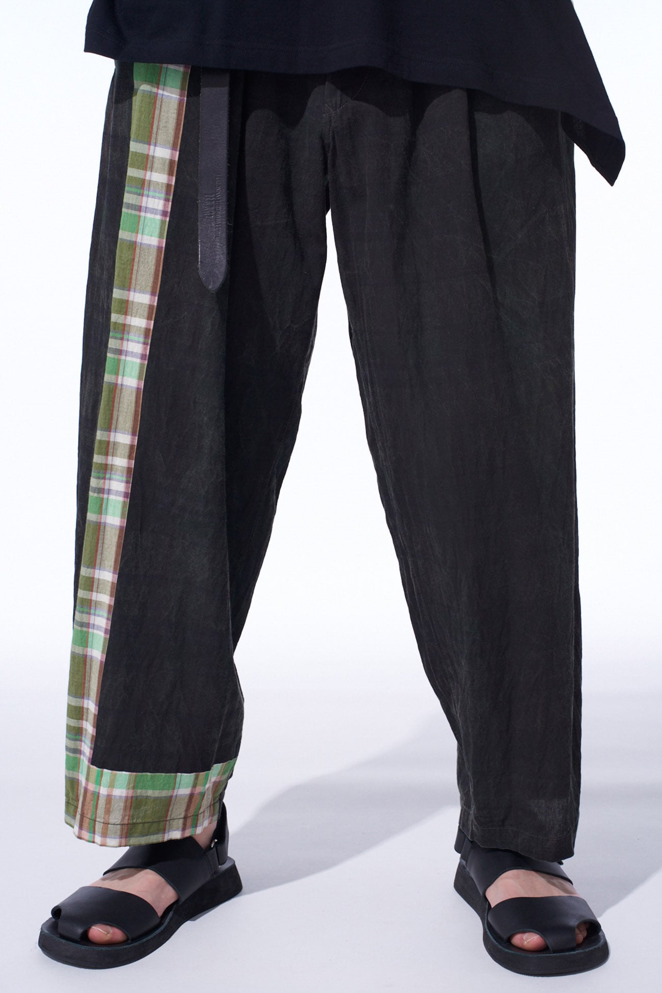 インド南東部のマドラス地方(現チェンナイ)で伝統的な技法により生産されているマドラスチェック生地に顔料プリントをのせ、ランダムにチェック柄を覗かせた3タックワイドパンツ。涼しげなゆとりと軽さのある生地、仕立てで、動くたびに風に靡く軽やかなシルエットが魅力。裾をロールアップしてチェック柄を覗かせるアレンジも楽しめる。右脇の位置に作ったさりげない両玉縁ポケットもユニークな遊び心。着用を続けることで顔料が落ちてゆき独特な風合いへと変化するエイジングを楽しめる。※本製品はインド製手織りのためネップなどナチュラルな傷が見られます。※加工の特性上、発汗、水濡れ、摩擦により色落ち・色移りが発生する場合がございます。※製品洗い加工のため風合いに個体差がございますことをご了承の上お買い求めください。