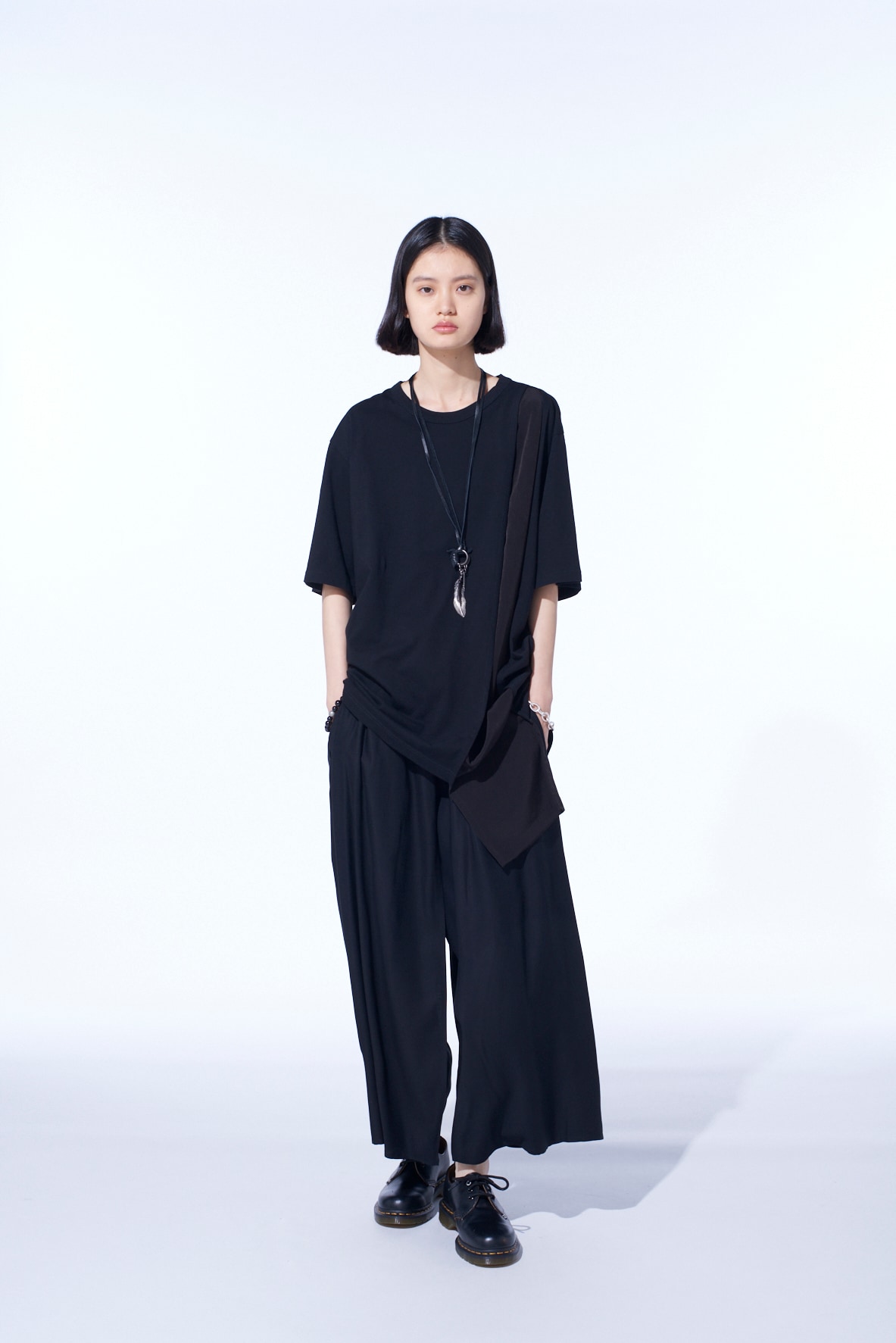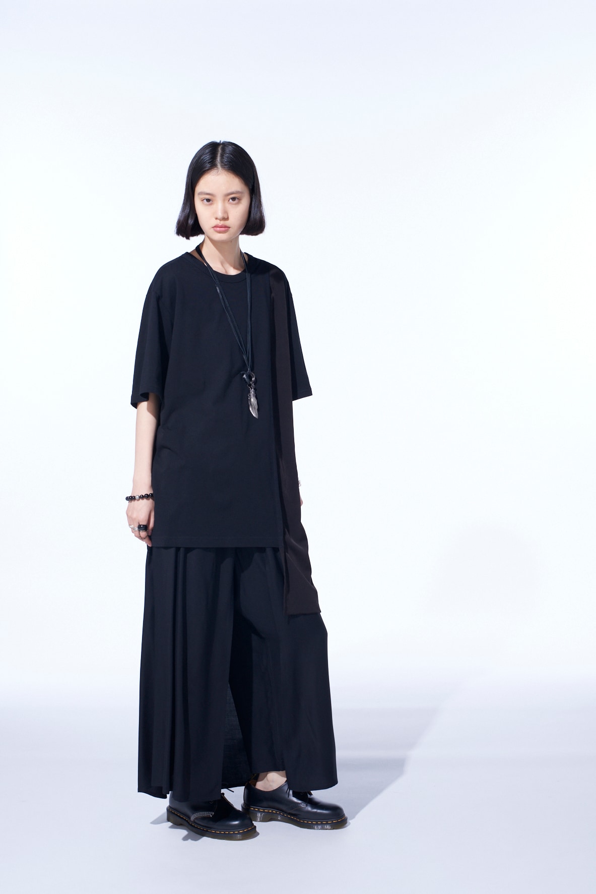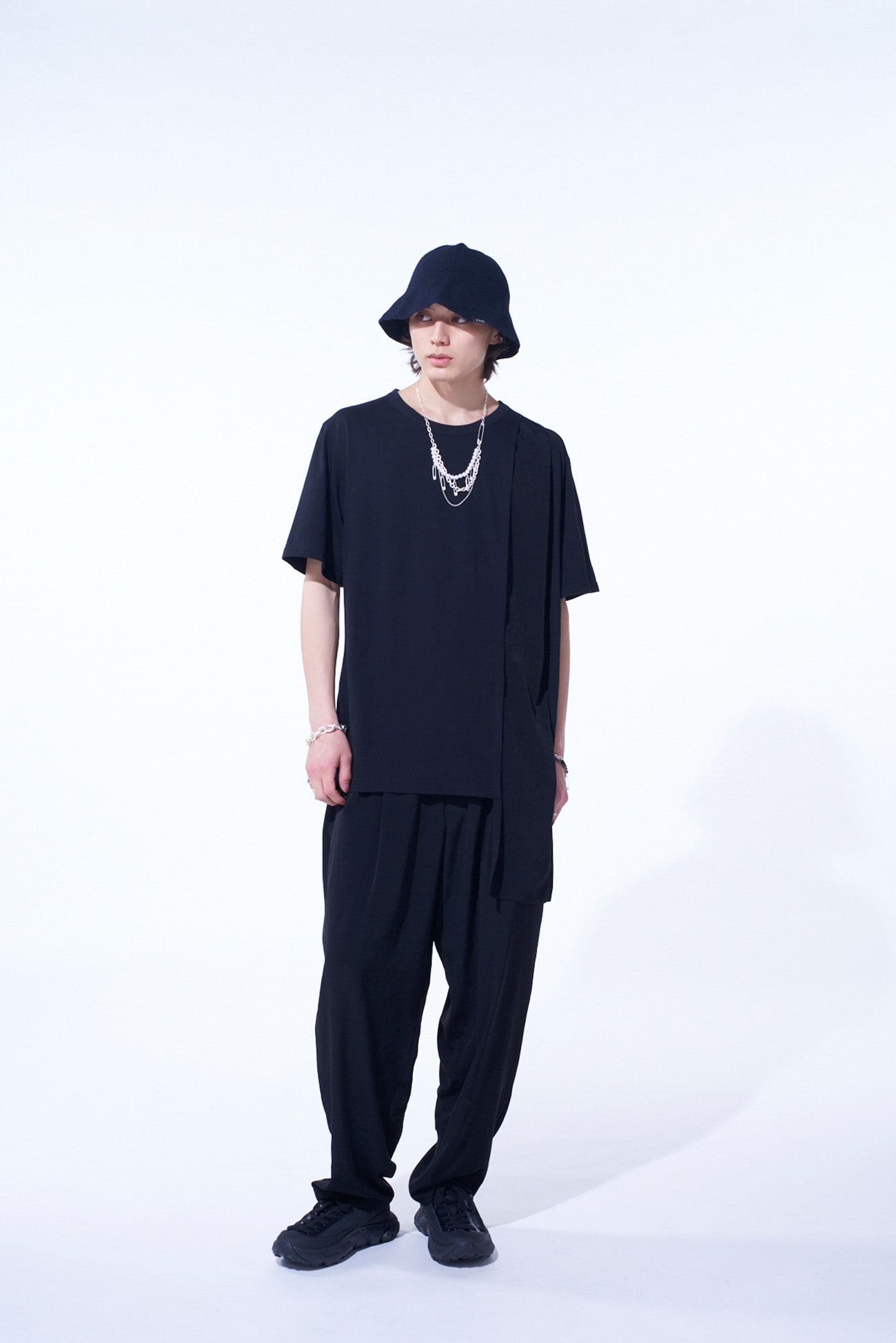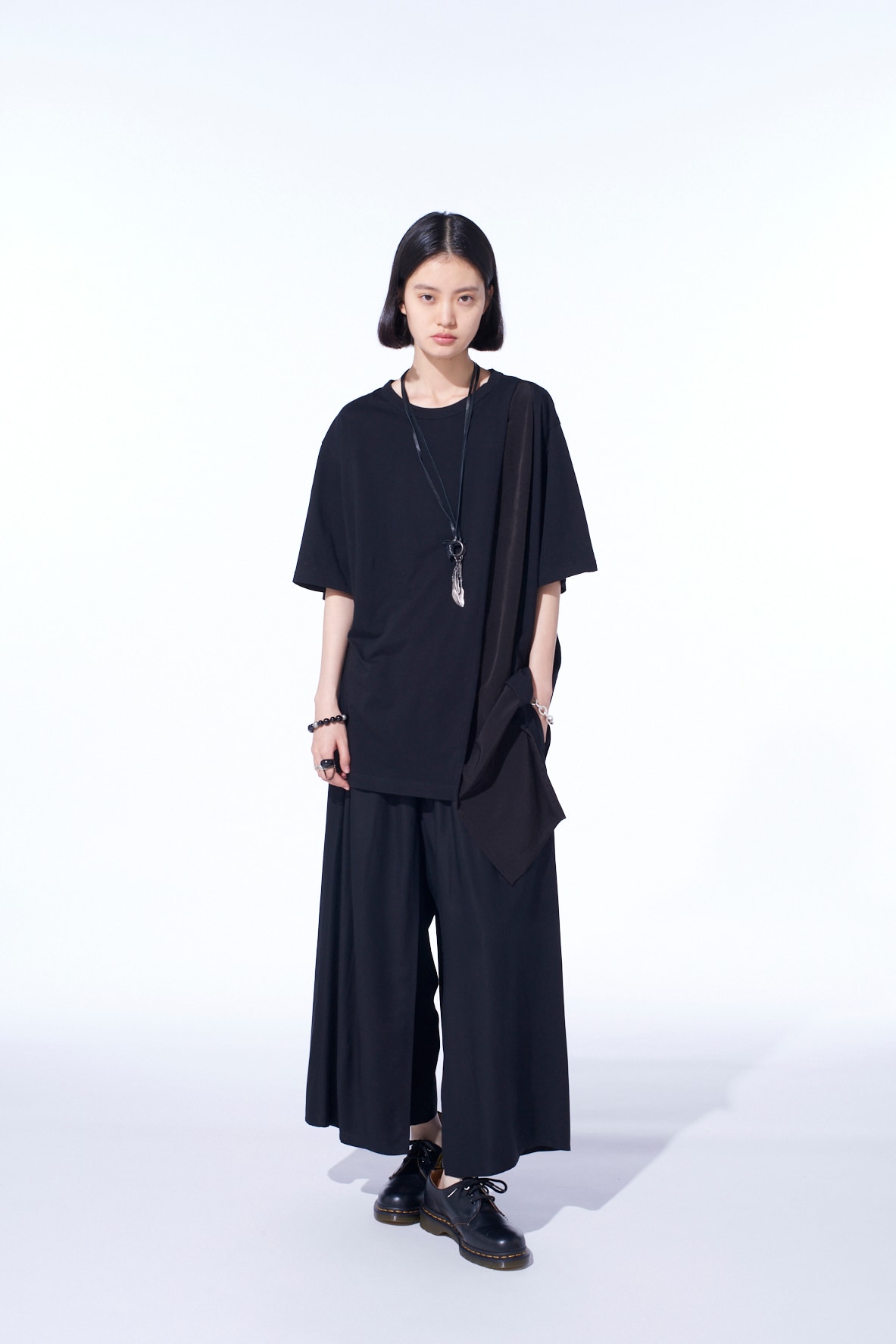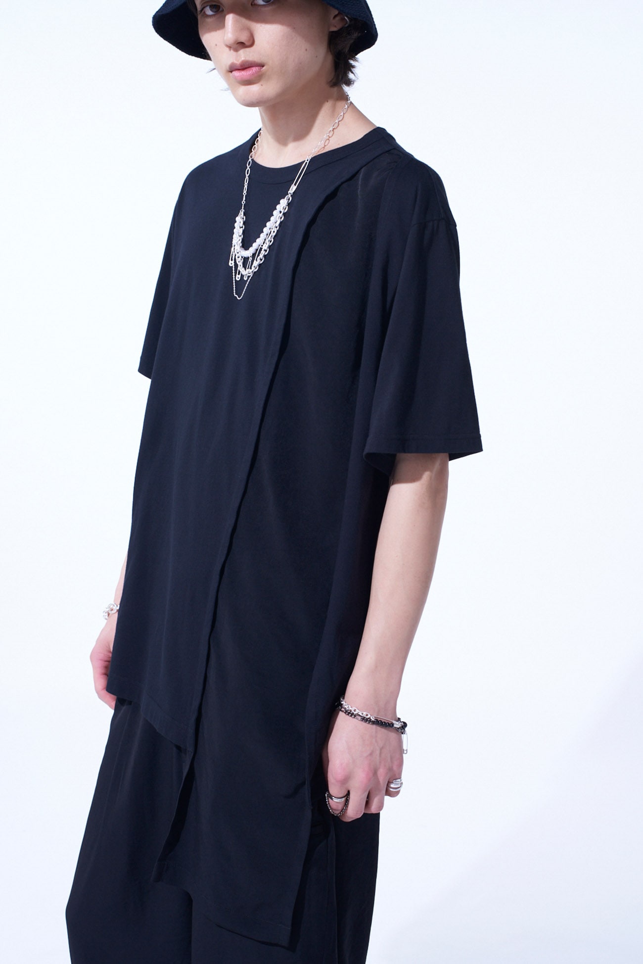 艶やかな光沢を持つクレープ・デシンを左前身頃の肩から裾に向かいフレアするよう縫製したアシンメトリーカットソー。その特徴的なデザインはブラックコーディネートへのアクセントとして、レイヤードでも1枚でも存在感を発揮。長めの着丈を生かしショート丈のアウターや羽織物とのレイヤード、変形デザインパンツとのコンビネーションを楽しめる。ソフト天竺は型崩れしにくく扱いやすい、デイリーに着用するのに相応しい安定性と機能性を持つ。