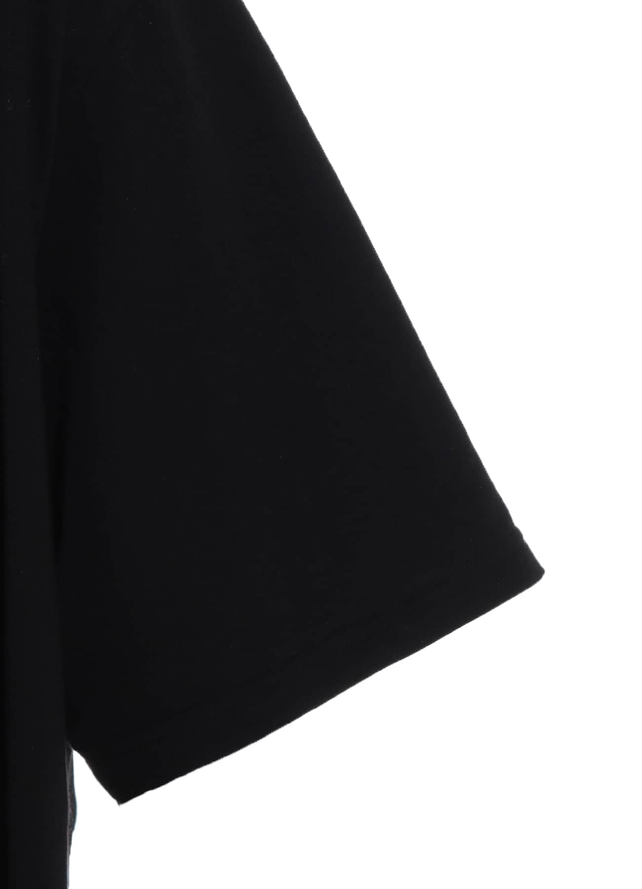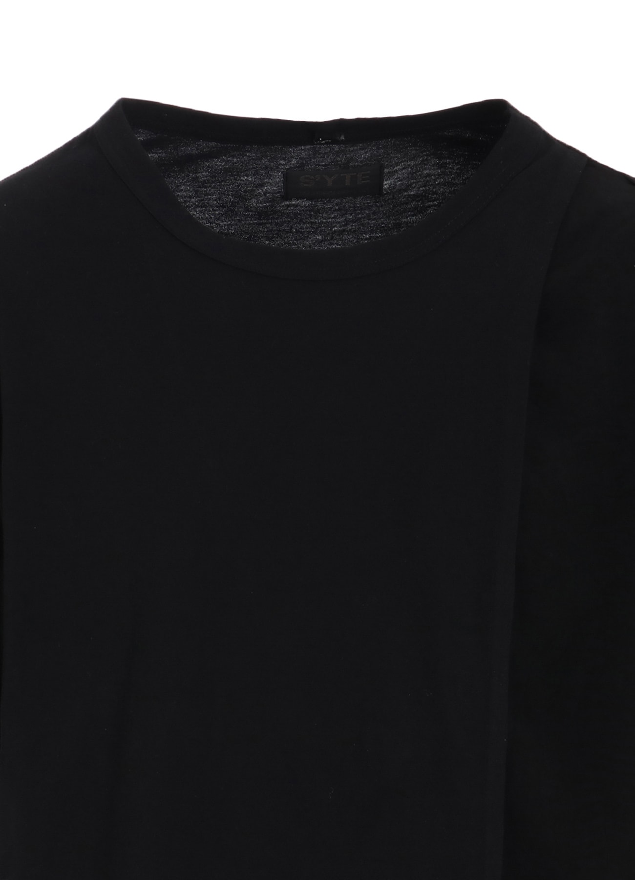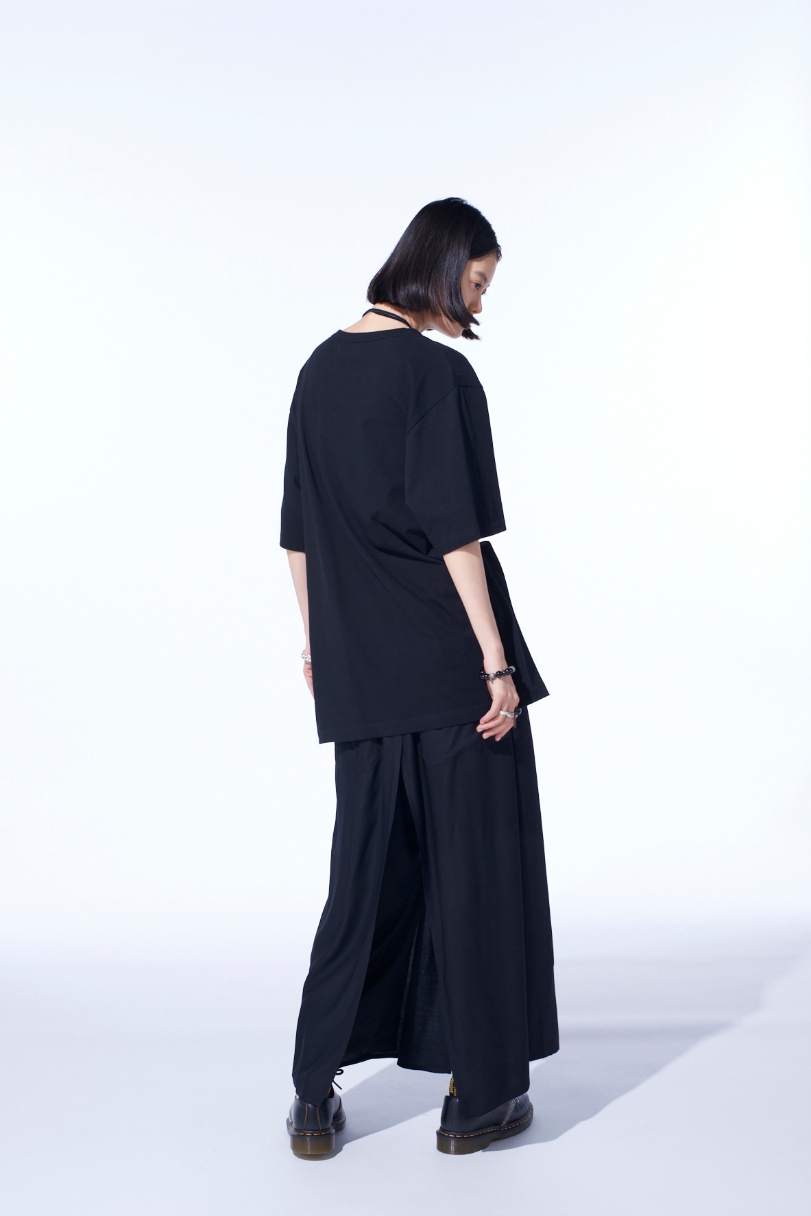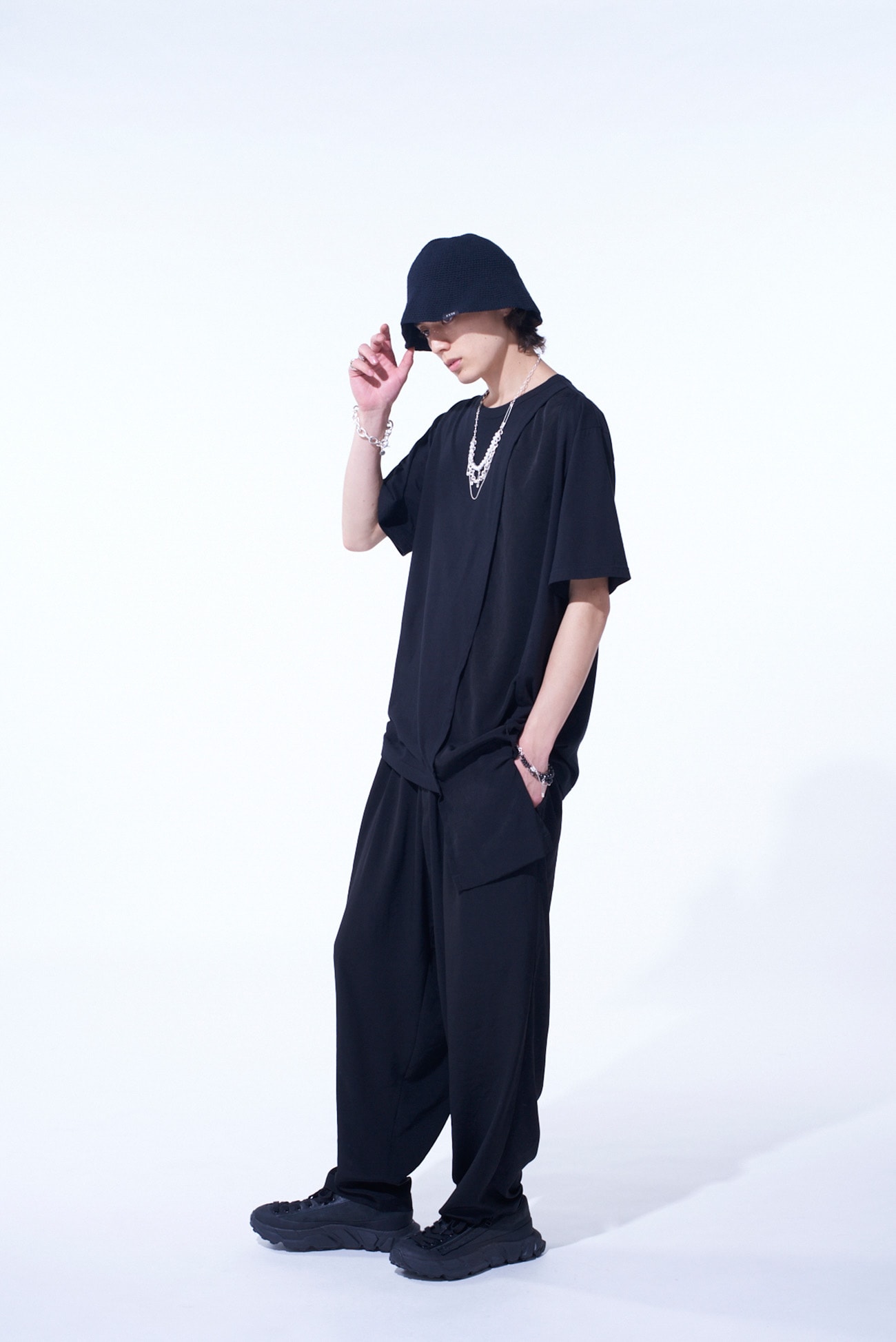 艶やかな光沢を持つクレープ・デシンを左前身頃の肩から裾に向かいフレアするよう縫製したアシンメトリーカットソー。その特徴的なデザインはブラックコーディネートへのアクセントとして、レイヤードでも1枚でも存在感を発揮。長めの着丈を生かしショート丈のアウターや羽織物とのレイヤード、変形デザインパンツとのコンビネーションを楽しめる。ソフト天竺は型崩れしにくく扱いやすい、デイリーに着用するのに相応しい安定性と機能性を持つ。
