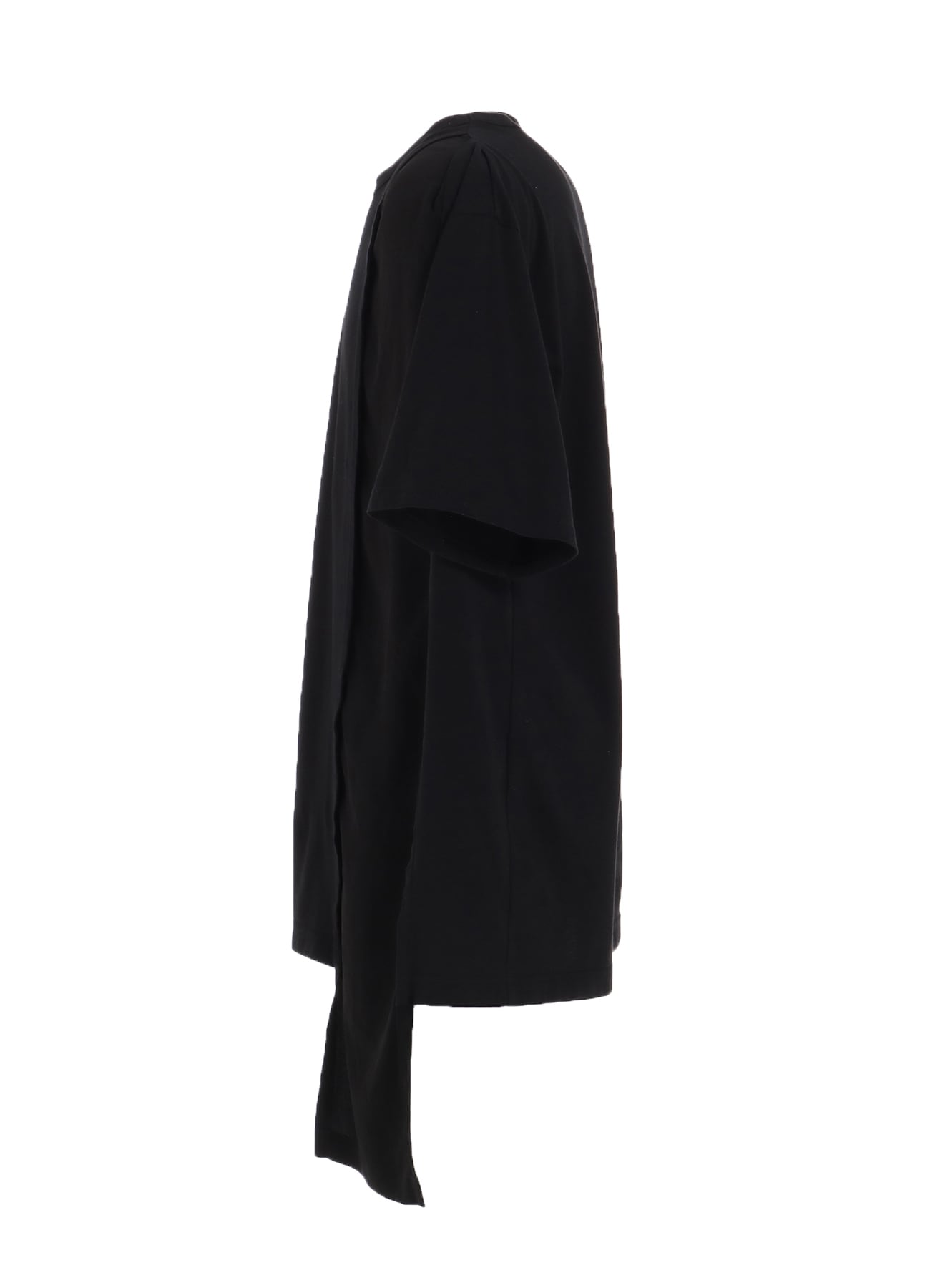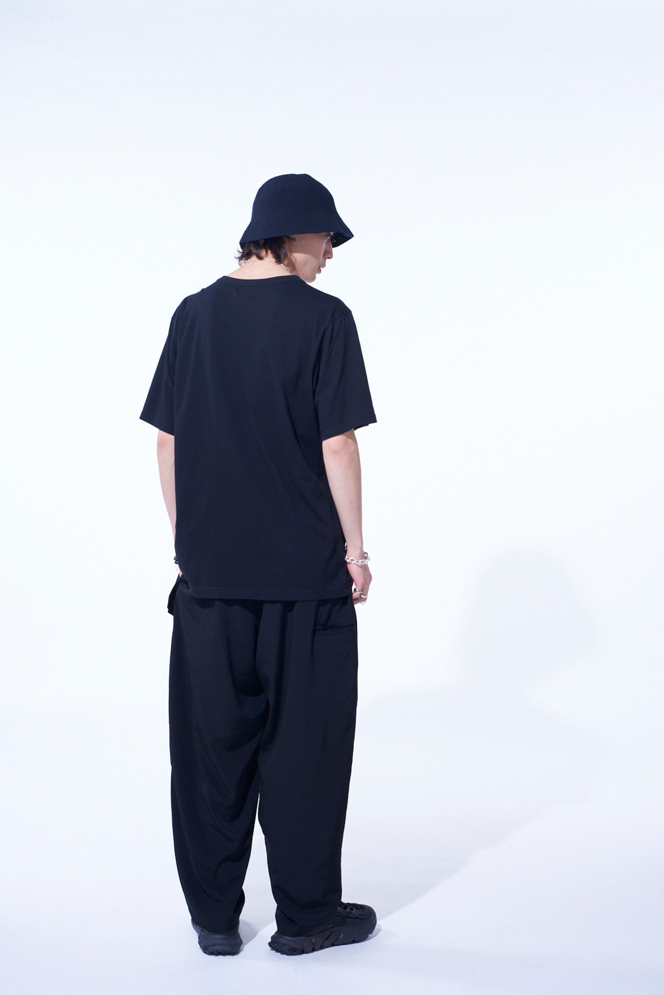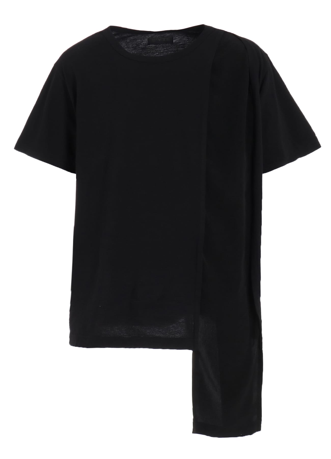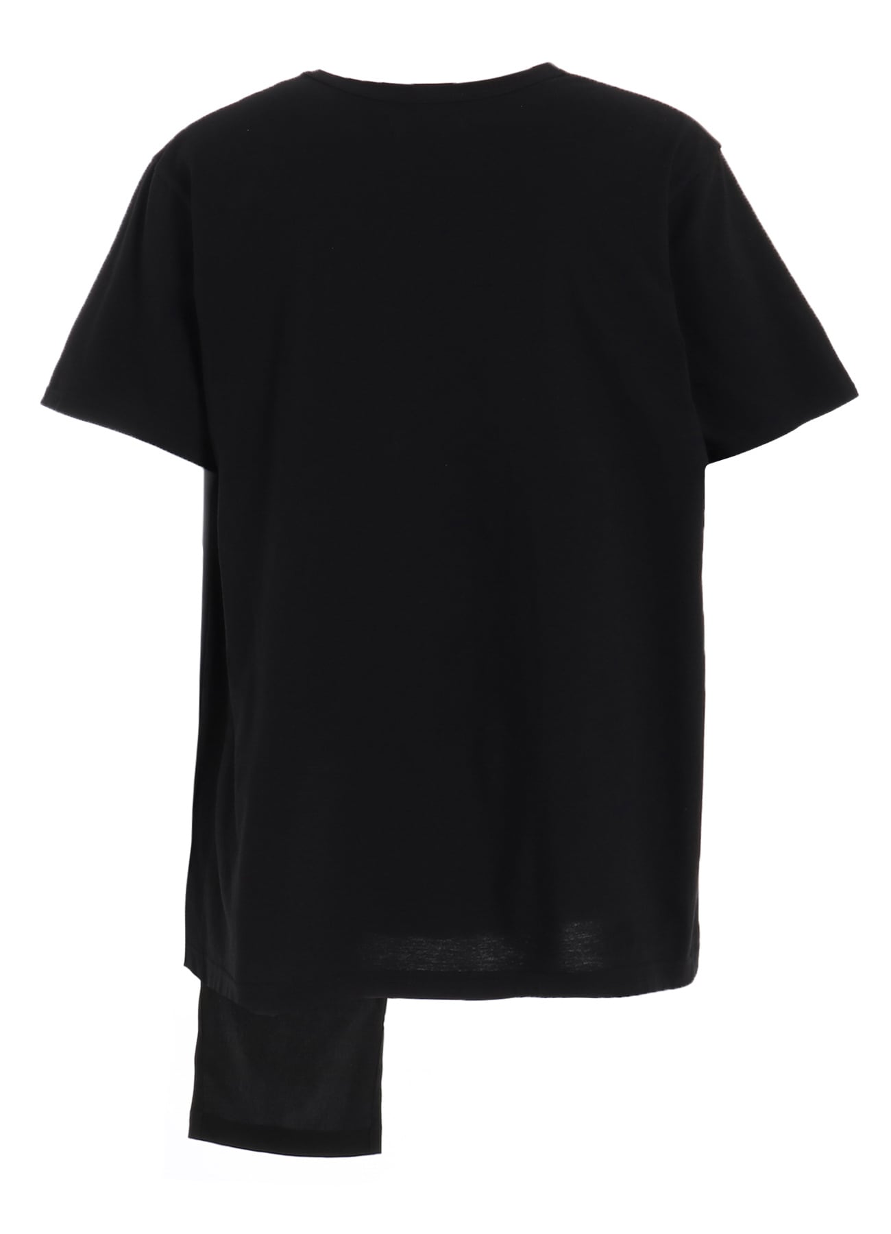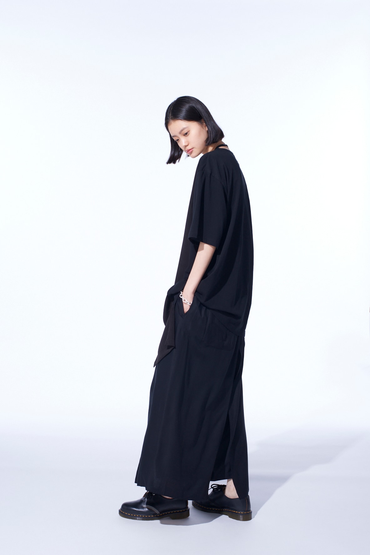 艶やかな光沢を持つクレープ・デシンを左前身頃の肩から裾に向かいフレアするよう縫製したアシンメトリーカットソー。その特徴的なデザインはブラックコーディネートへのアクセントとして、レイヤードでも1枚でも存在感を発揮。長めの着丈を生かしショート丈のアウターや羽織物とのレイヤード、変形デザインパンツとのコンビネーションを楽しめる。ソフト天竺は型崩れしにくく扱いやすい、デイリーに着用するのに相応しい安定性と機能性を持つ。