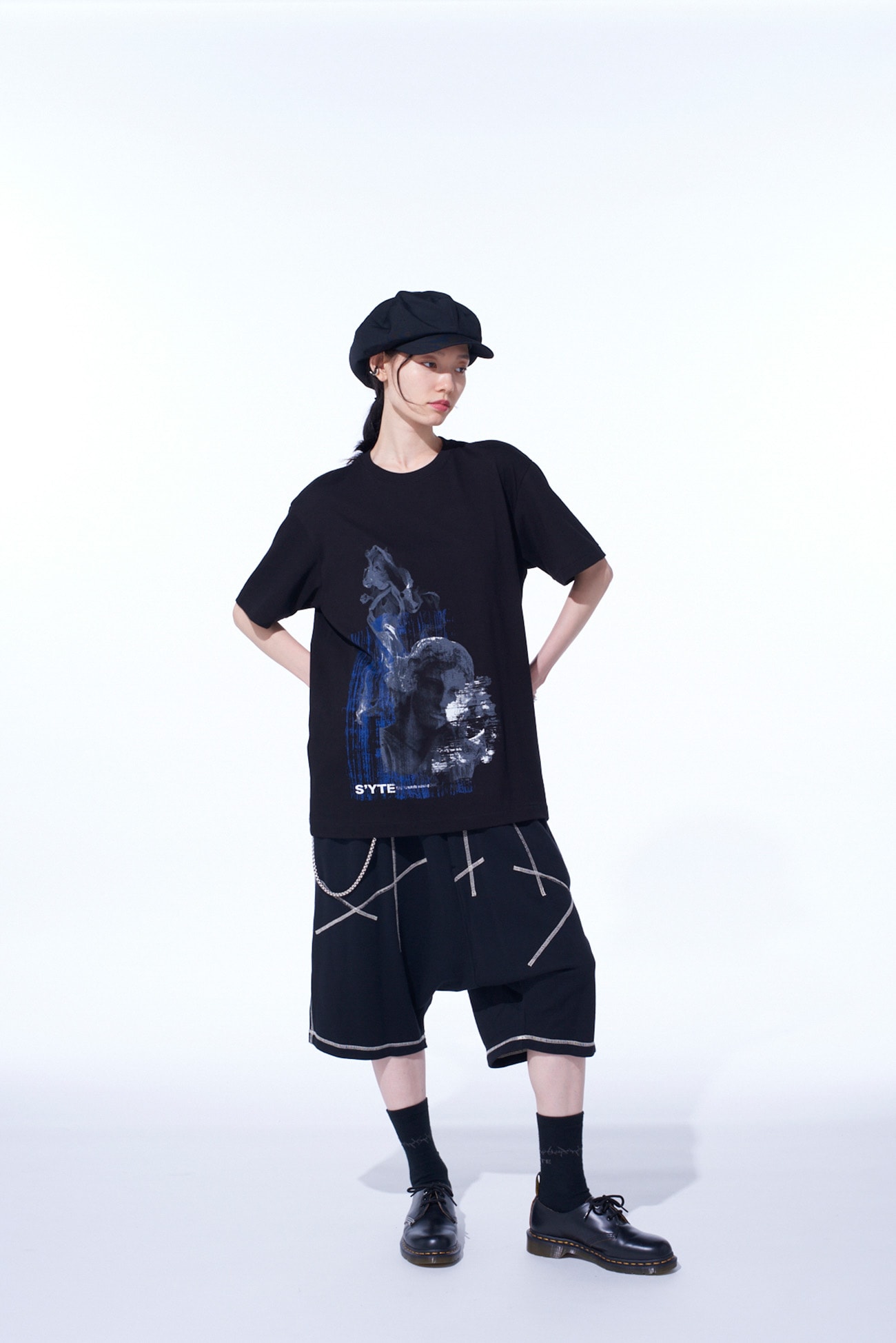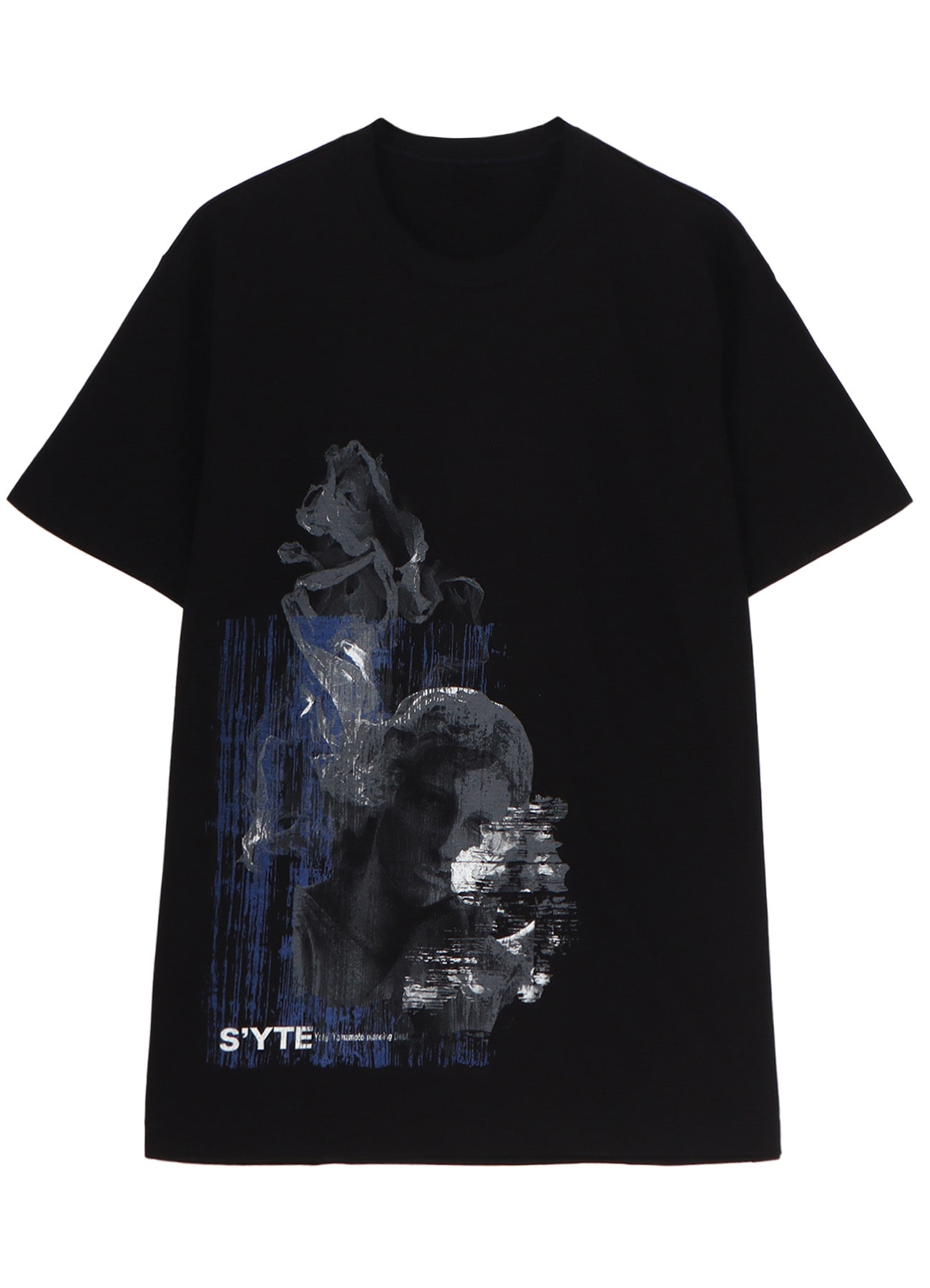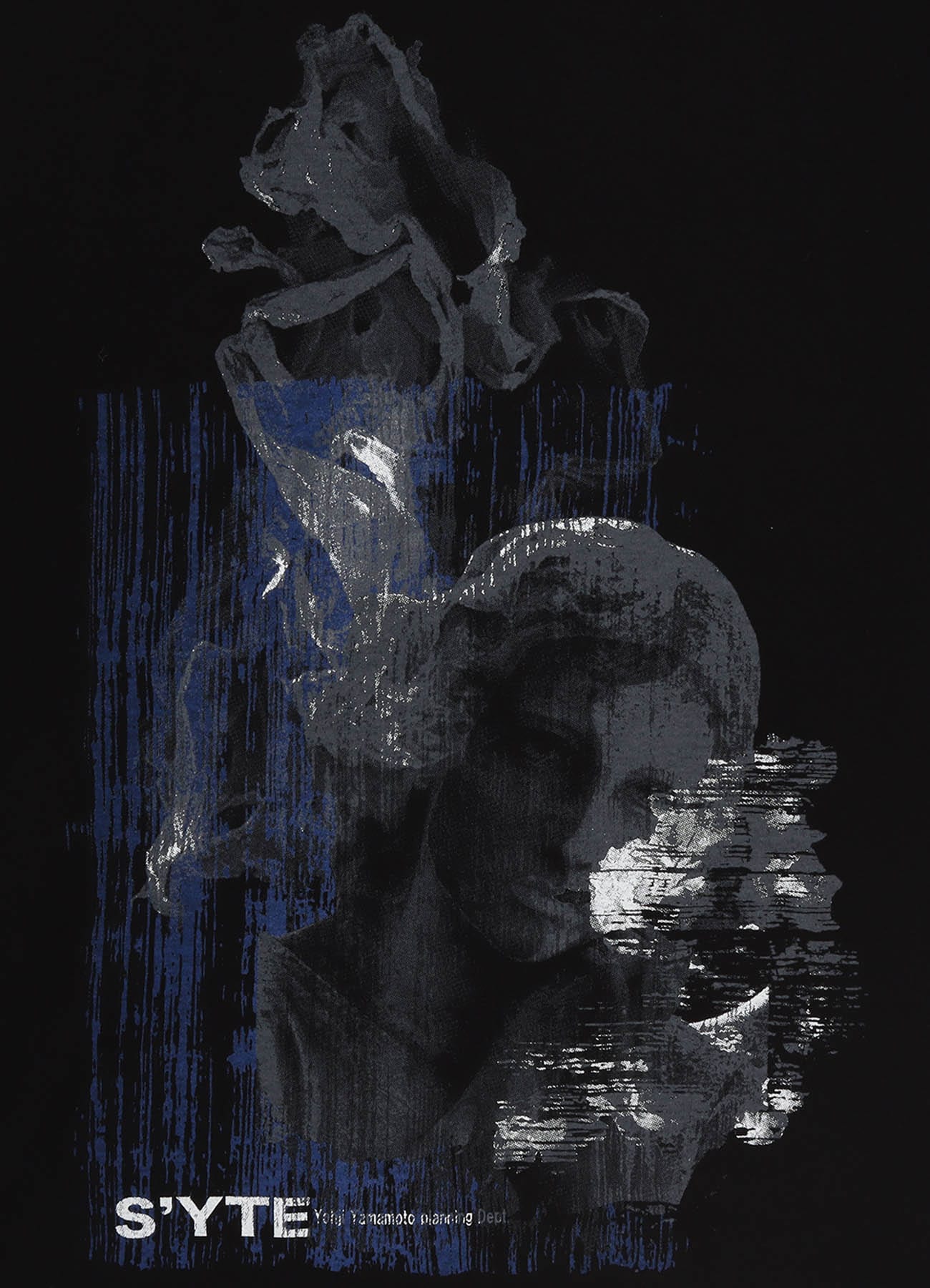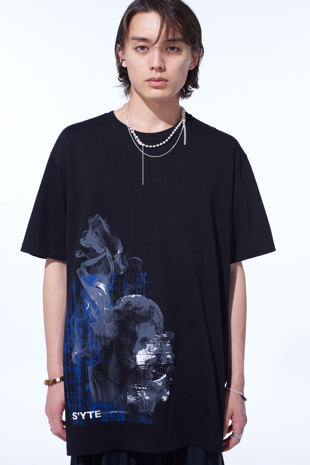 S'YTEブランドスタート初期から協業を続ける久米繊維との別注ボディを使用したグラフィックカットソー。退廃的な彫刻モチーフのグレイッシュグラフィックにブルーが色挿すアートな世界観は1枚での着用はもちろんのこと、羽織物のインナーとしても活きるグラフィックデザイン。脇に縫い目の無い丸胴編みならではの着心地の良さを体感でき、Sサイズはレディースもしくはジャストフィット。Mサイズはゆったり目のサイズ感にて男性には程よいサイズ感と女性にはビックT感覚。LサイズはトレンディなスペシャルXXL的オーバーサイズを提案。袖のロールアップやタックインでのスタイリングアレンジもおすすめ。メンズモデル着用サイズ:Lサイズレディースモデル着用サイズ:Mサイズ※久米繊維業株式会社(KUME SEN-I Co.,Ltd.)日本製・国産Tシャツメーカー 80年以上の歴史を誇る老舗メイド・イン・ジャパンTシャツの原点。優れた技術を持つ紡績会社の手で紡がれ、国内で丁寧に編まれた生地は肌触りに優れるだけでなく耐久性も兼ね備えています。また、袖口、裾部分の縫製に、あえて天地引きを多用するのも数あるこだわりの中の一つ。このTシャツ着脱時の瞬間の強い引っ張りに耐える縫製方法により、ホツレ、糸切れの可能性を低減し、永年の着用に応えています。