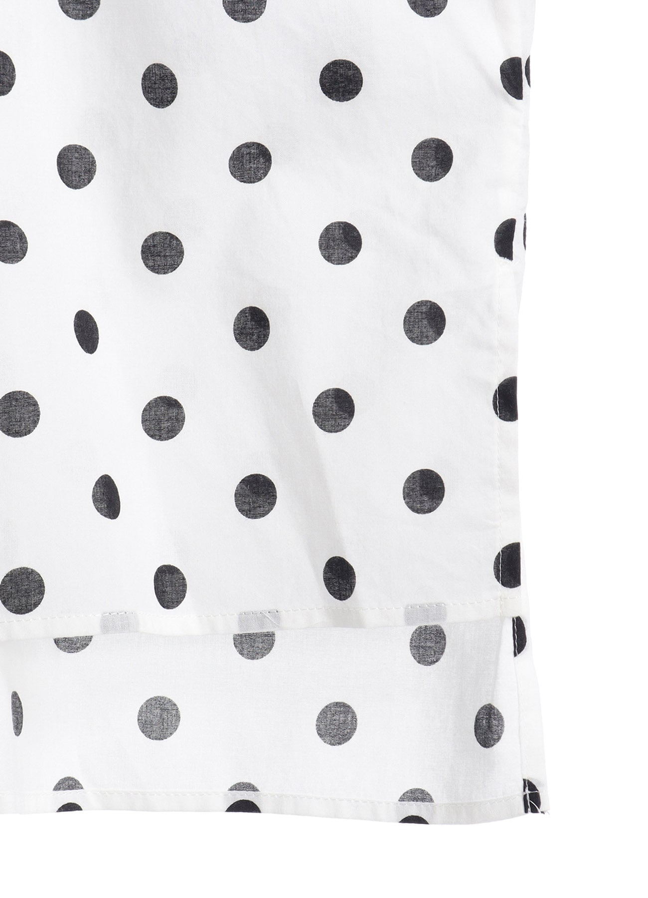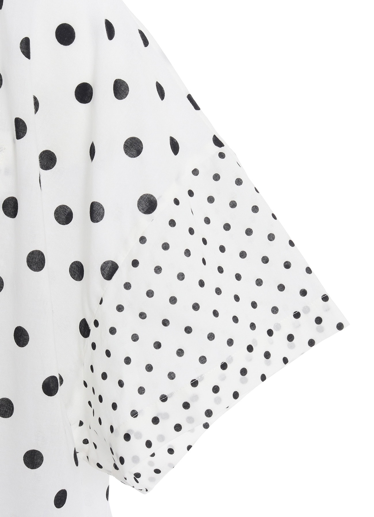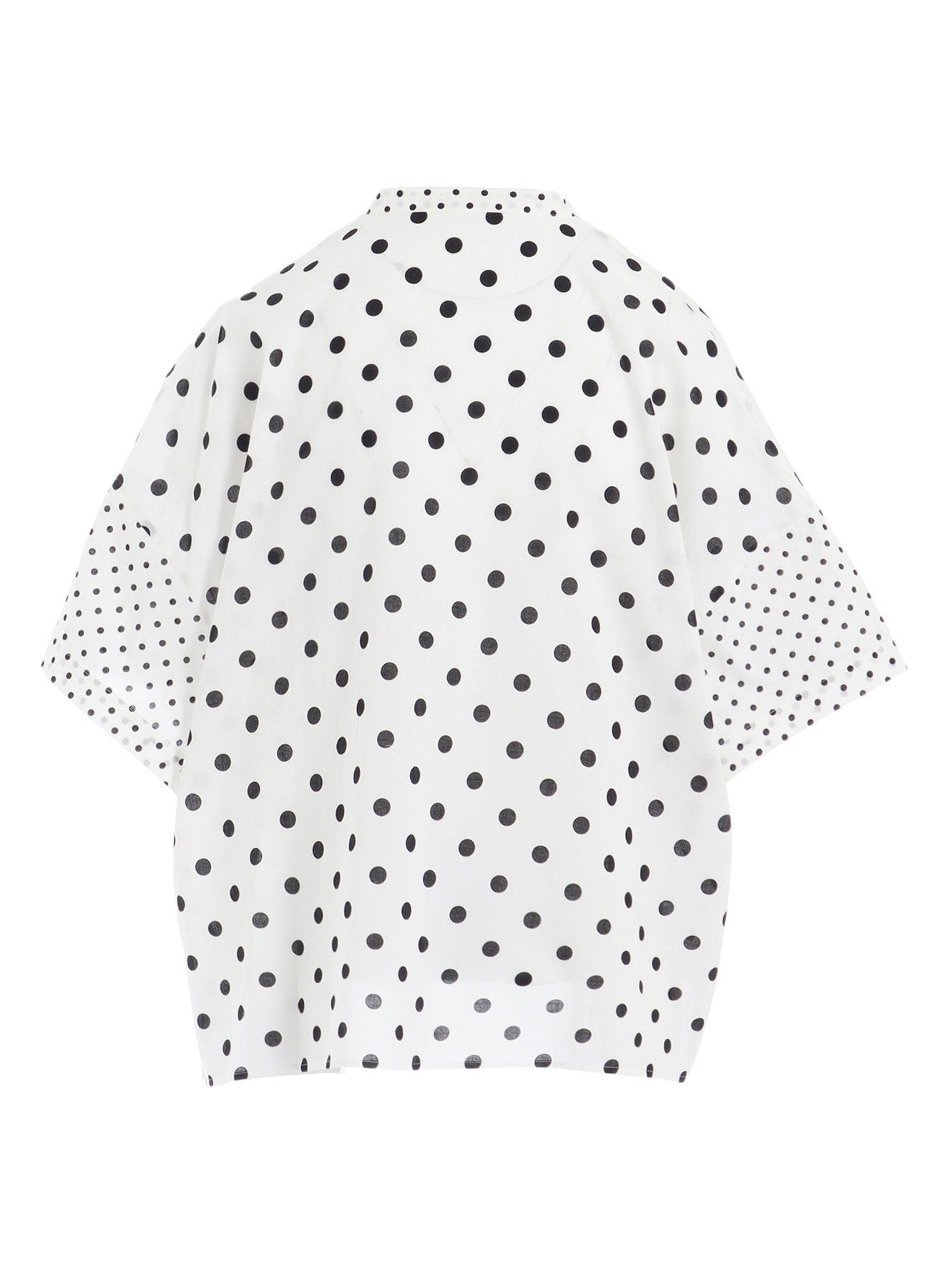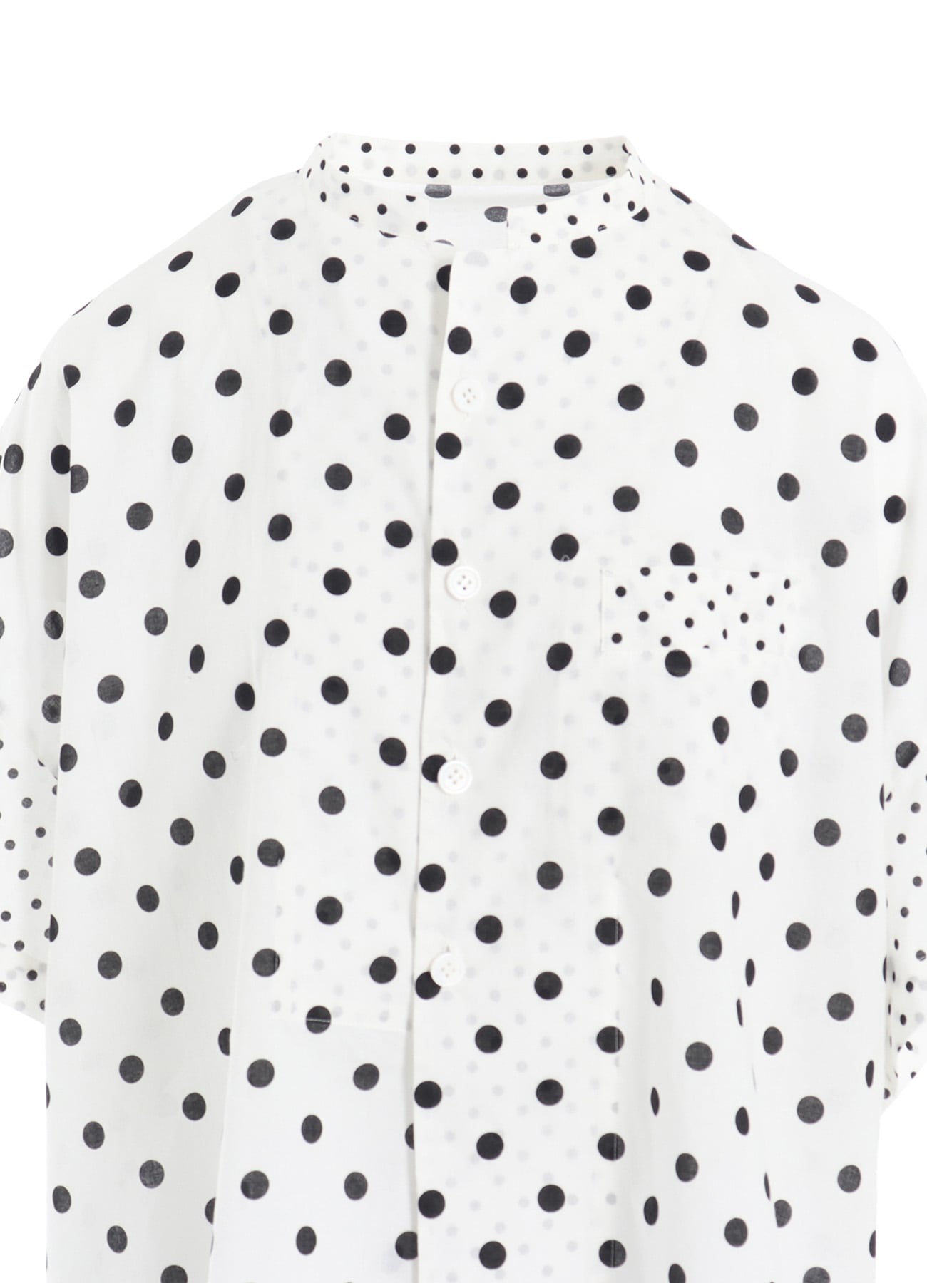様々な大きさのドット柄生地を組み合わせた、ボックスシルエットのスタンドカラーシャツ。サイズの異なるドット柄を組み合わせることでシンプルなパターンにユニークな表情がプラスされます。コンパクトな丈感で、分量感のあるボトムともバランスよくお召しいただけます。さらりとした滑らかな肌触りのローン生地は、汗ばむ時期にも快適にお召しいただけます。