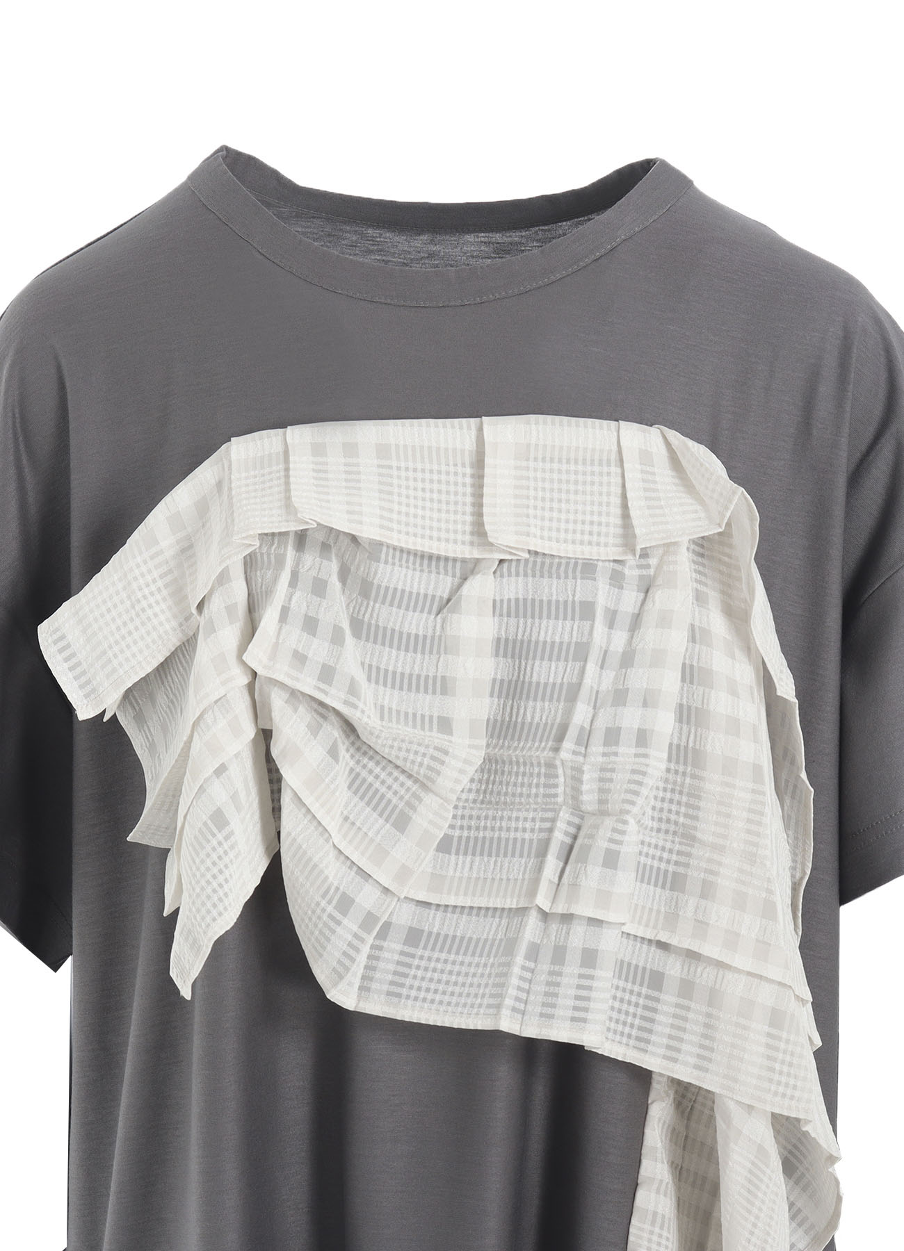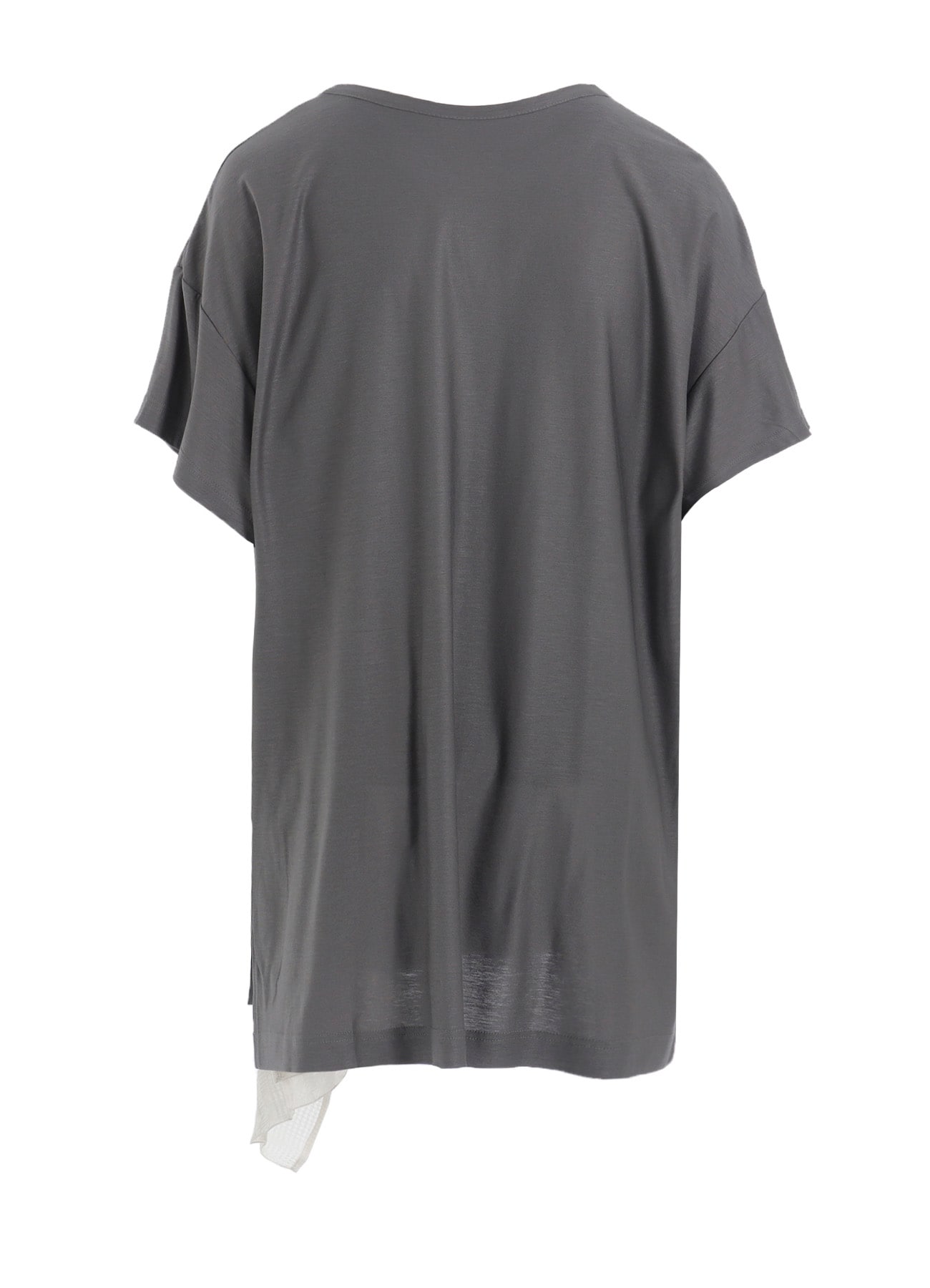 半袖ロング丈カットソ―。流れるように大胆にデザインされた布がポイント。1枚でも存在感のあるデザインカットソーです。