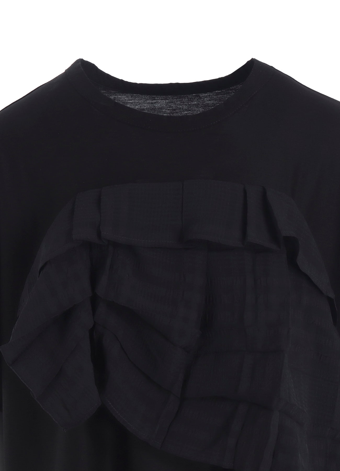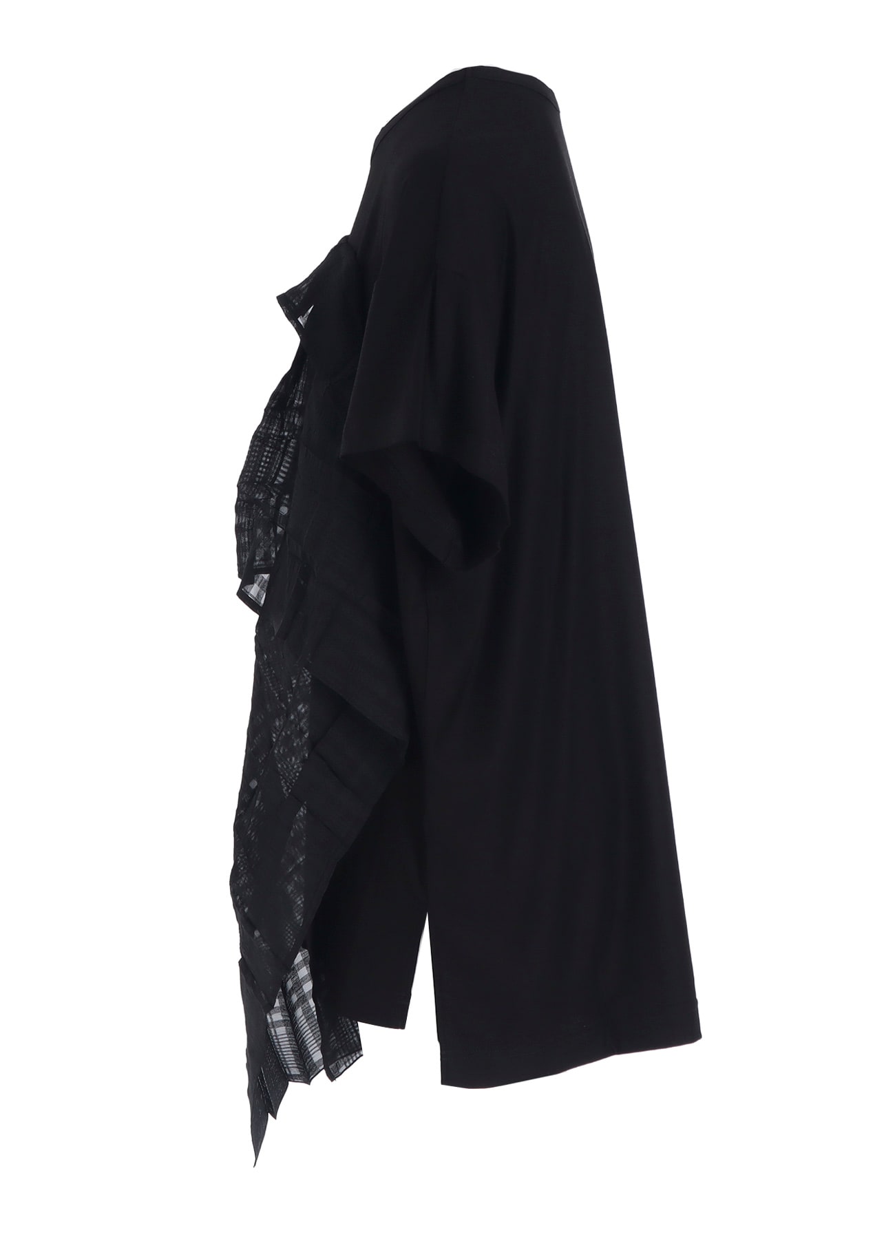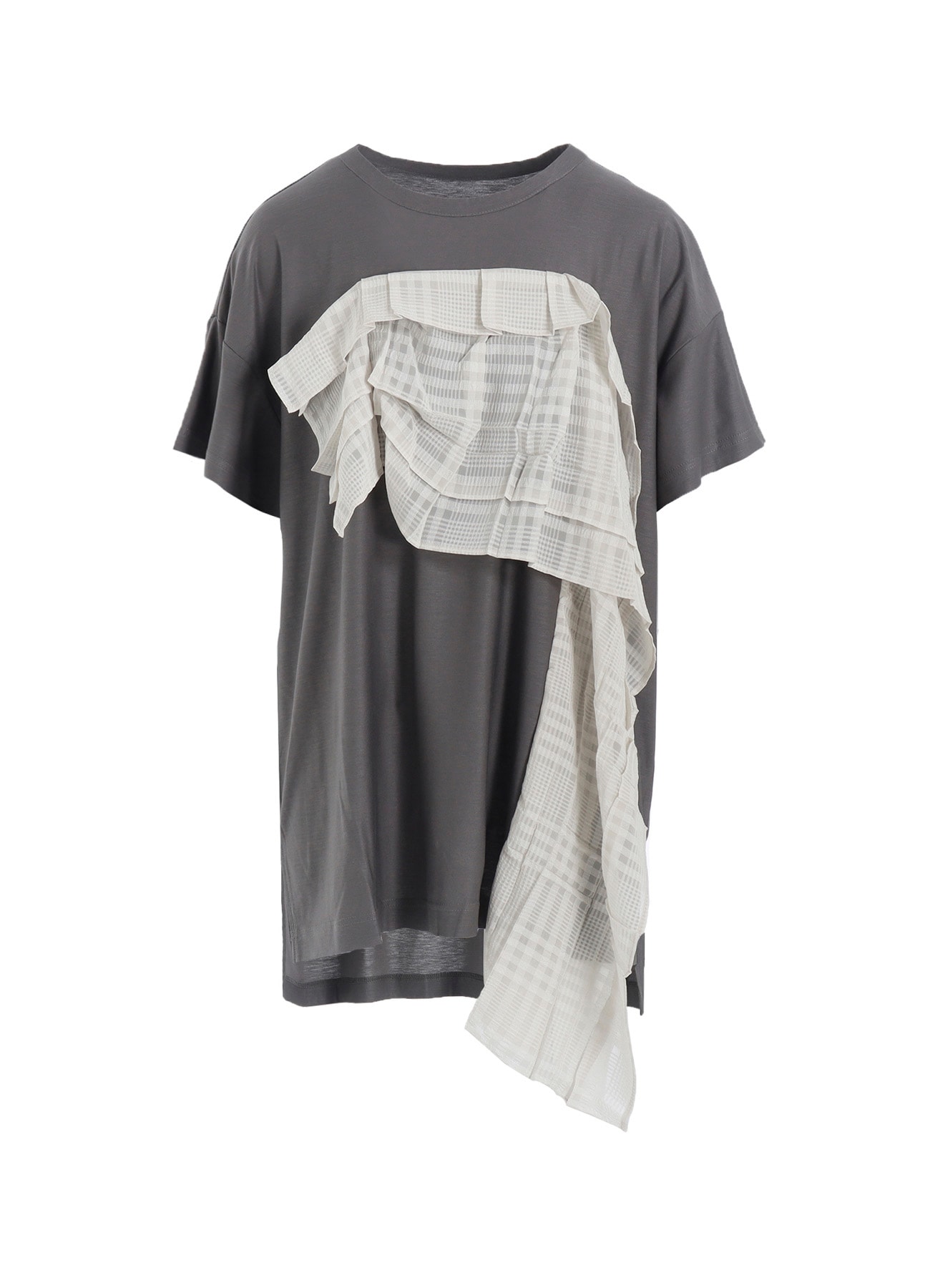 半袖ロング丈カットソ―。流れるように大胆にデザインされた布がポイント。1枚でも存在感のあるデザインカットソーです。