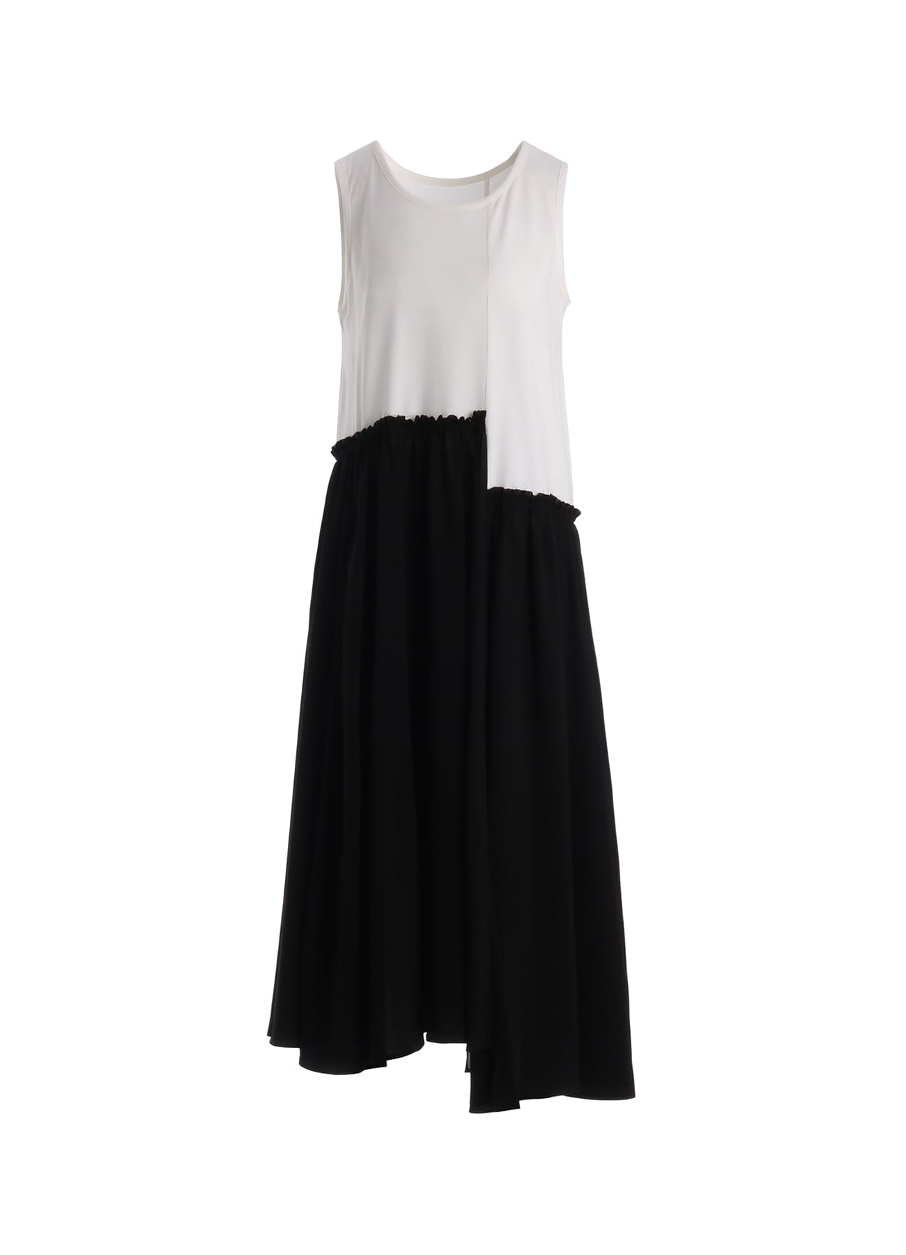 ノースリーブドレス。Tシャツにティアードスカートを組み合わせたようなデザイン。スカート部分はストレッチ性のあるトリアセテート・ポリエステル生地を使用しています。