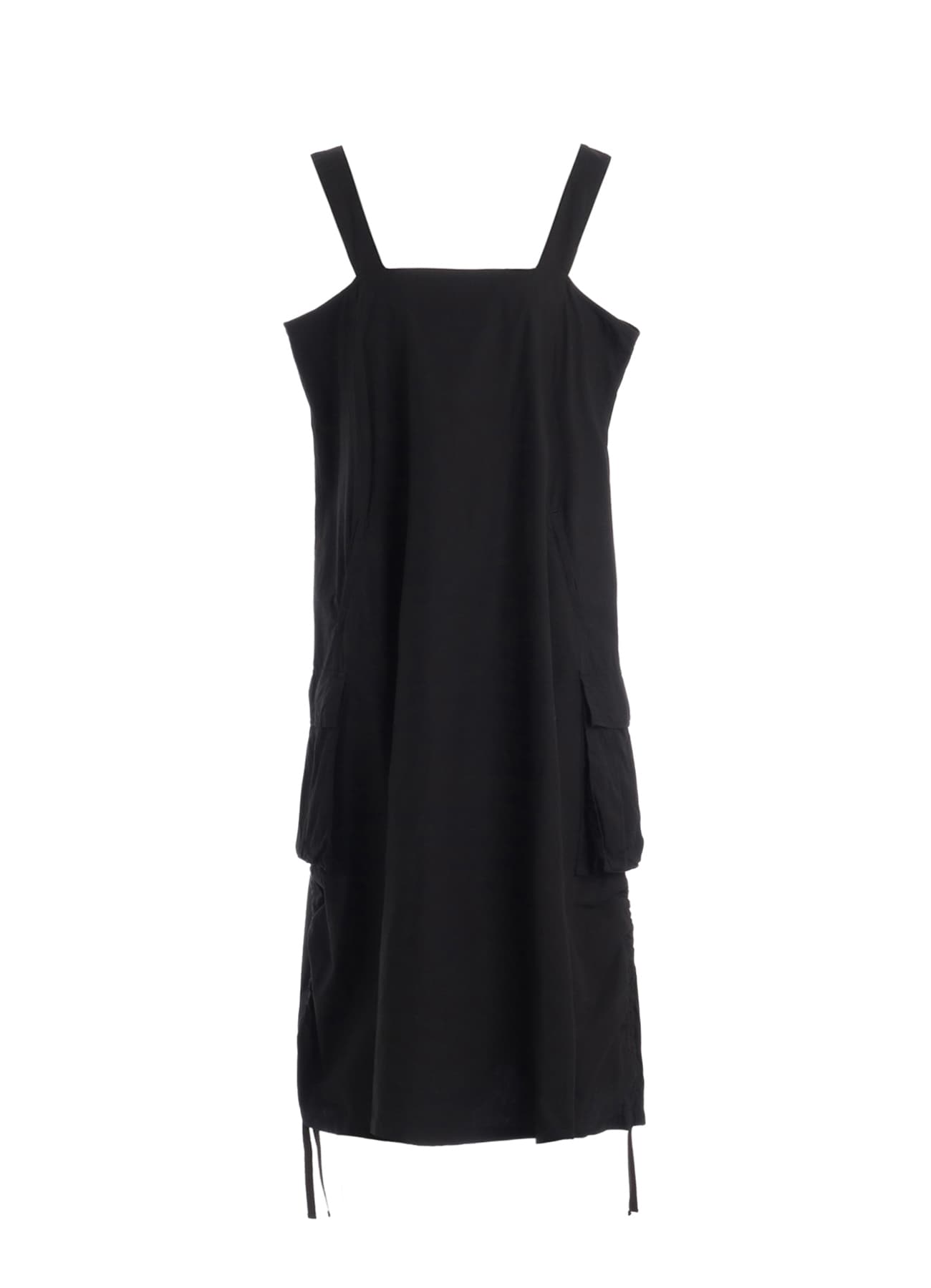 タイプライター生地のシャーリングドレス。薄手ながら透け感はなく、なめらかで張りのある風合いです。製品の状態で染めを加工をしています。サイドのシャーリングやポケットのデザインがポイント。