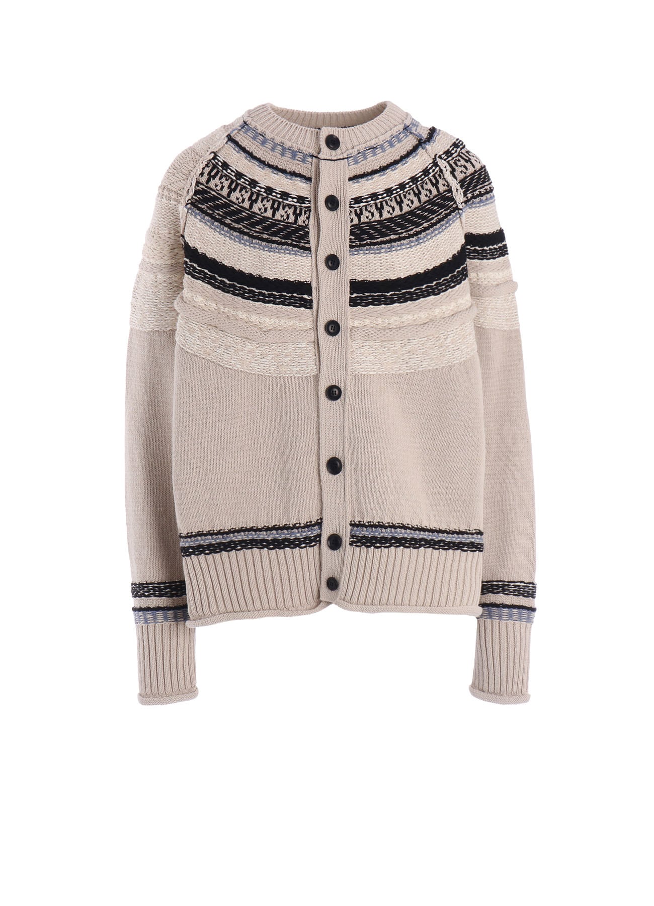 異素材を組み合わせたフェアアイル柄ニットカーディガン。それぞれ風合いの異なる天然素材の糸を使用し、立体感のある柄に仕上げています。隠れた「YS」の文字がさりげないポイント。