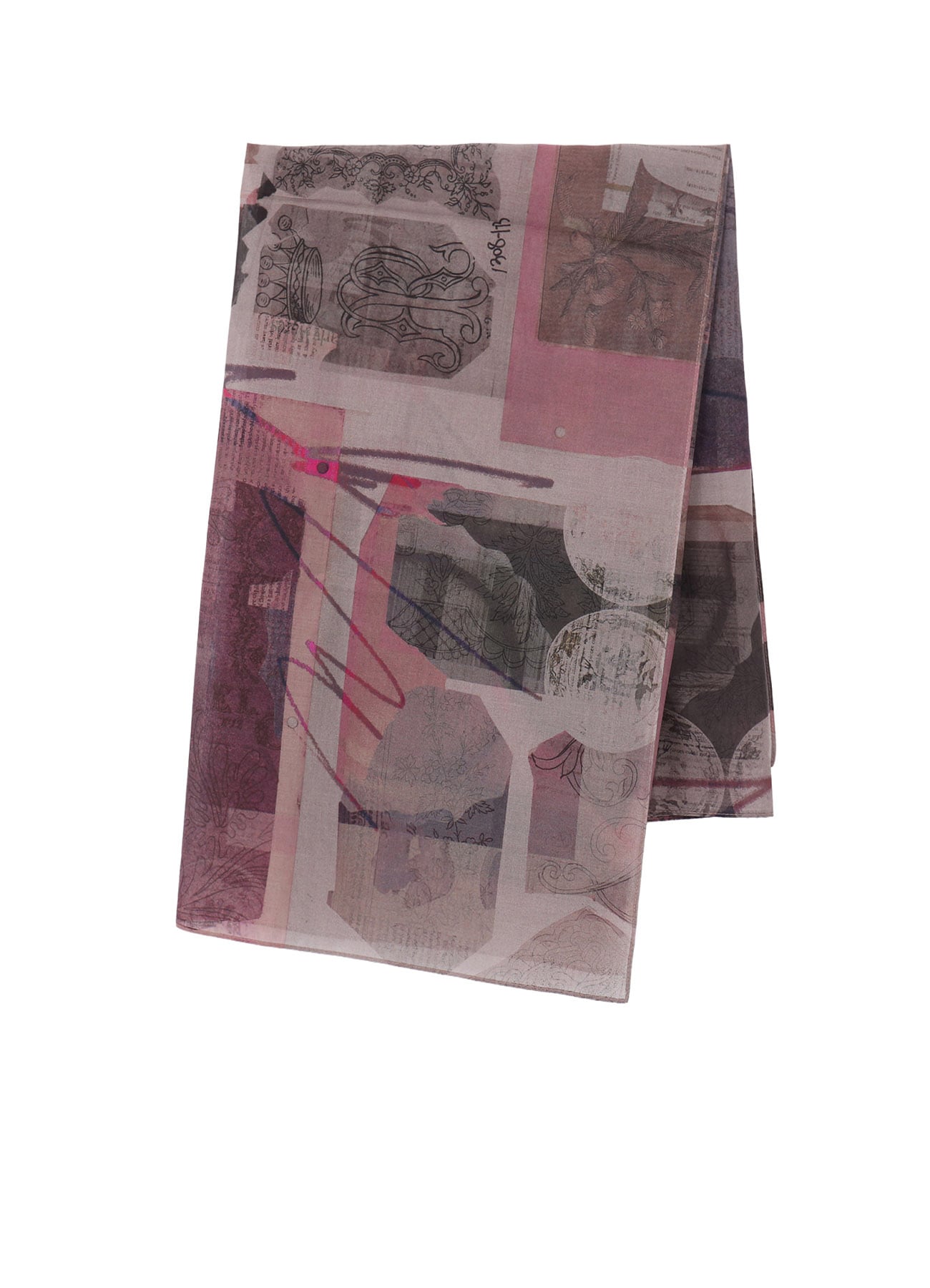 コットン素材のスカーフ。程よい透け感と清涼感のある風合い。アンティークの壺をモチーフにしたコラージュ風の柄。スタイリングに合わせて様々なアレンジをお楽しみいただけます。