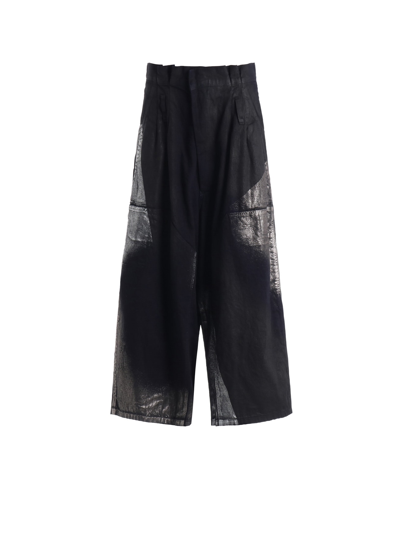箔をのせたデニム生地のハーフパンツ。スプレーで顔料をのせた上に手作業で箔をのせています。ウエストループをずらすことで独特のボリュームに仕上げています。手作業のため、ひとつひとつ個体差がございます。箔は経年により少しずつはがれてくる可能性がございます。デニム生地は色落ちする可能性がございます。他の衣類への色移りにご注意ください。