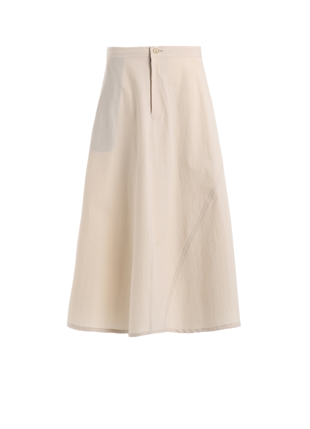 コットン素材のフレアスカート。洗いざらしのシワと柔らかなふくらみがポイント。後ろのボタンは開けてポケットにもなるユニークなデザイン。