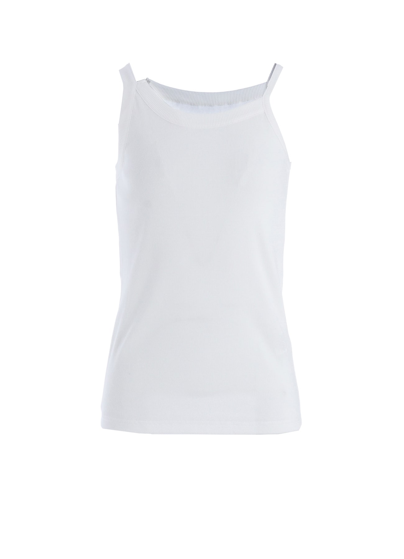 コットン素材のリブタンクトップ。すっきりとしたシンプルなシルエットにアシンメトリーなデザインのストラップがポイントに。
