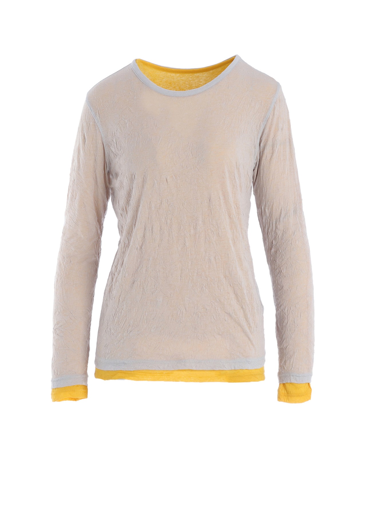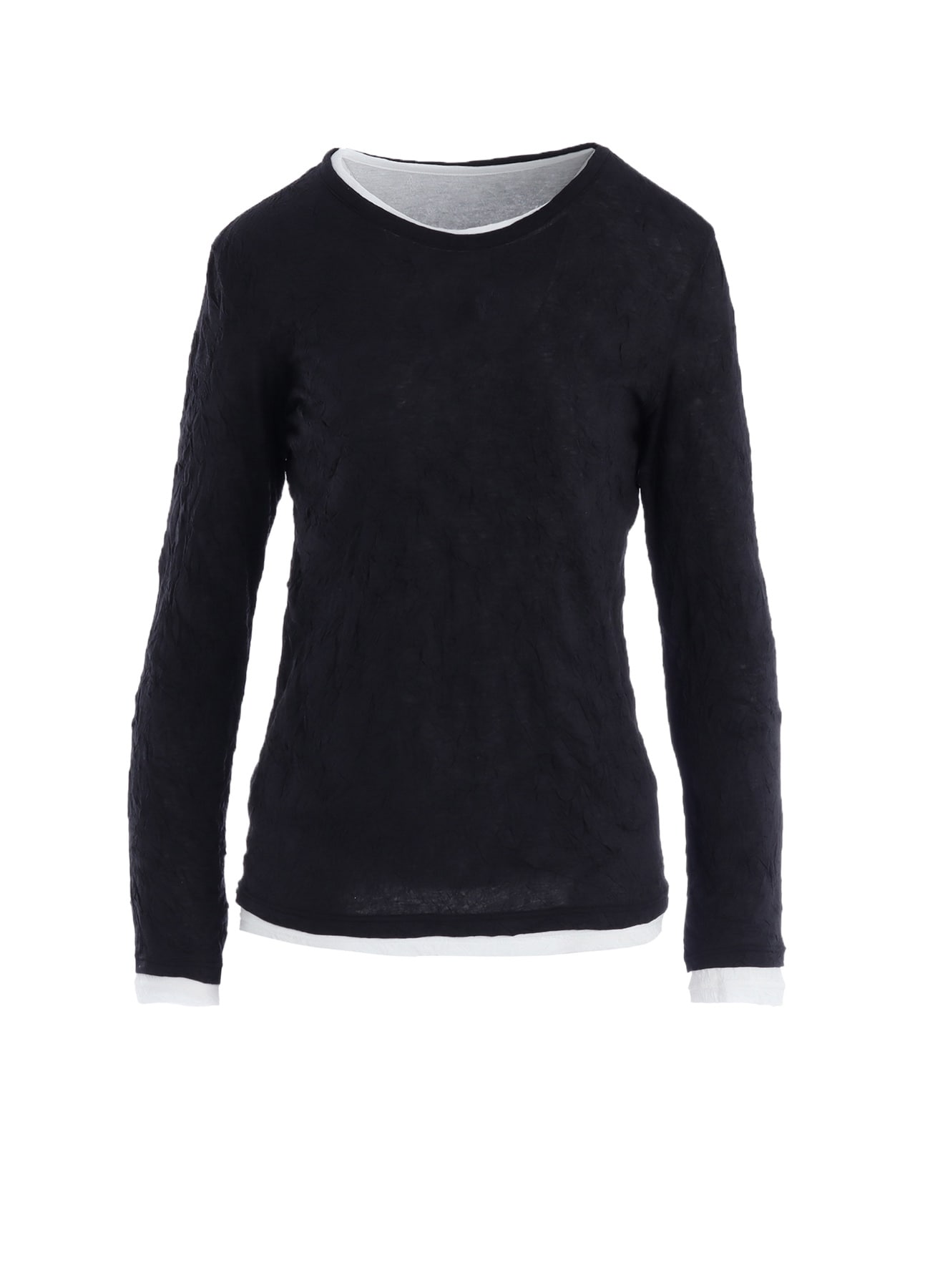 シワ感のある薄手の生地の長袖カットソー。レイヤードでお使いいただける二枚重なったデザイン。それぞれ単体でもお使いいただけます。