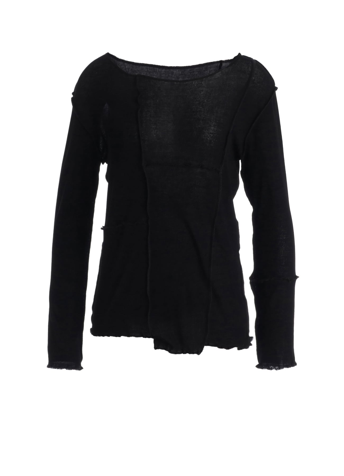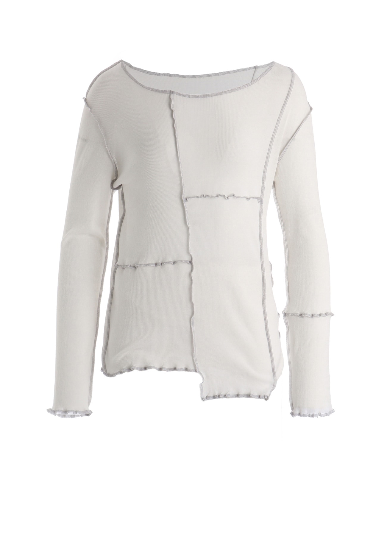ハイネックの切り替え長袖カットソー。アシンメトリーに布を継ぎ合わせデザイン。ロックミシンの接ぎ端を外にだし、あえて縮ませています。