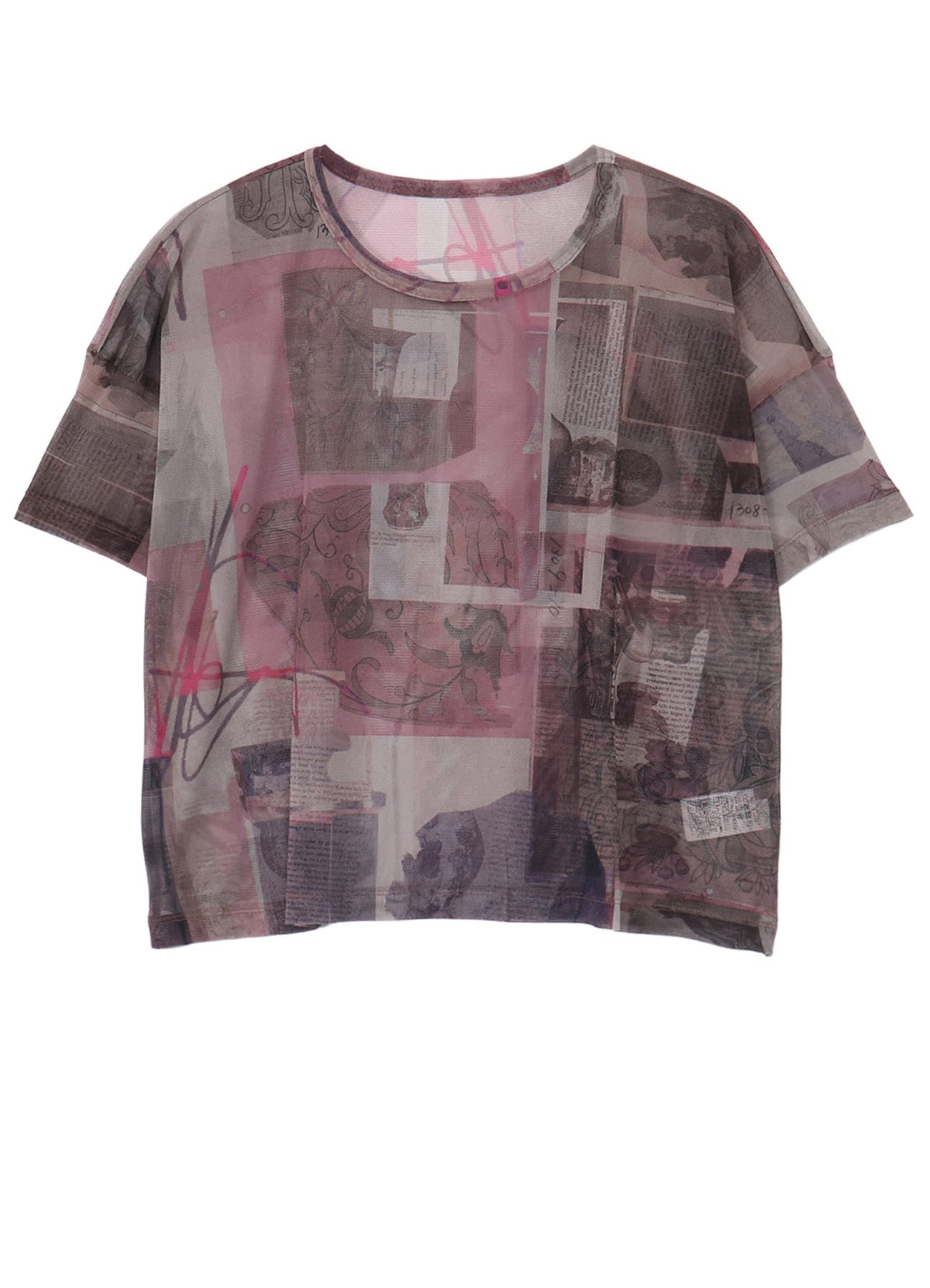 チュール生地の半袖カットソー。アンティークの壺をモチーフにしたコラージュ風の柄。ゆったりとしたサイズ感のため、身体から離れることでドレープが生まれます。