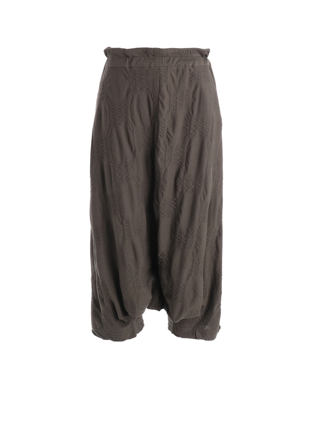 タック柄と天竺を組み合わせたサルエルパンツ。凸凹とした風合いがポイント。デイリー使いしやすいリラックス感のあるアイテム。