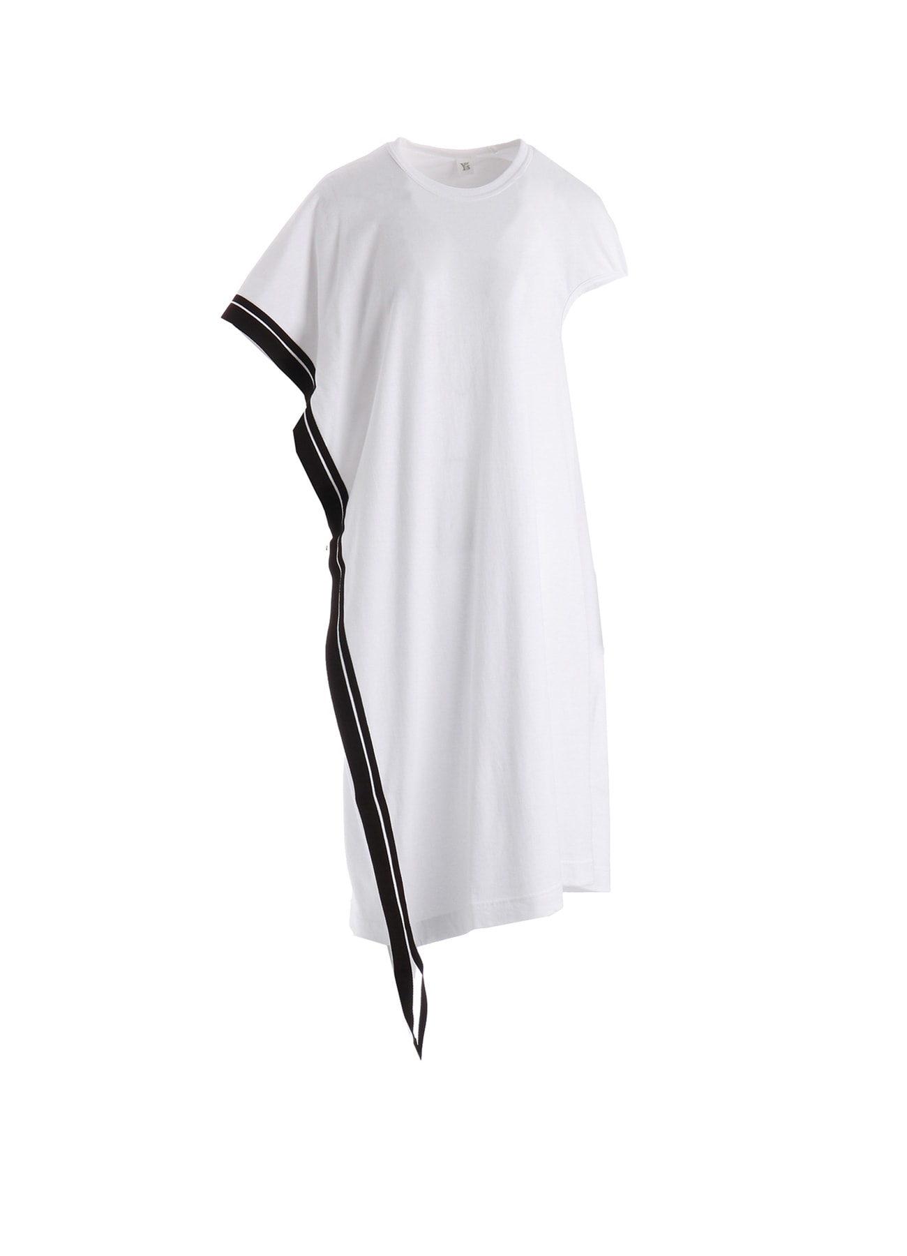 ラインテープがポイントのドレス。素材の形状を活かし接ぎのない丸胴で仕上げています。アンバランスなシルエットがワイズらしいデザイン。