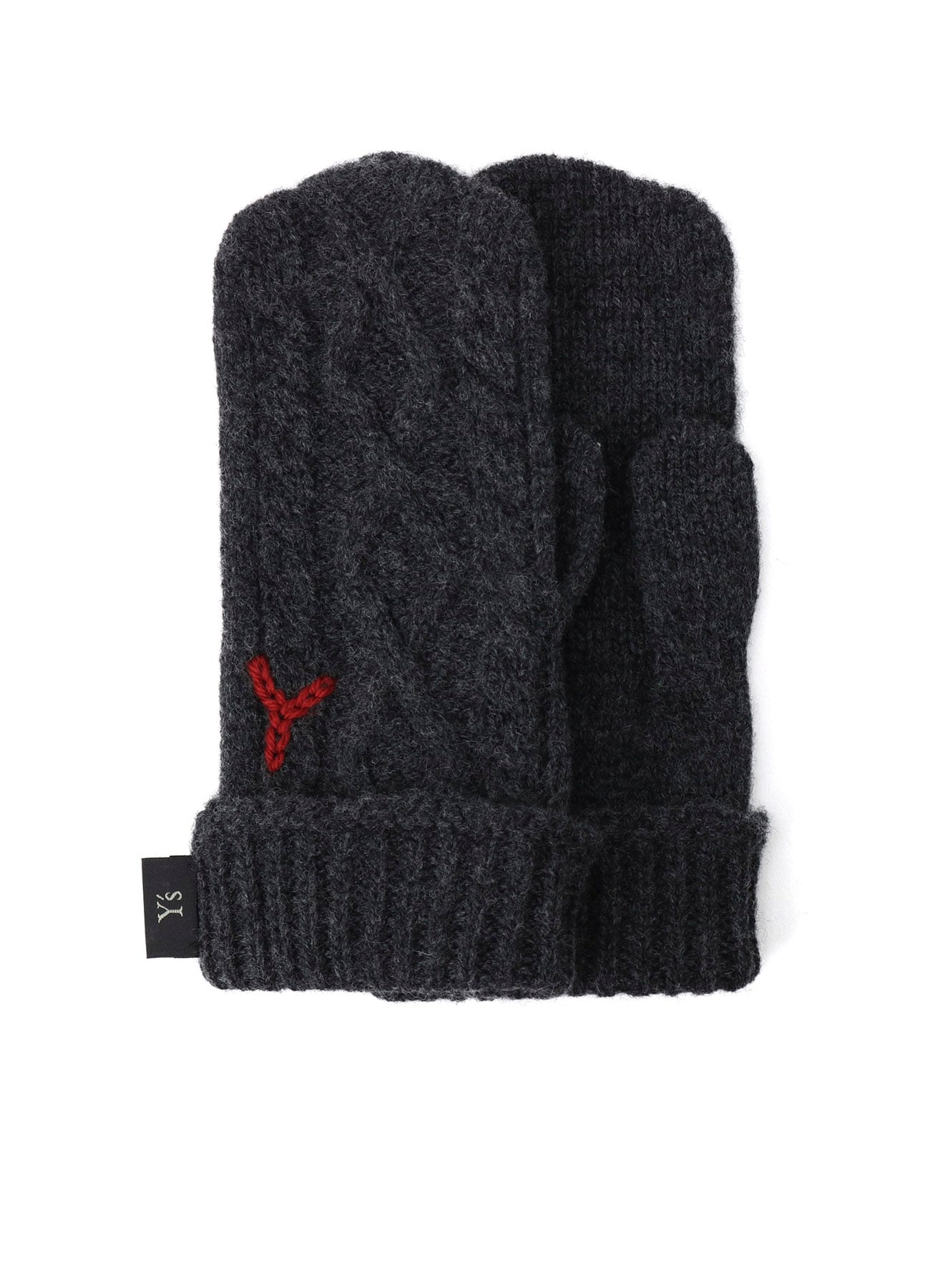 Yのハンドステッチがアクセントのミトン。古いアランセーターを参考に柄を組み合わせてデザインしています。ふっくらとしたシルエットで、ニットとのコーディネートがおすすめ。ニット製品ですので、摩擦や引っ掛けによる糸引きやほつれが生じる場合があります。お取り扱いにはご注意ください。