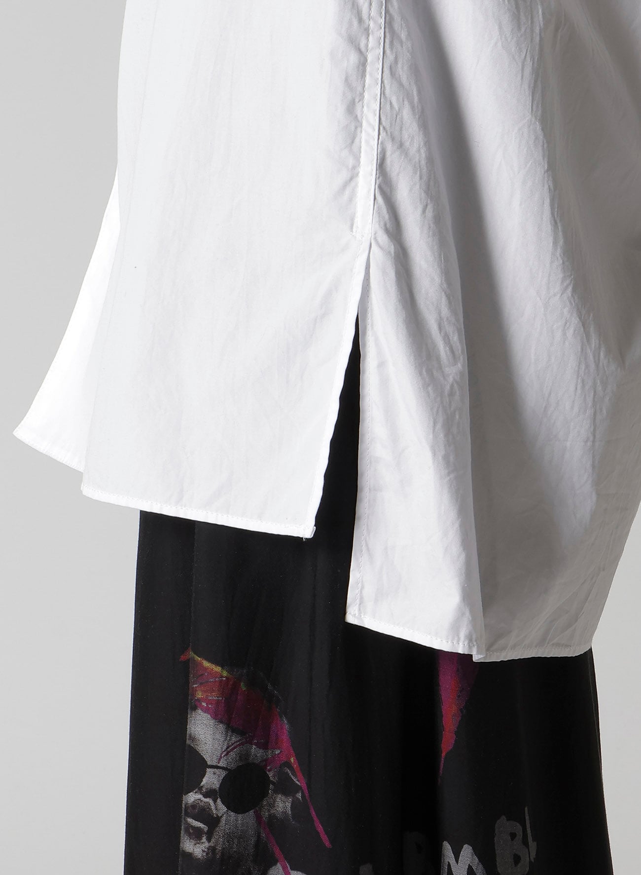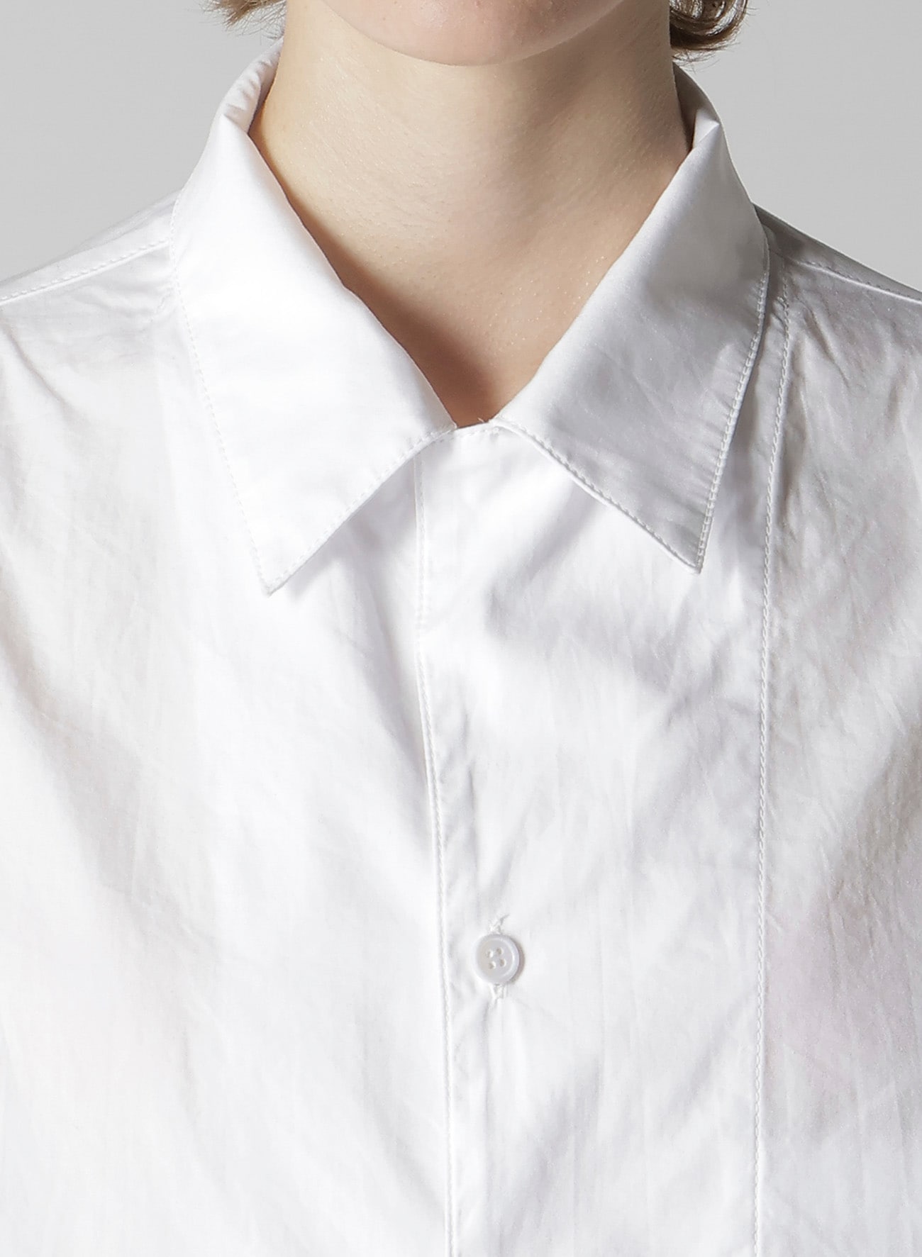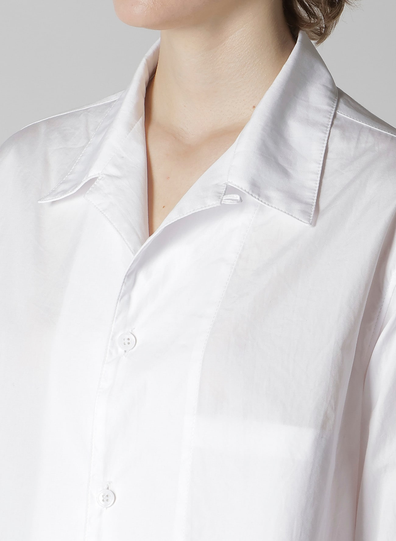 ワイズ定番のコットンブロード生地を使用した開襟シャツ。生地の状態でエアータンブラー加工を施しており、軽いシワ感のあるふんわりと柔らかな風合いに仕上がっています。左襟のループをかけて、レギュラーカラーのシャツのようにもお召しいただけます。ラフになりすぎず、上品な印象になるように仕立てています。