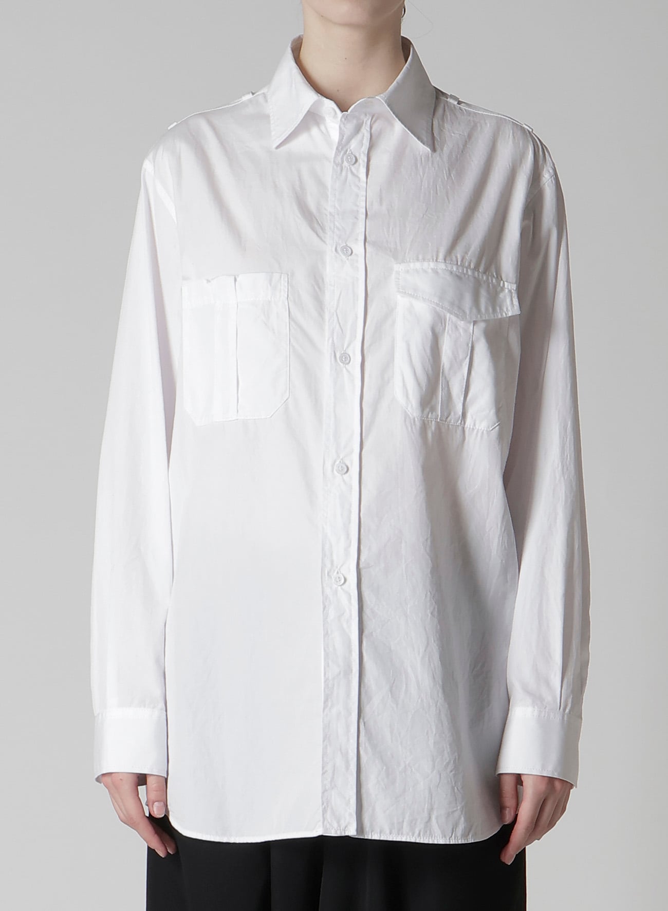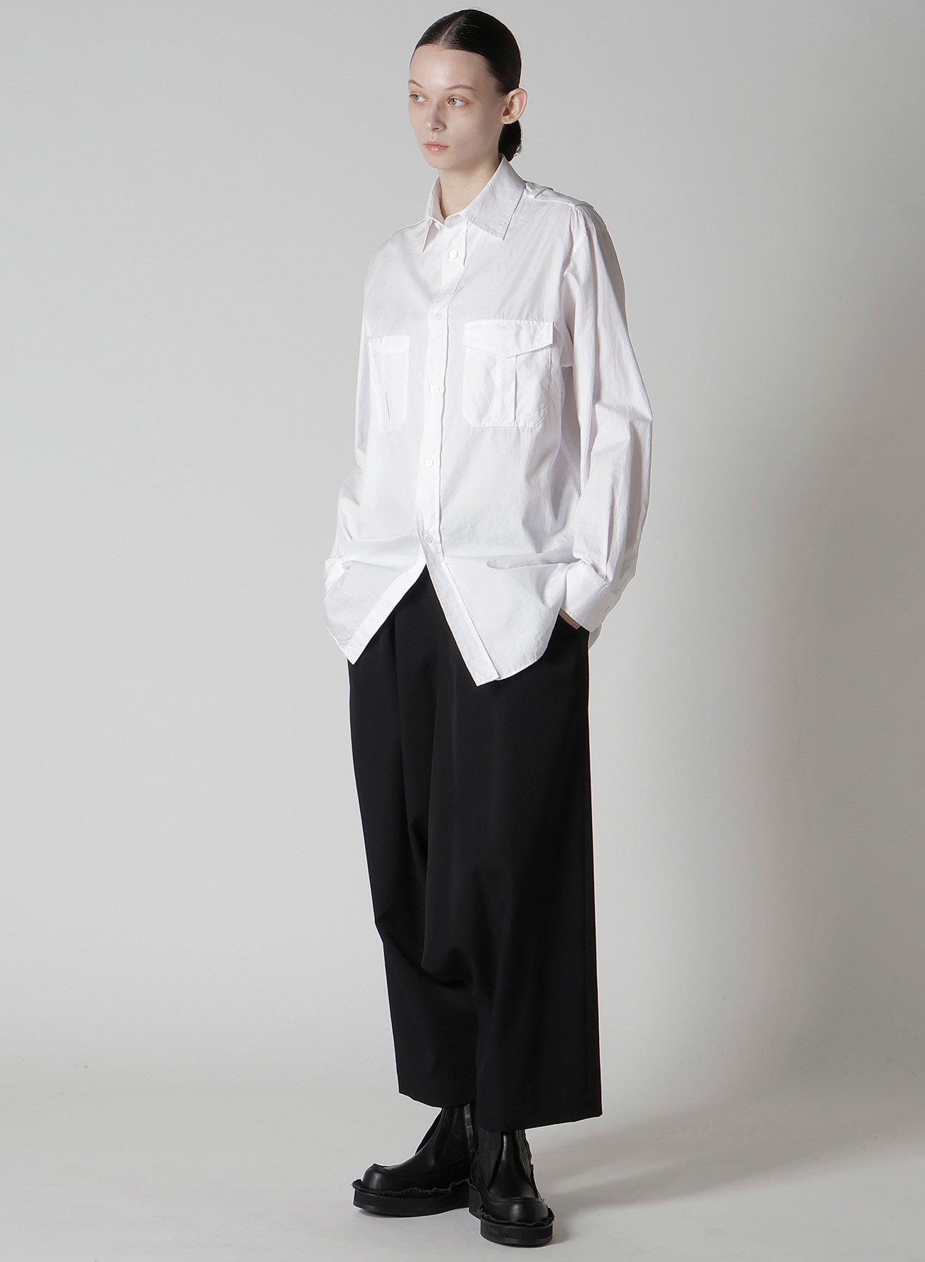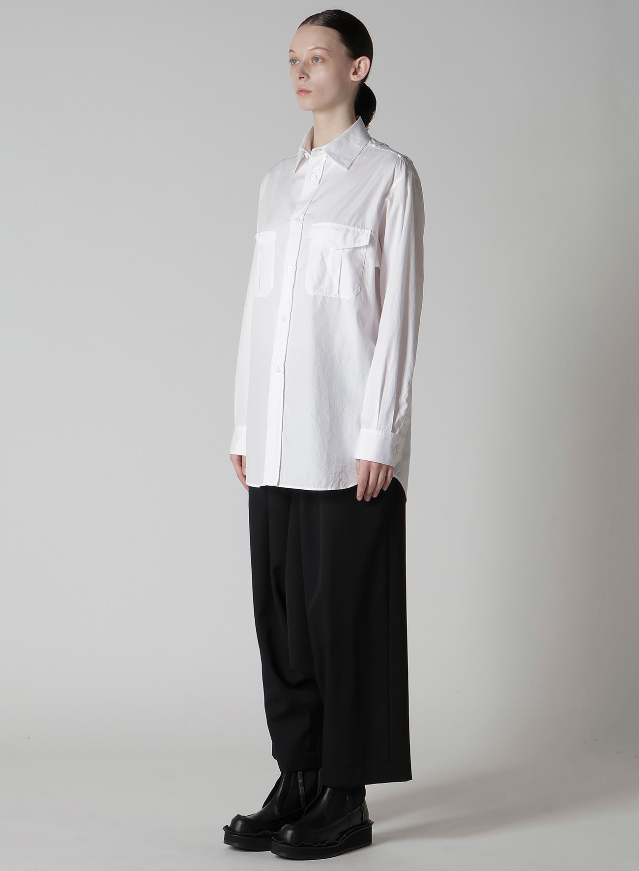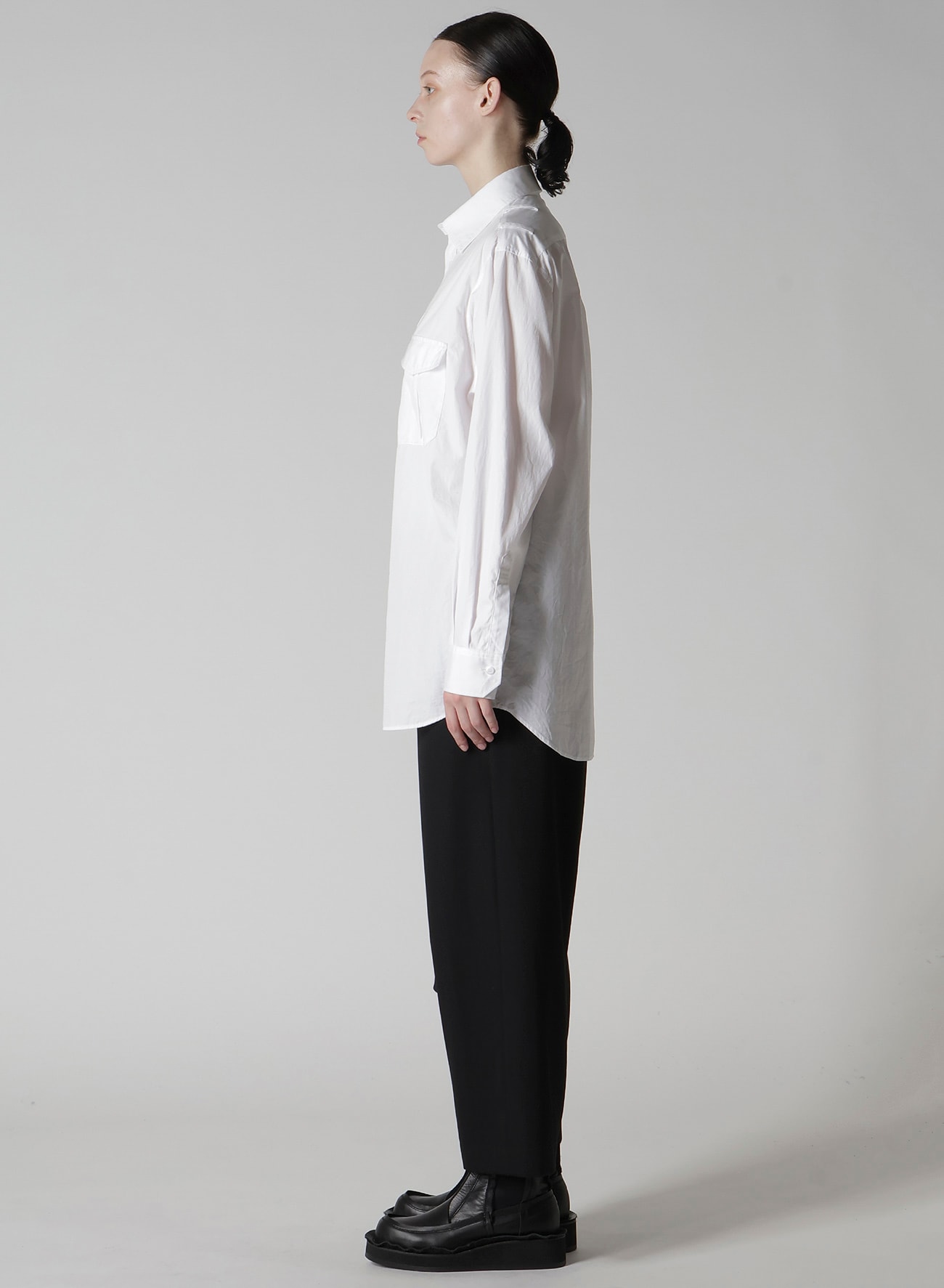 ワイズ定番のコットンブロード生地を使用したワークシャツ。生地の状態でエアータンブラー加工を施しており、軽いシワ感のあるふんわりと柔らかな風合いに仕上がっています。胸元のアウトポケットと、肩のループが特徴です。すっきりとしたシルエットで、どんなボトムスにも合わせやすいアイテム。