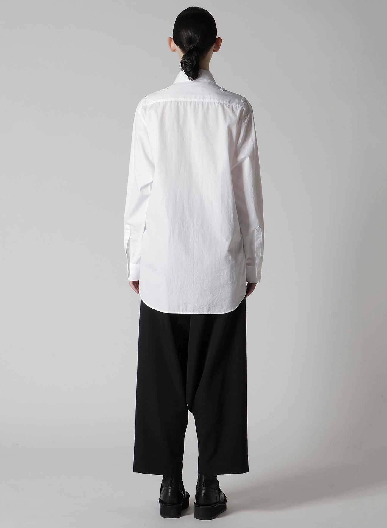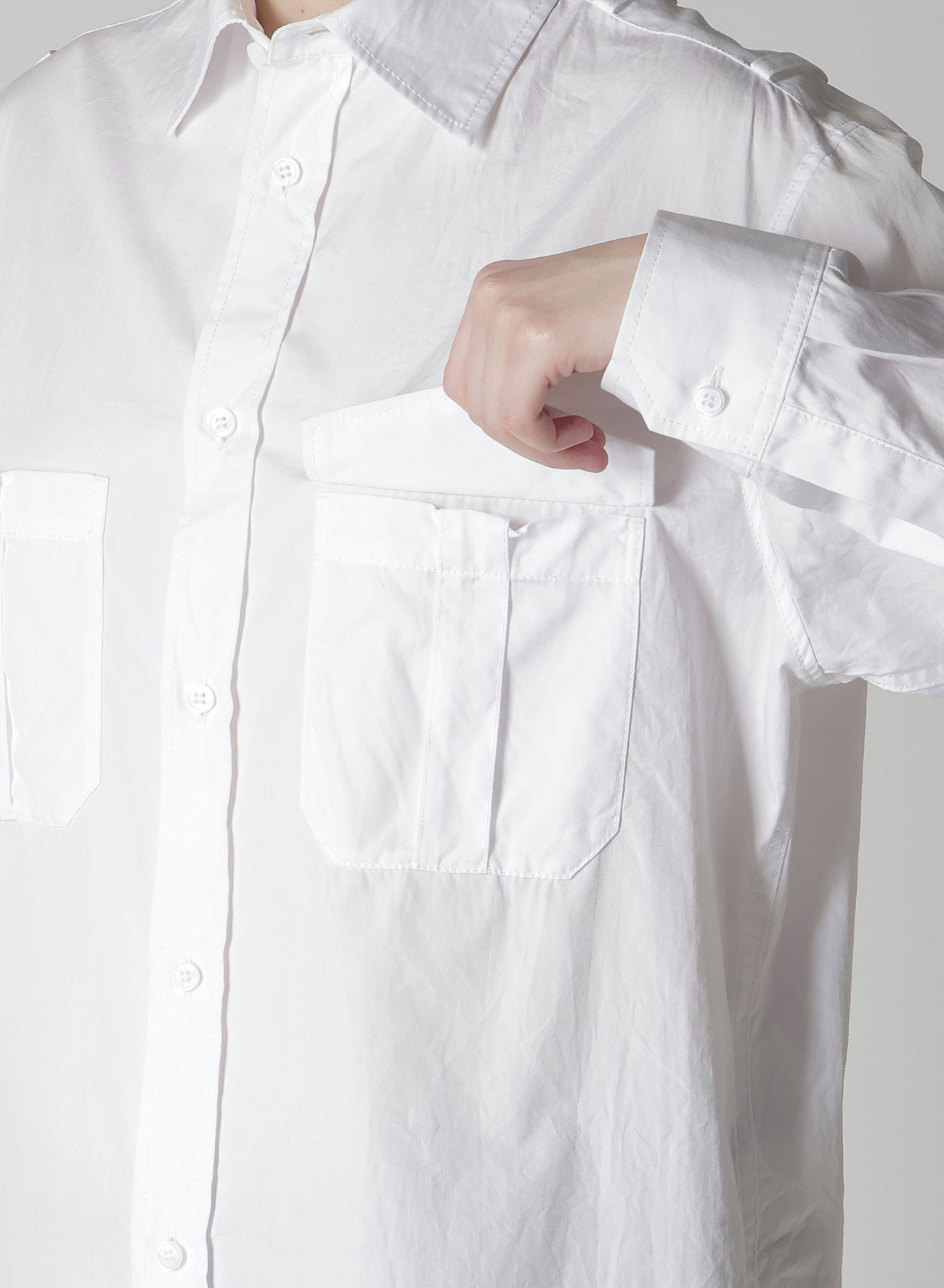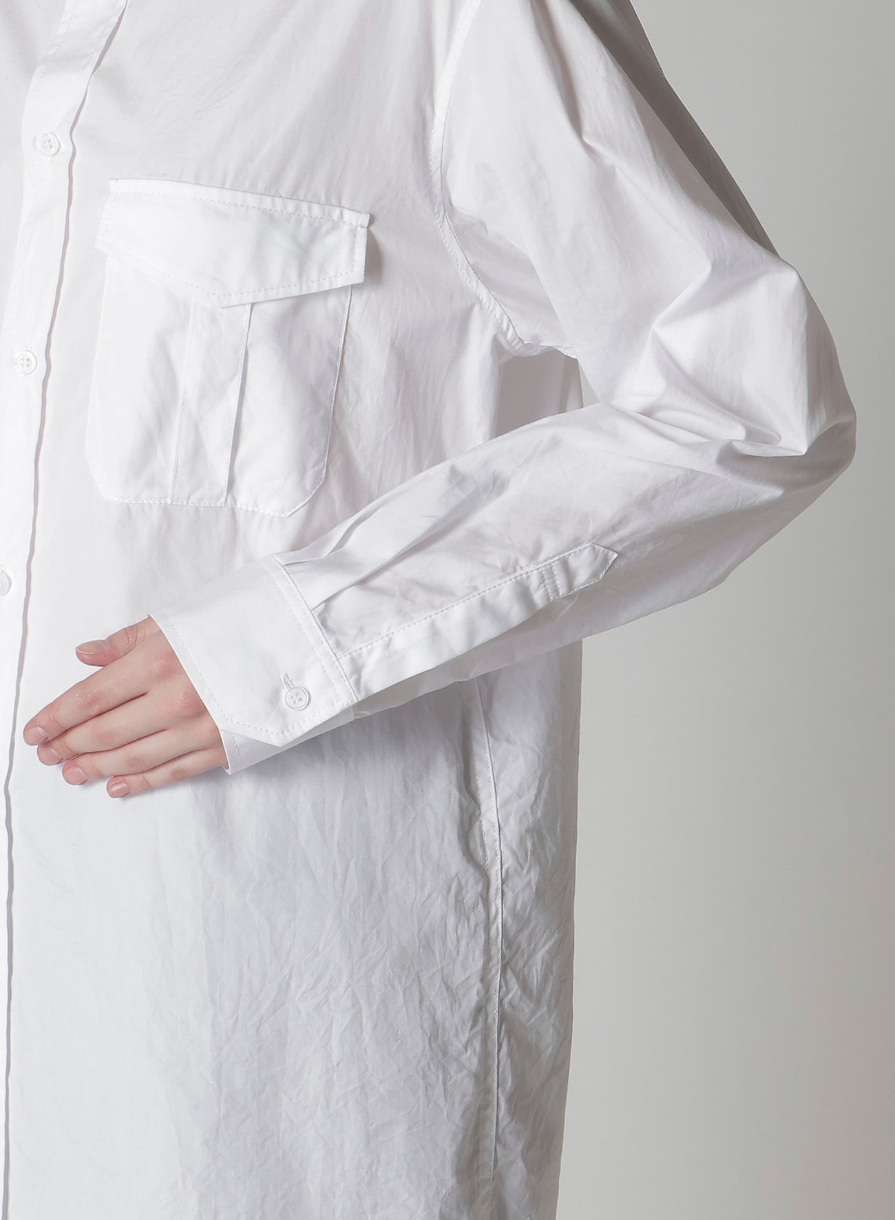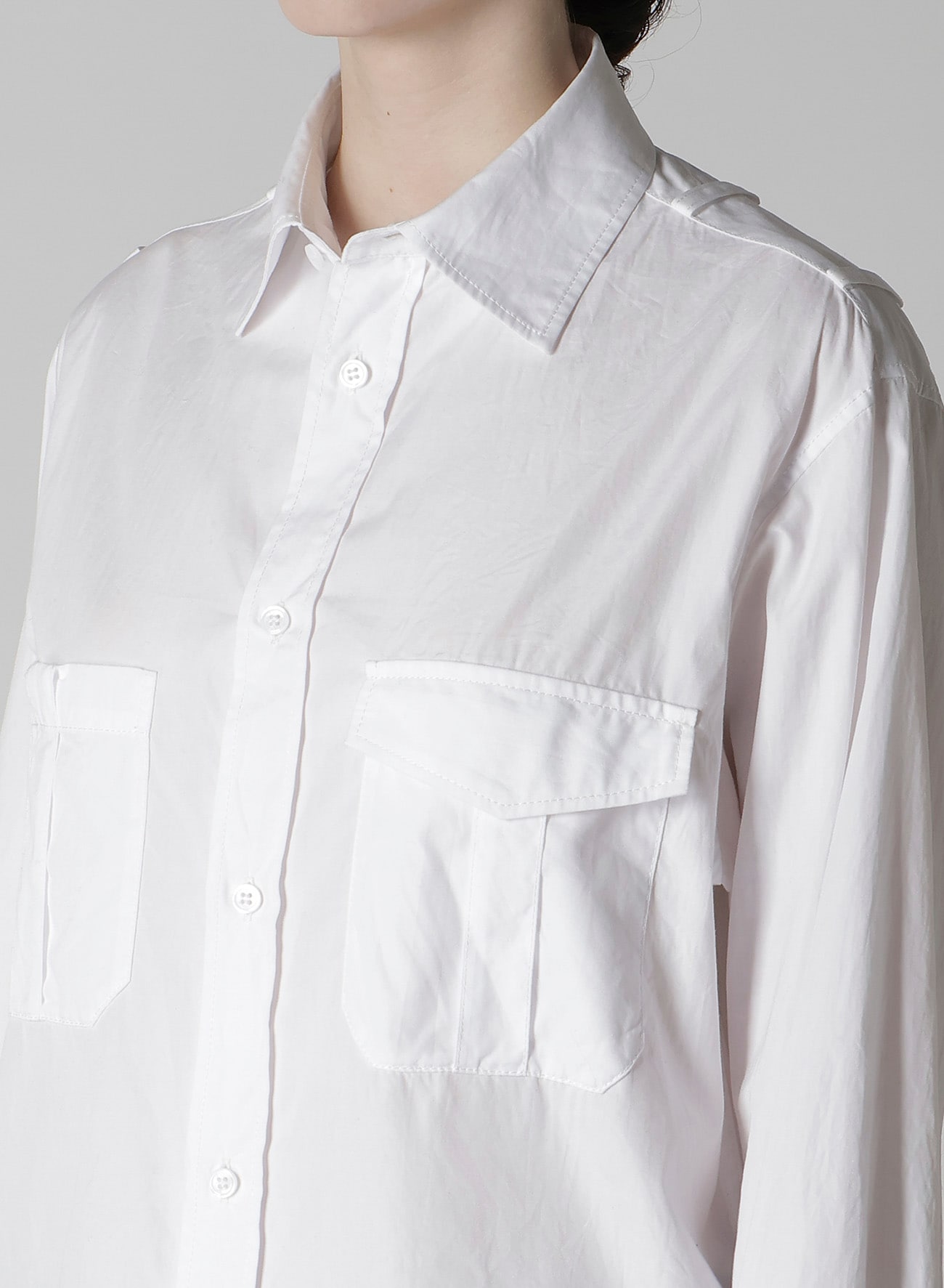 ワイズ定番のコットンブロード生地を使用したワークシャツ。生地の状態でエアータンブラー加工を施しており、軽いシワ感のあるふんわりと柔らかな風合いに仕上がっています。胸元のアウトポケットと、肩のループが特徴です。すっきりとしたシルエットで、どんなボトムスにも合わせやすいアイテム。