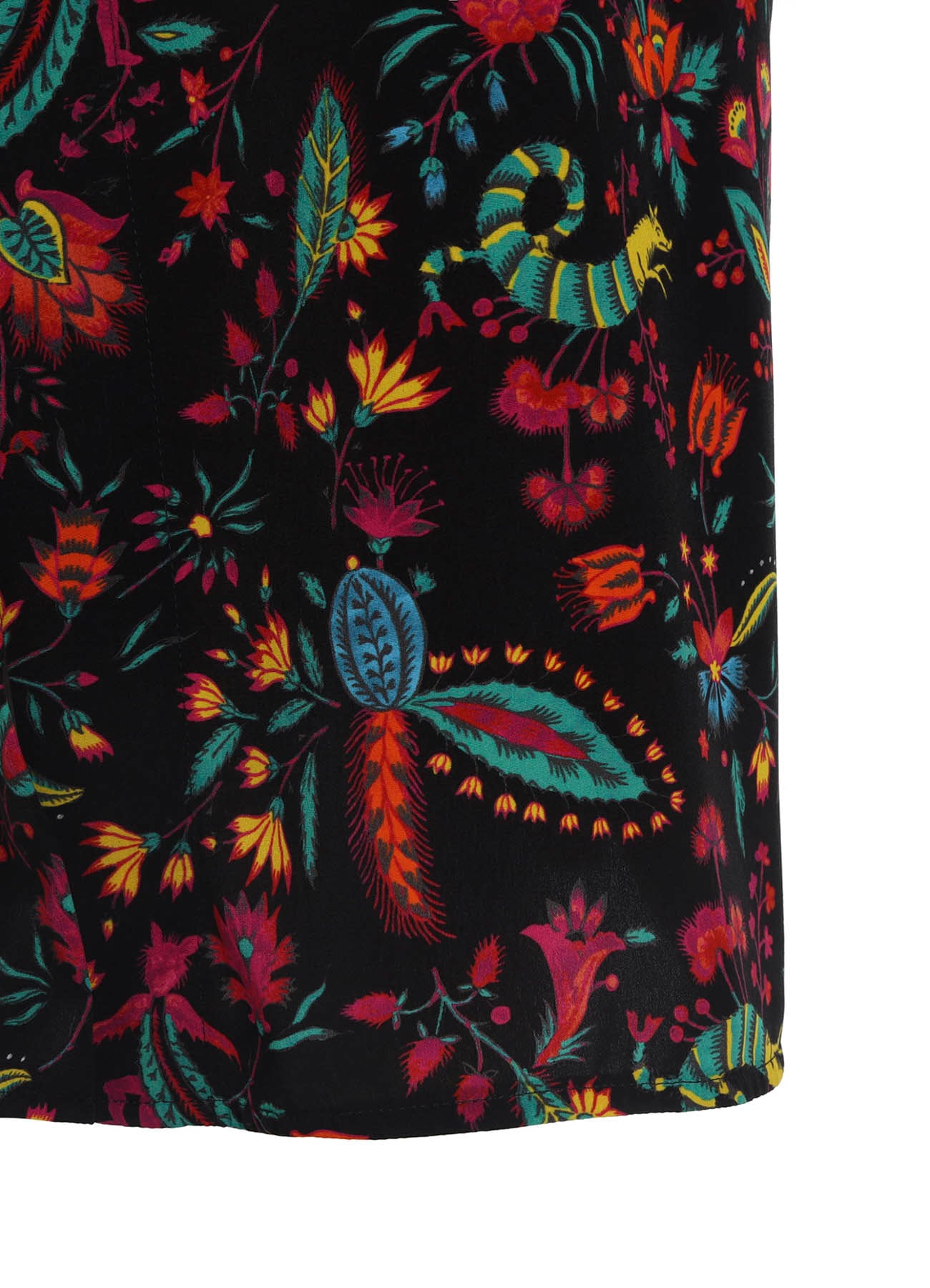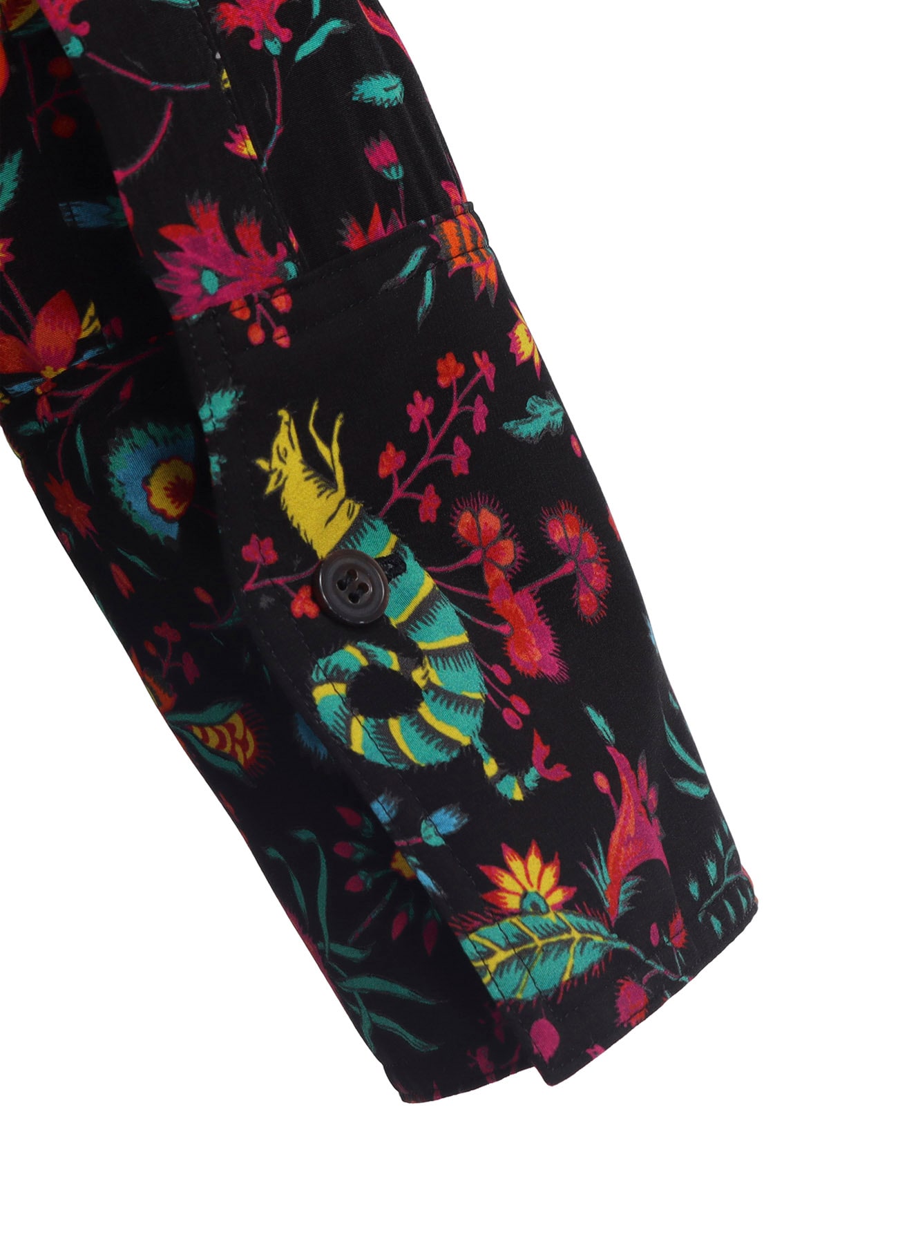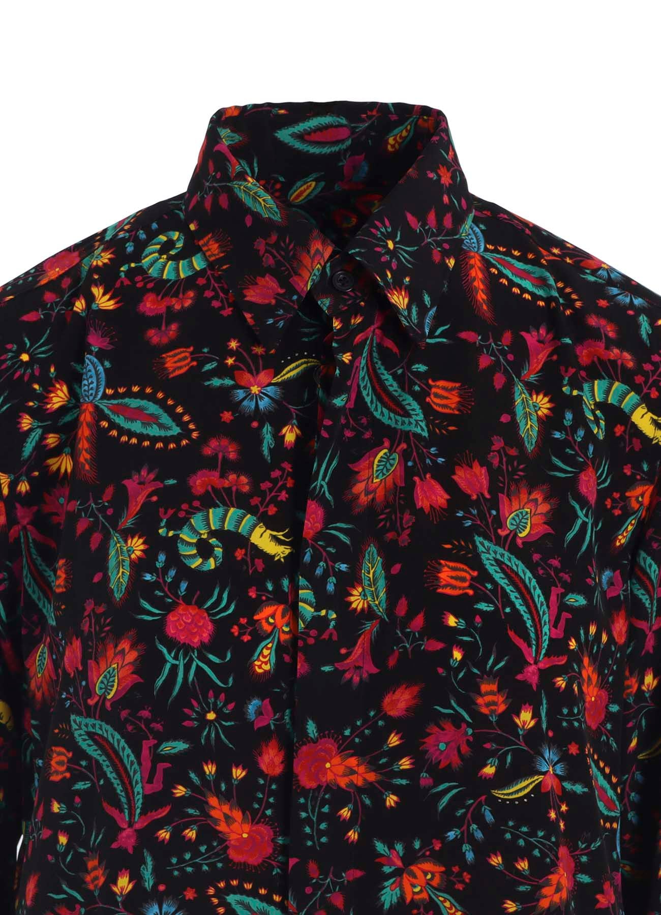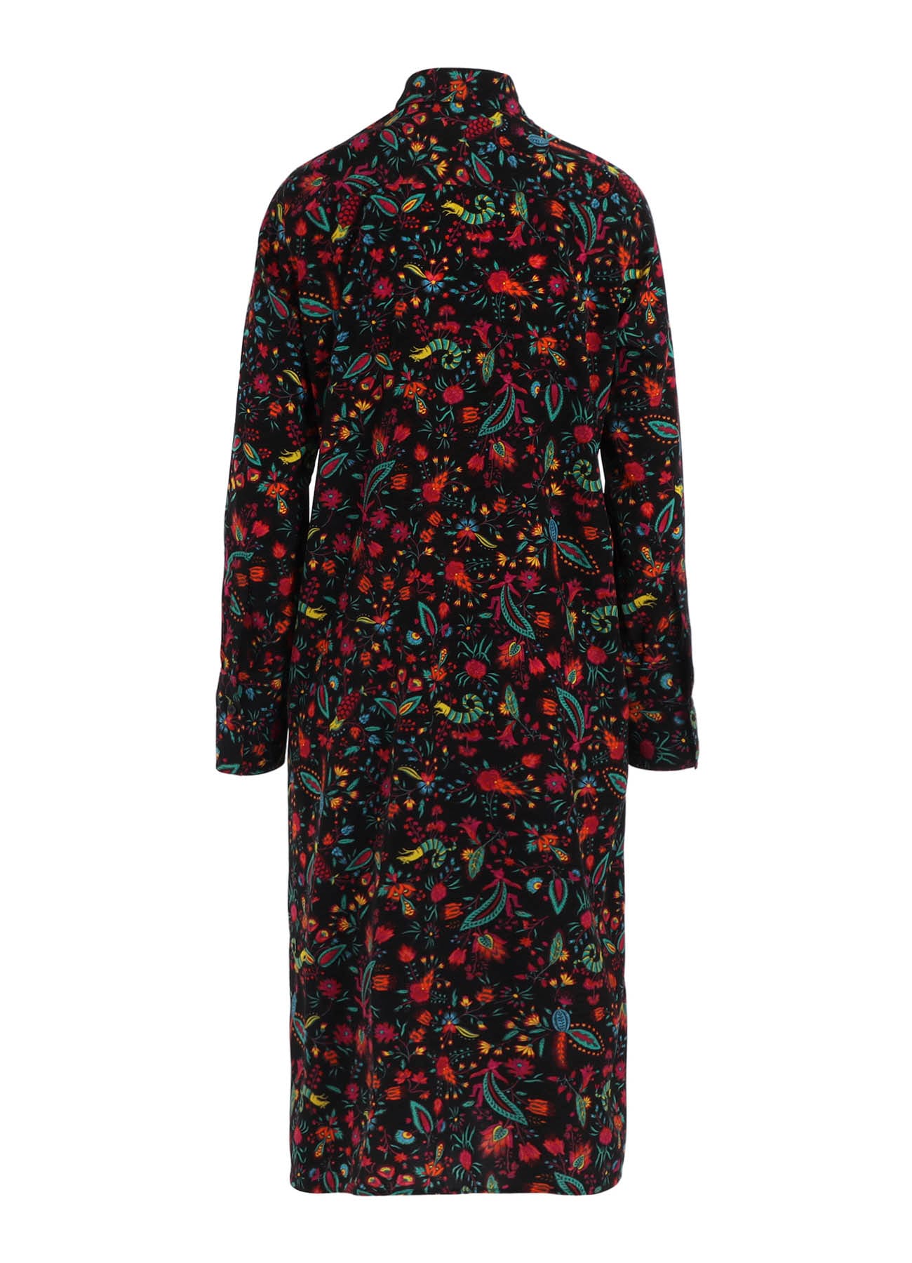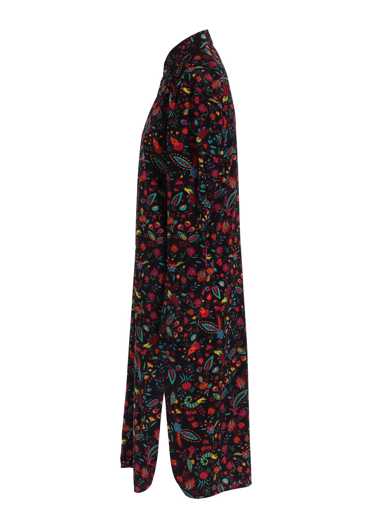 鮮やかなプリントが目を引く長袖ロングシャツ。過去に展開した柄を再構成しており、数百年前の壁紙をソースに色彩で装飾された植物や架空の生き物を描いています。一枚でワンピースとしてはもちろん、パンツとのコーディネートや羽織としてもおすすめです。