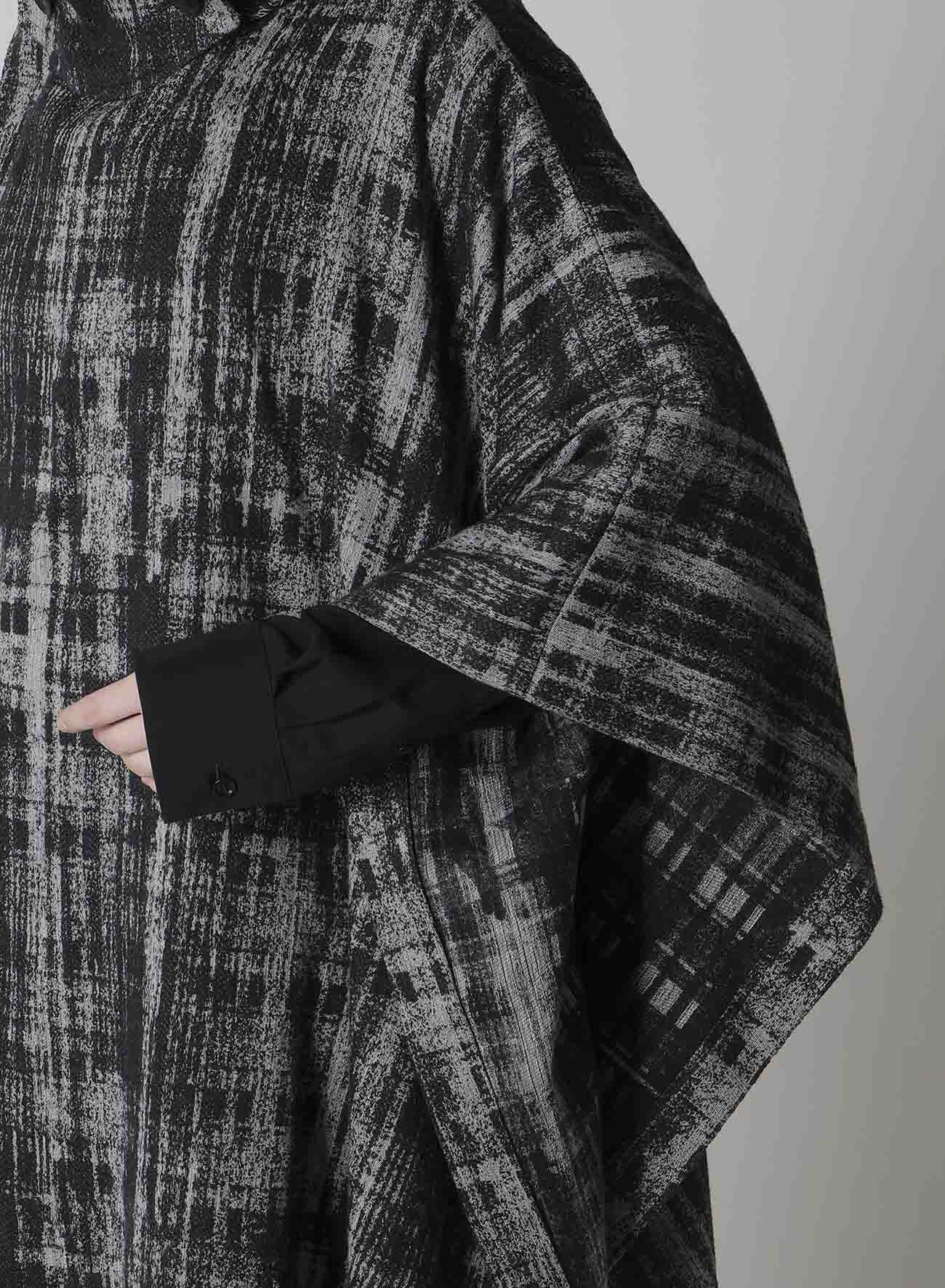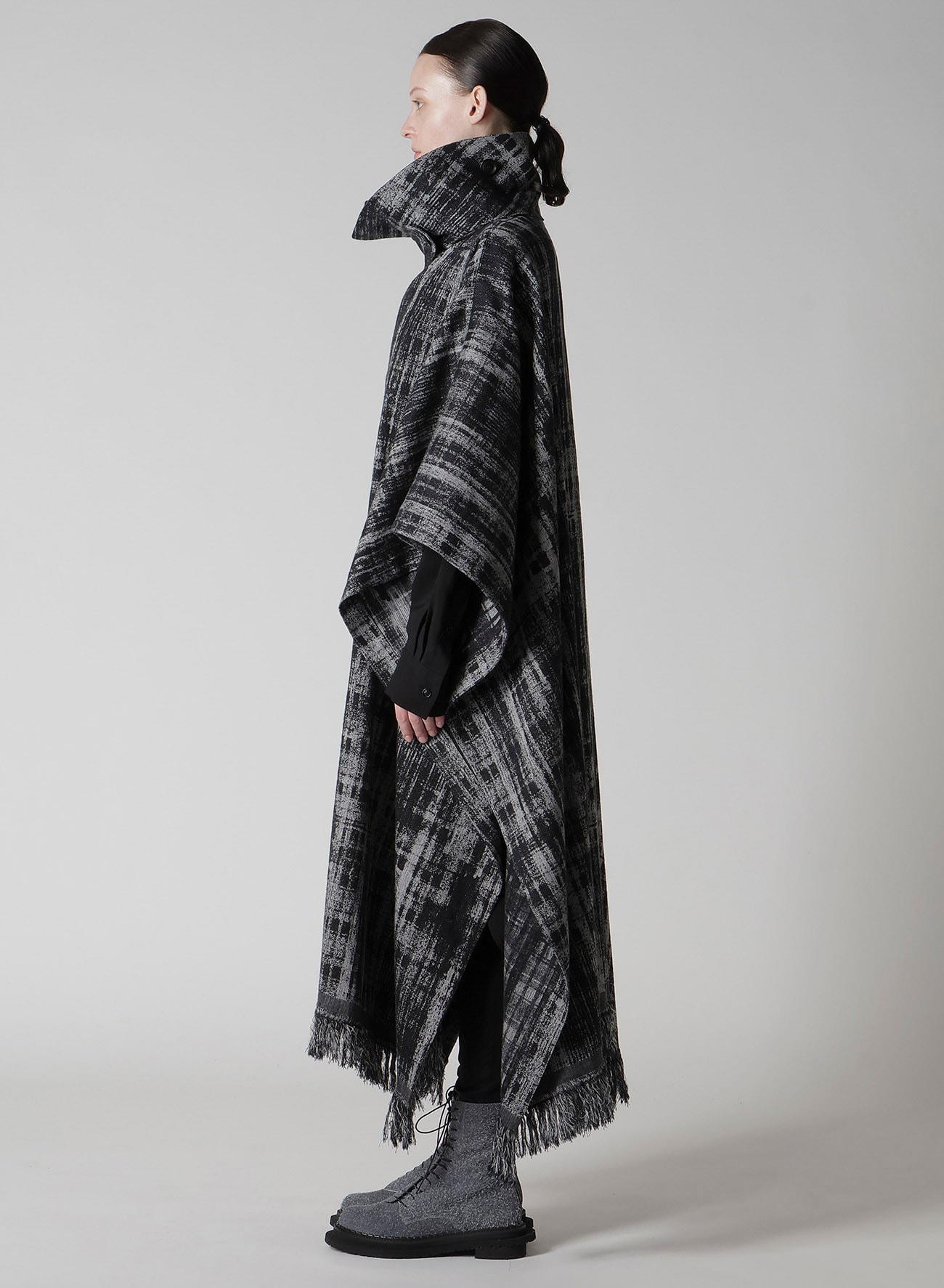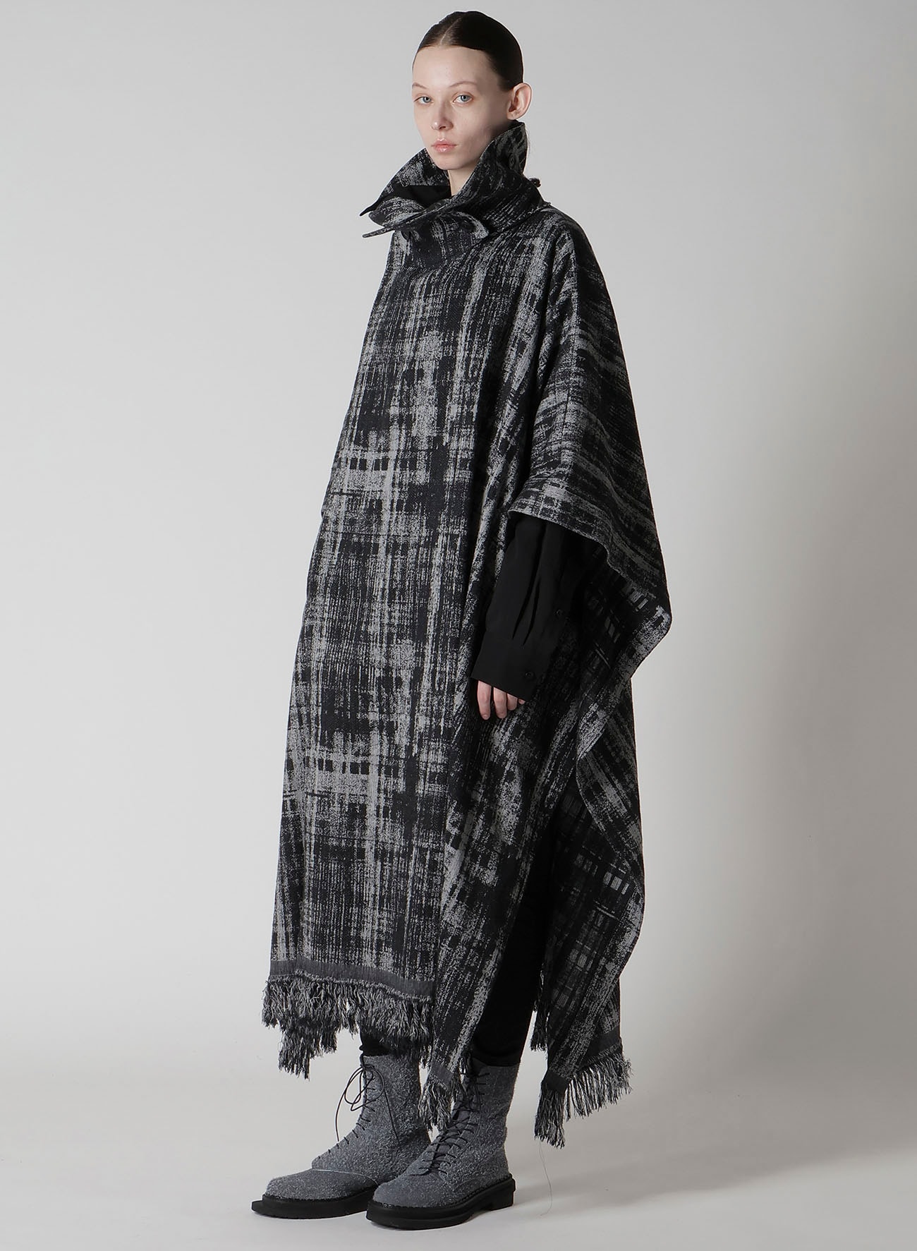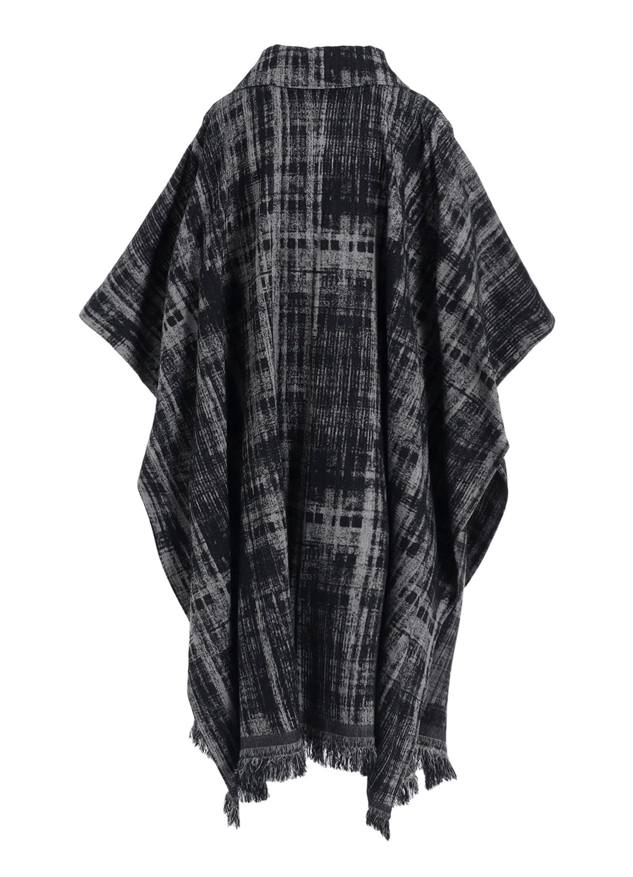 かすれチェック柄のマントコート。モノトーンでも単調にならないように細部にまで拘り、より深みのある表情を追求したジャガード生地。スナップボタンで右身頃側へ深く留め、包み込むように着るデザインです。襟は立ち上げてベルトで留めるスタイルと、折り返したスタイルで着ることができ、印象の変化が楽しめます。サイドは開いているので、アウターの上からの着用も可能で、迫力のあるコートです。