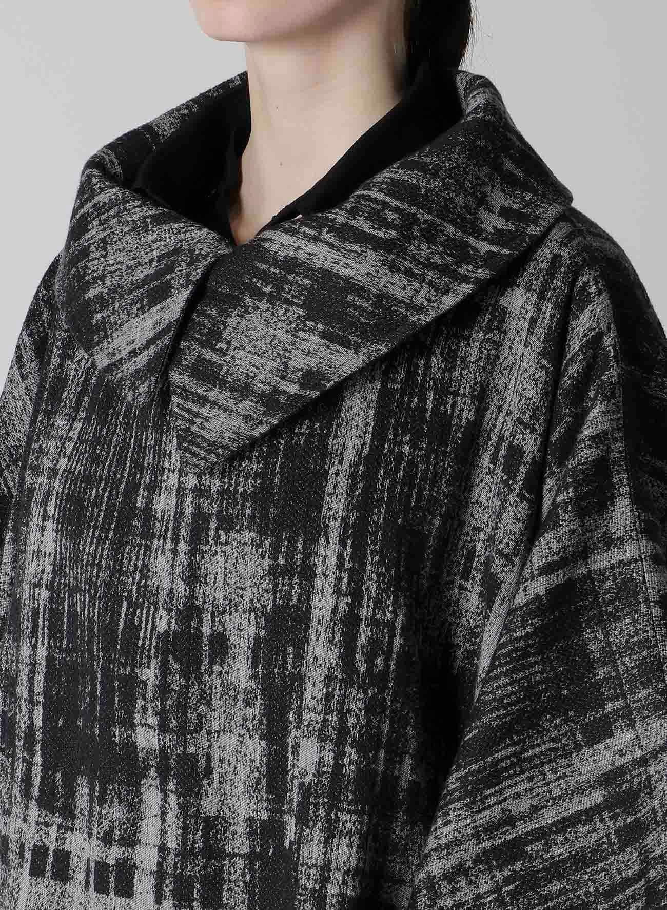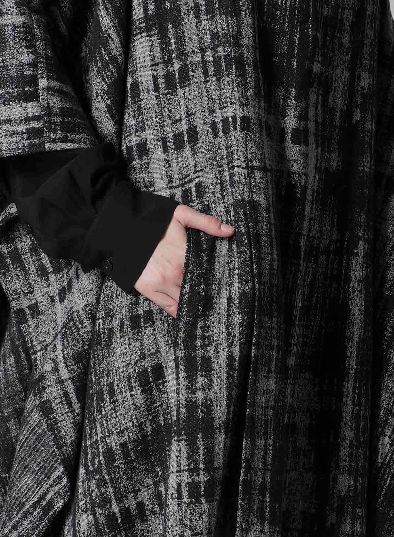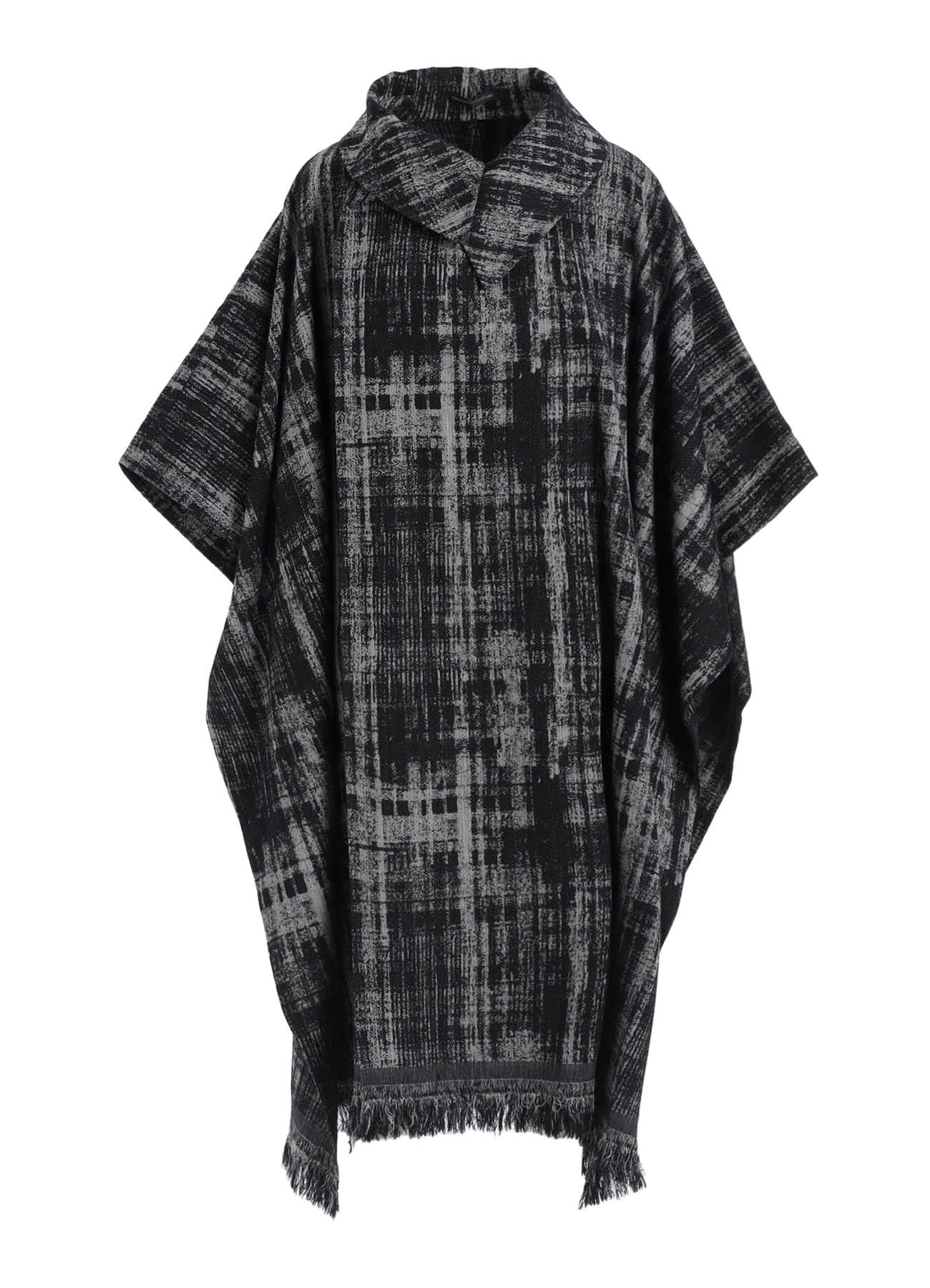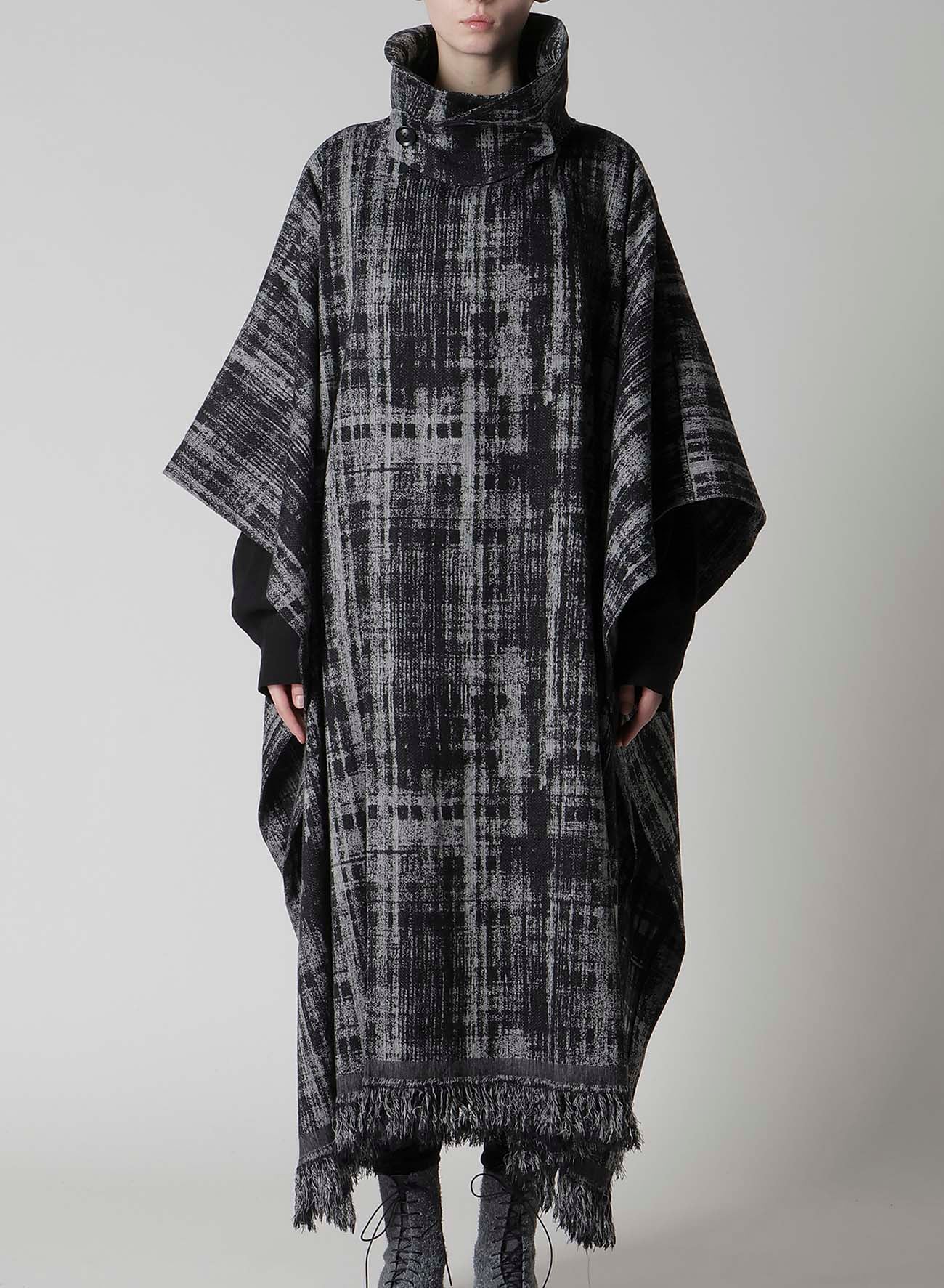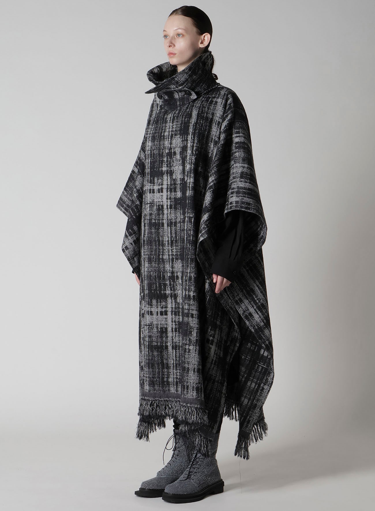 かすれチェック柄のマントコート。モノトーンでも単調にならないように細部にまで拘り、より深みのある表情を追求したジャガード生地。スナップボタンで右身頃側へ深く留め、包み込むように着るデザインです。襟は立ち上げてベルトで留めるスタイルと、折り返したスタイルで着ることができ、印象の変化が楽しめます。サイドは開いているので、アウターの上からの着用も可能で、迫力のあるコートです。
