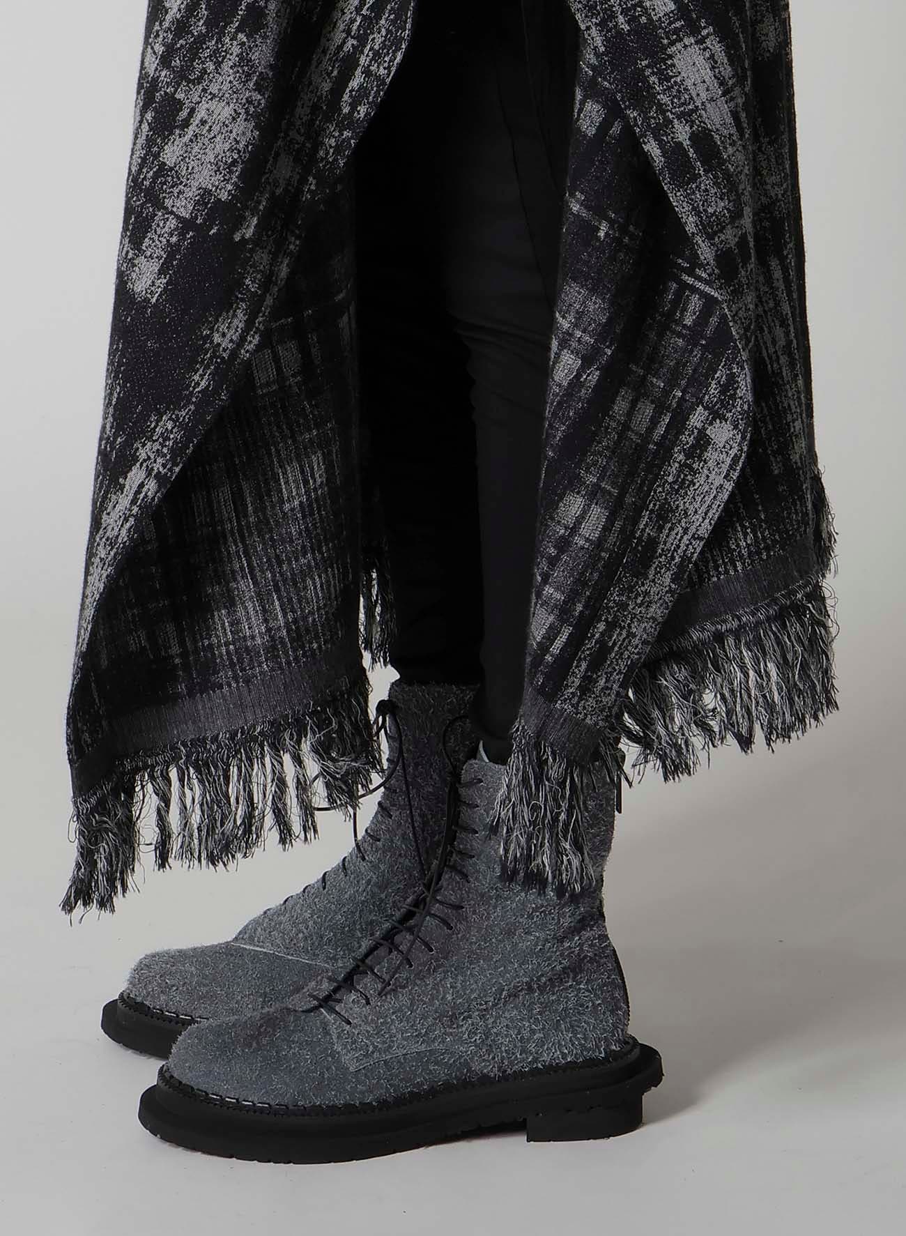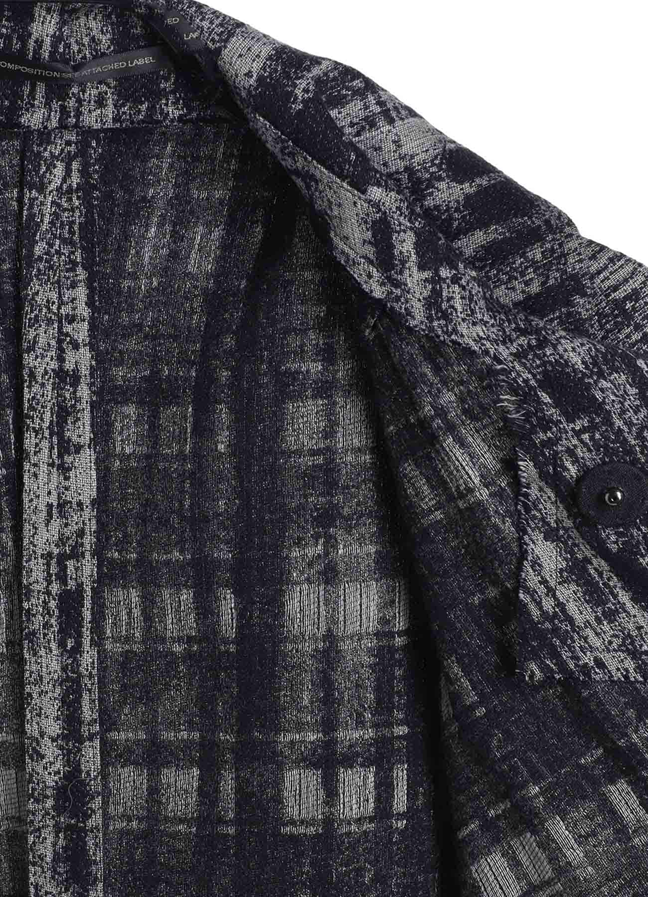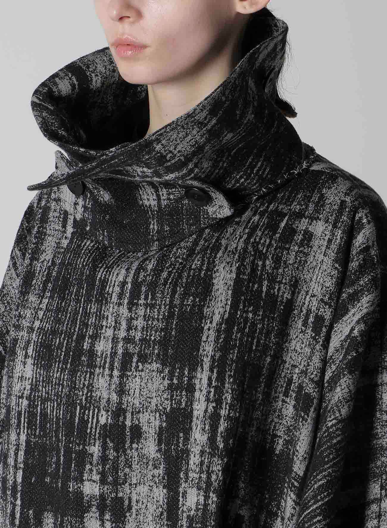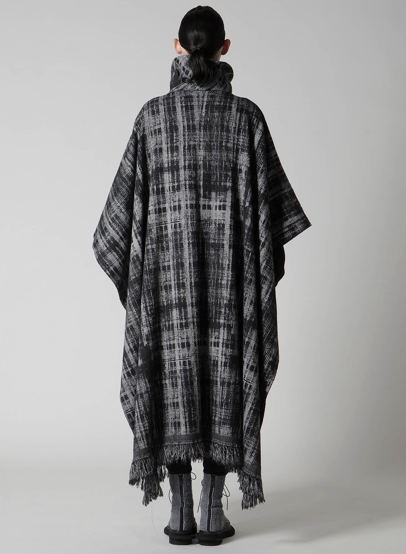 かすれチェック柄のマントコート。モノトーンでも単調にならないように細部にまで拘り、より深みのある表情を追求したジャガード生地。スナップボタンで右身頃側へ深く留め、包み込むように着るデザインです。襟は立ち上げてベルトで留めるスタイルと、折り返したスタイルで着ることができ、印象の変化が楽しめます。サイドは開いているので、アウターの上からの着用も可能で、迫力のあるコートです。