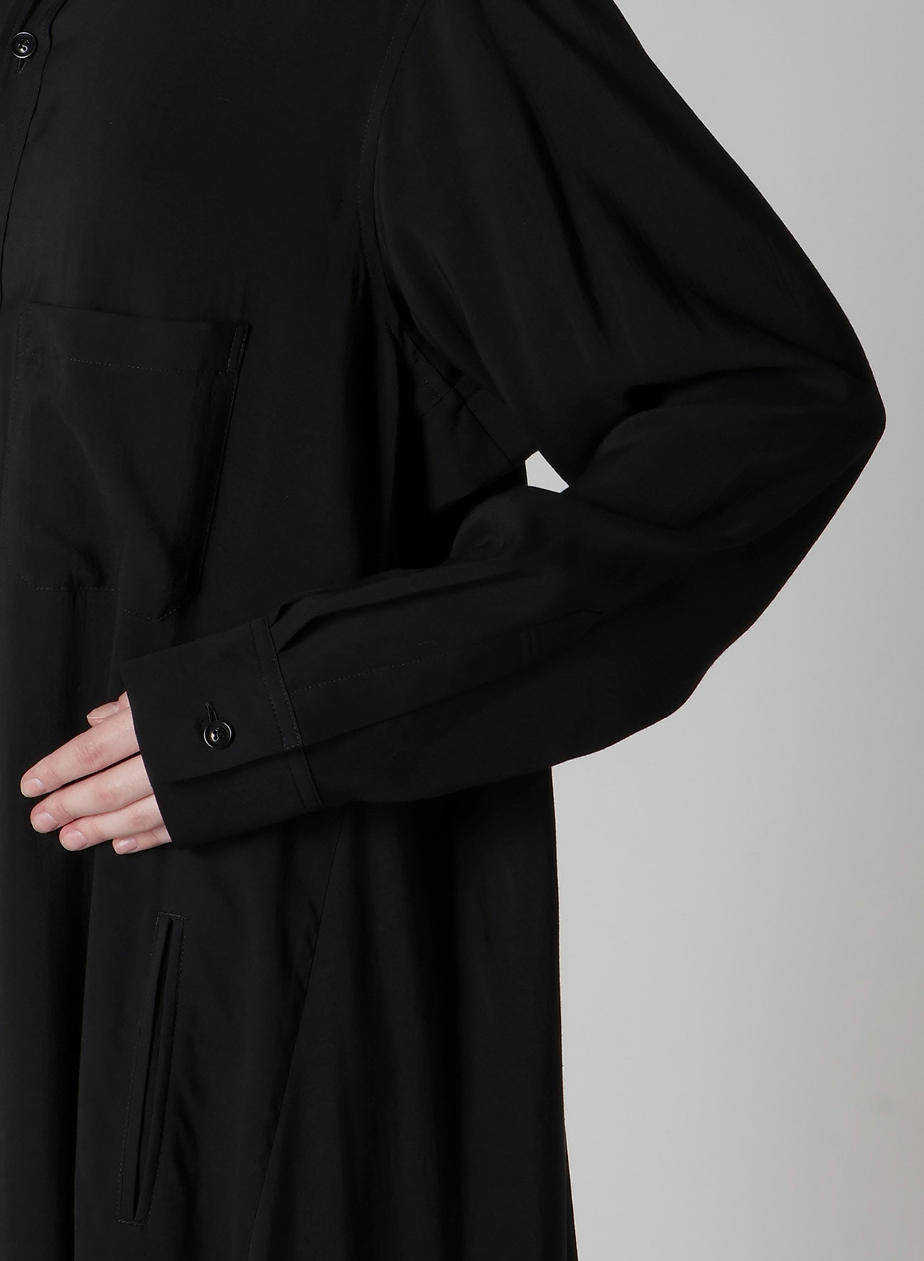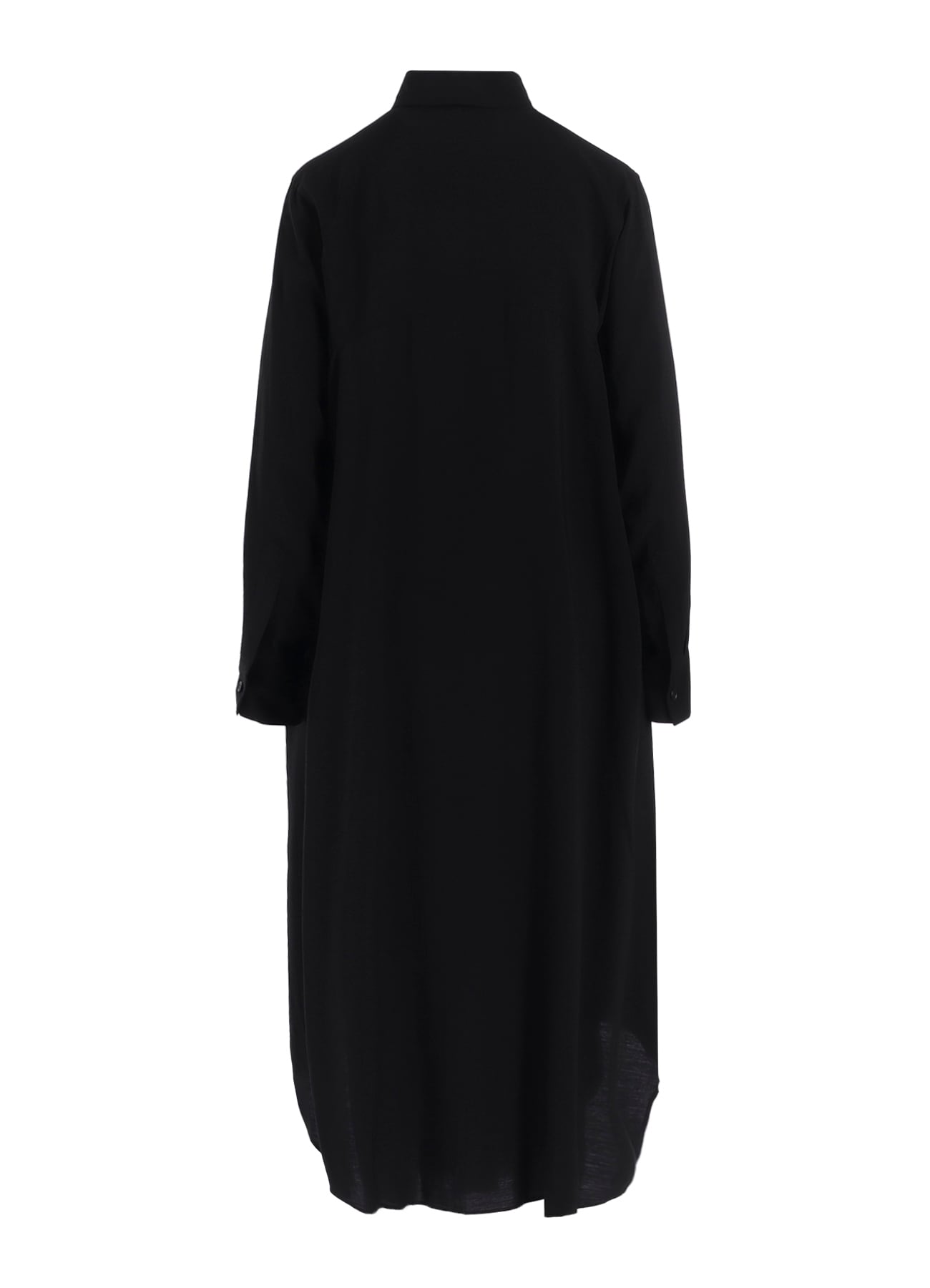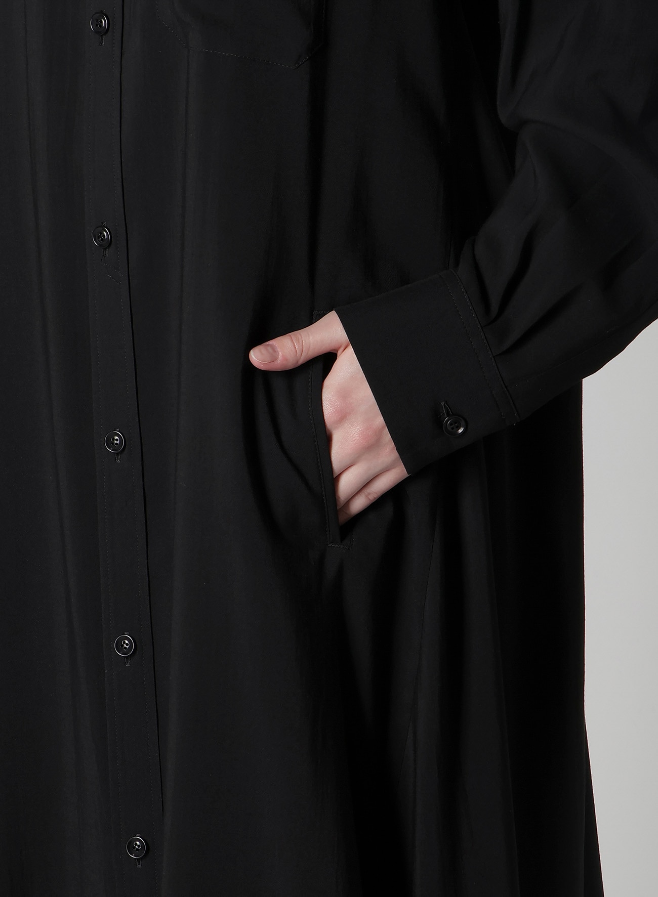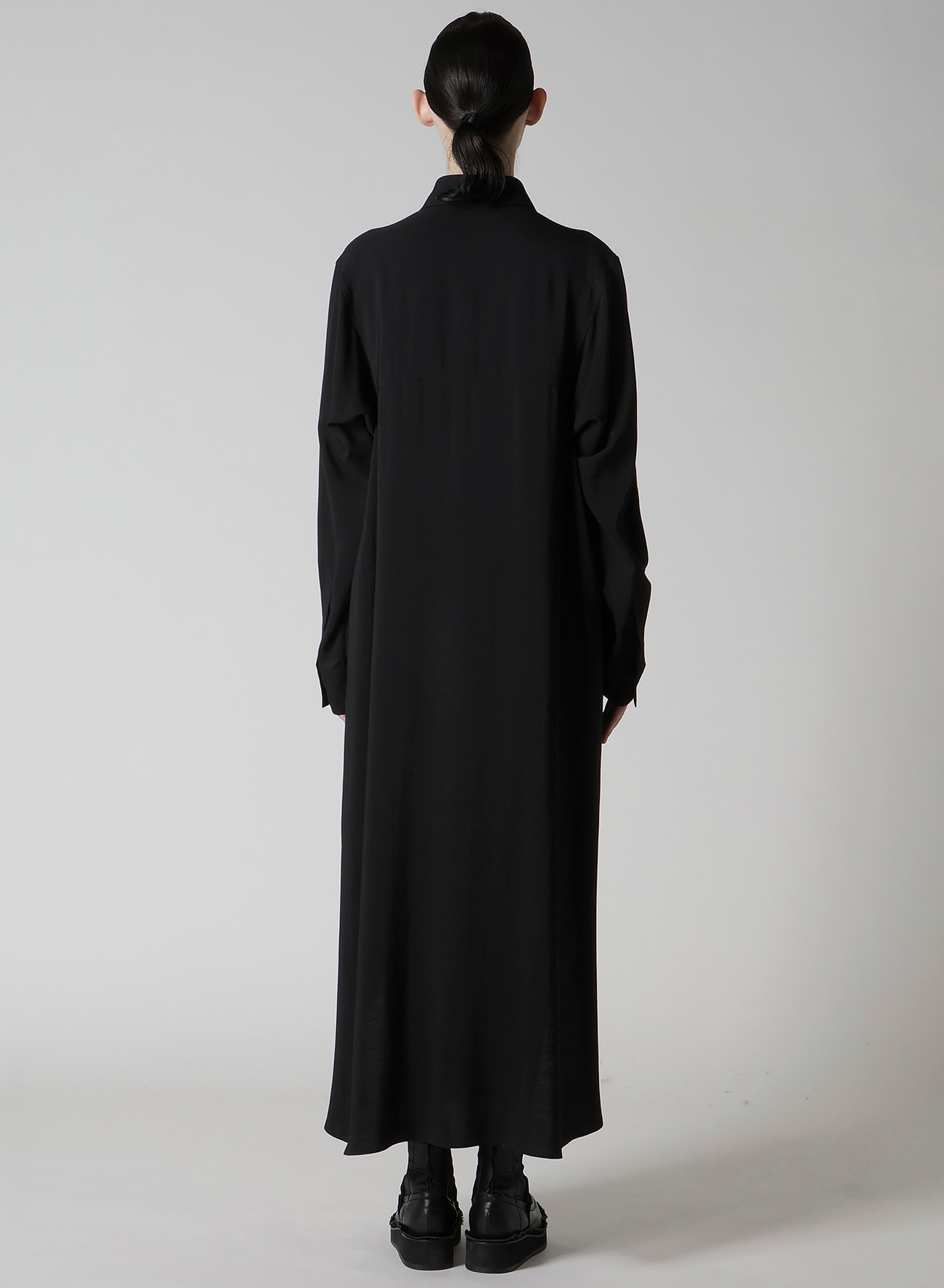 シャツカラーのIラインドレス。しなやかでドレープ感の強いキュプラとレーヨンの生地に、サーキュラー染色機を用いて濃度のある黒を表現し、天日で自然な風合いに仕上げています。一枚でドレスとしてはもちろん、ボタンを開けて羽織としてお召しいただけます。