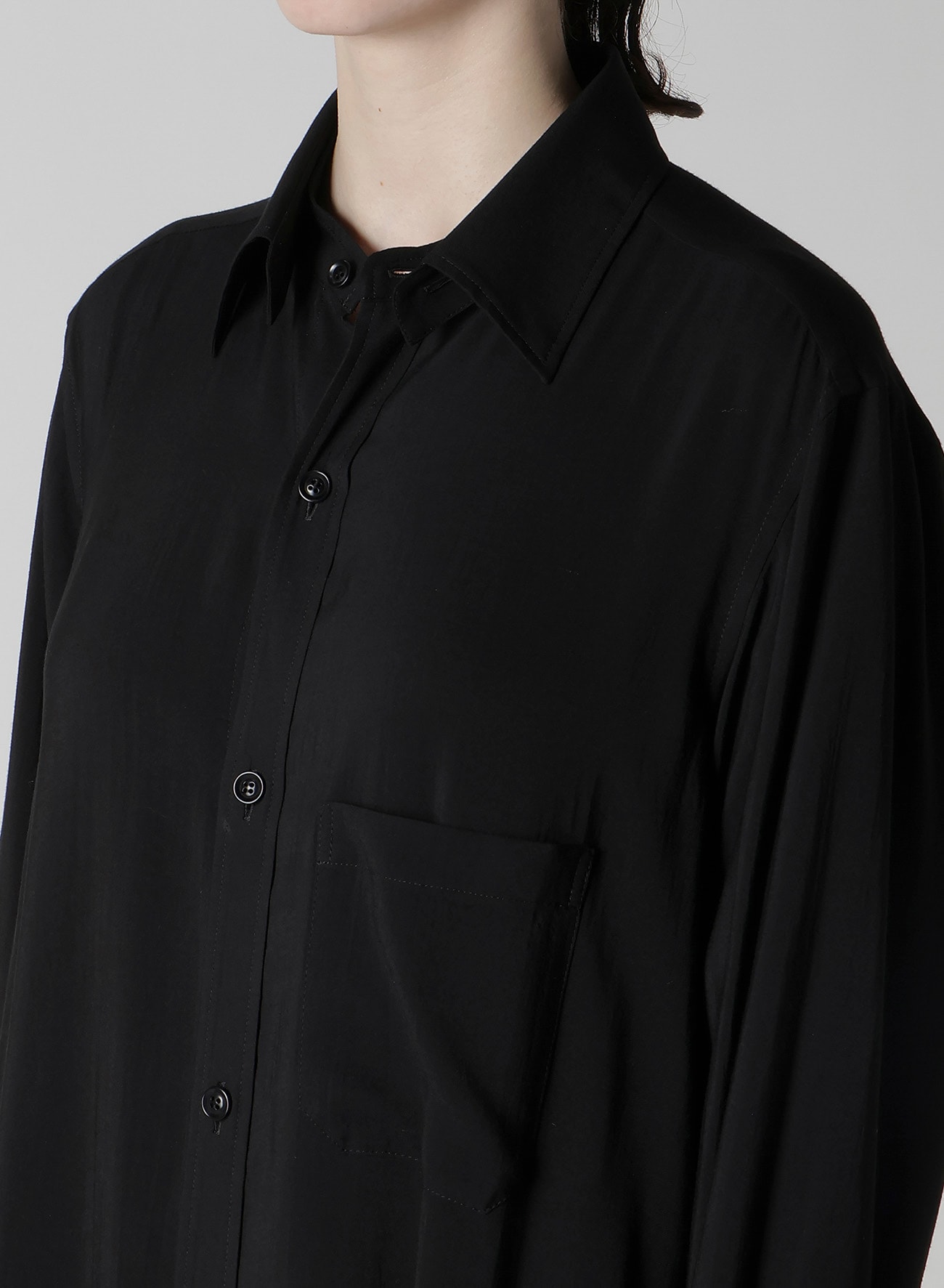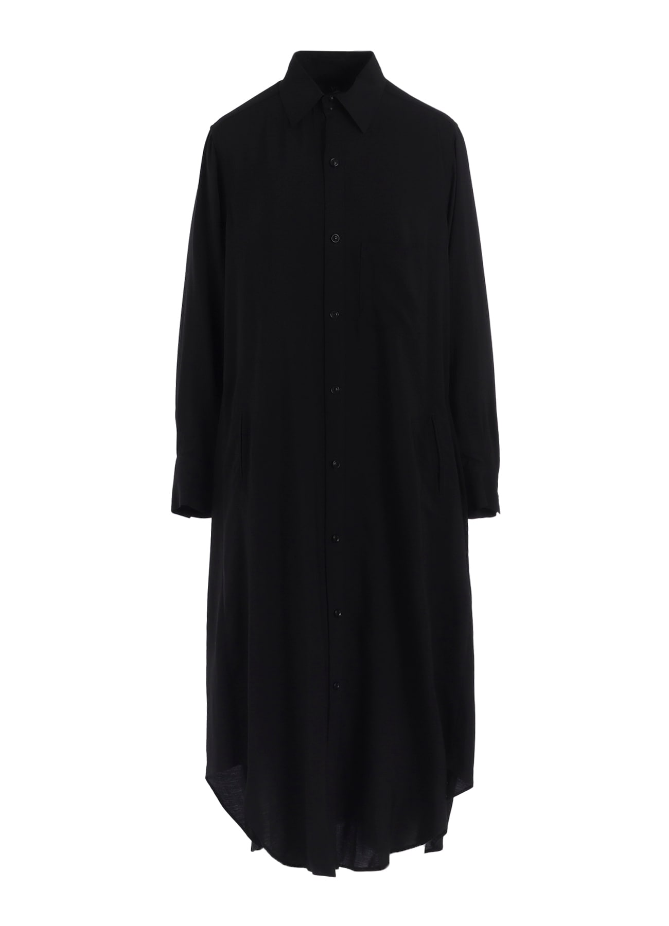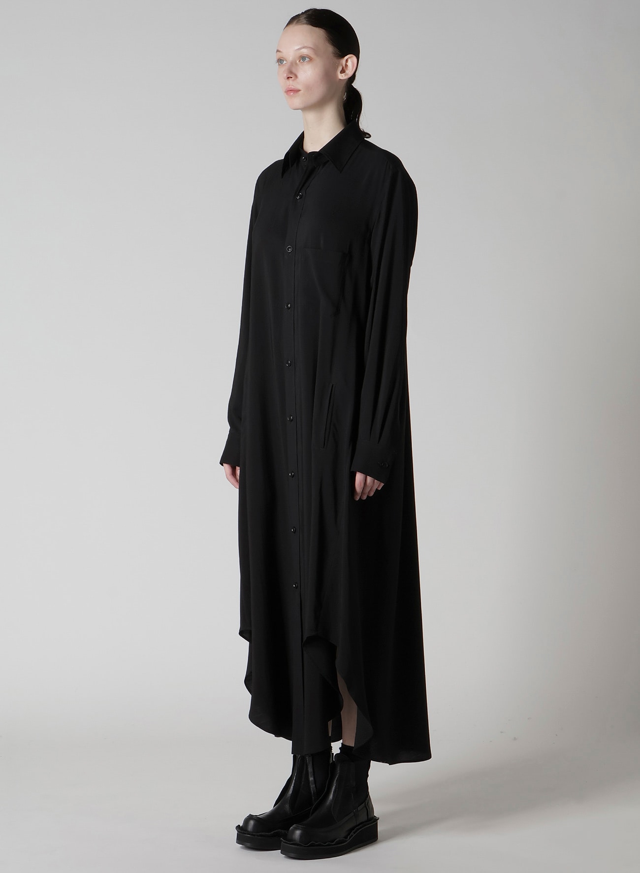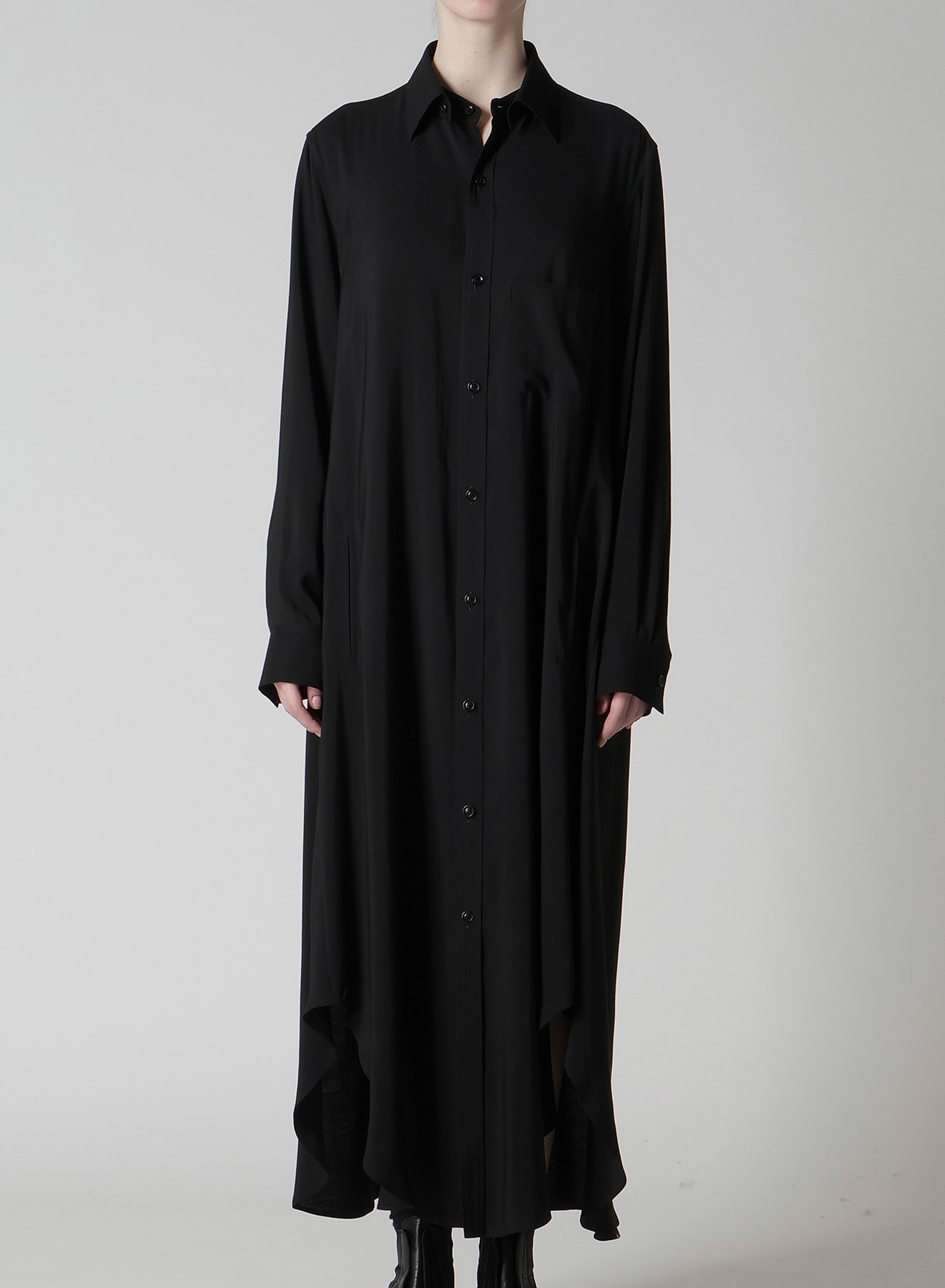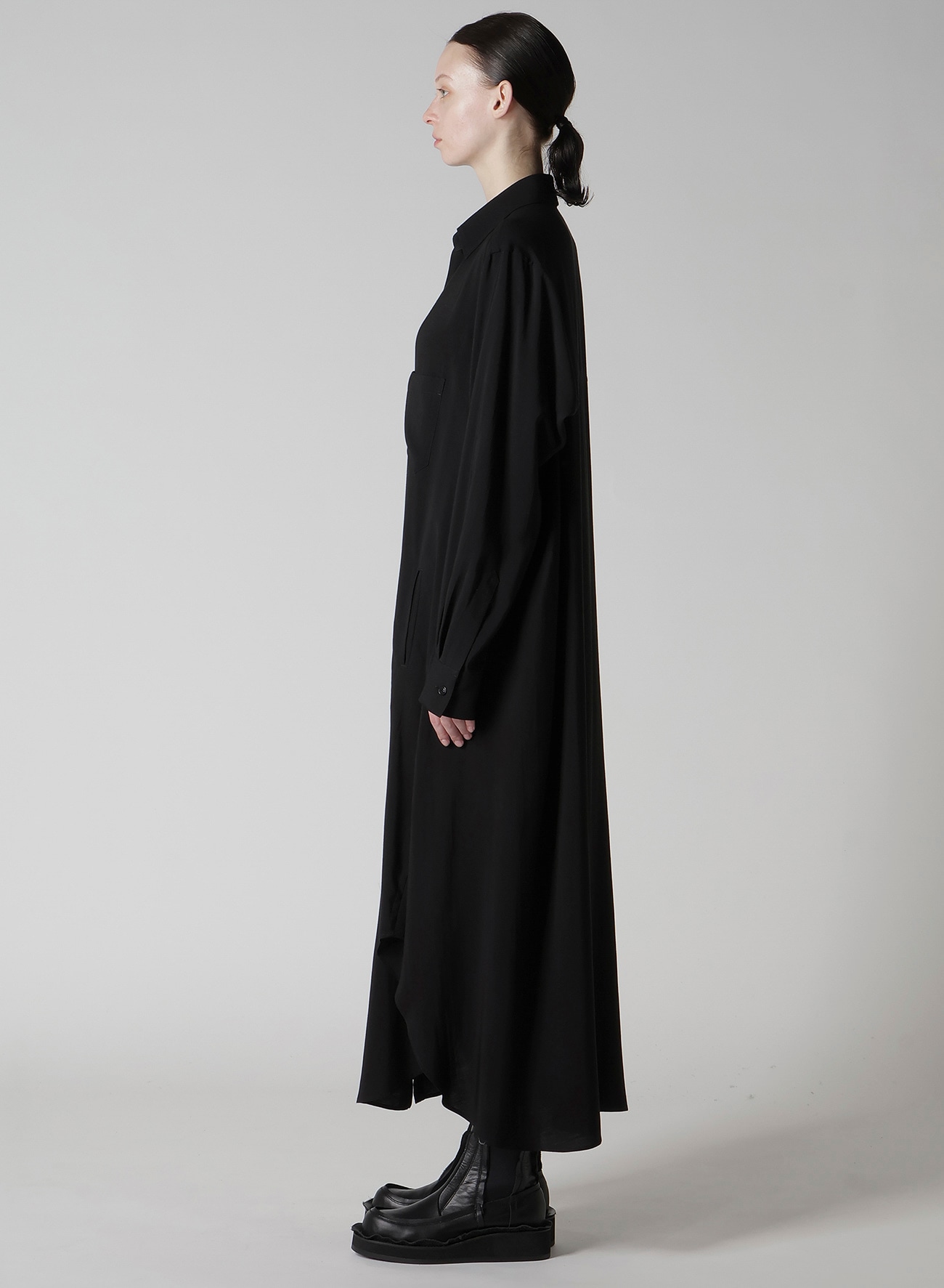 シャツカラーのIラインドレス。しなやかでドレープ感の強いキュプラとレーヨンの生地に、サーキュラー染色機を用いて濃度のある黒を表現し、天日で自然な風合いに仕上げています。一枚でドレスとしてはもちろん、ボタンを開けて羽織としてお召しいただけます。