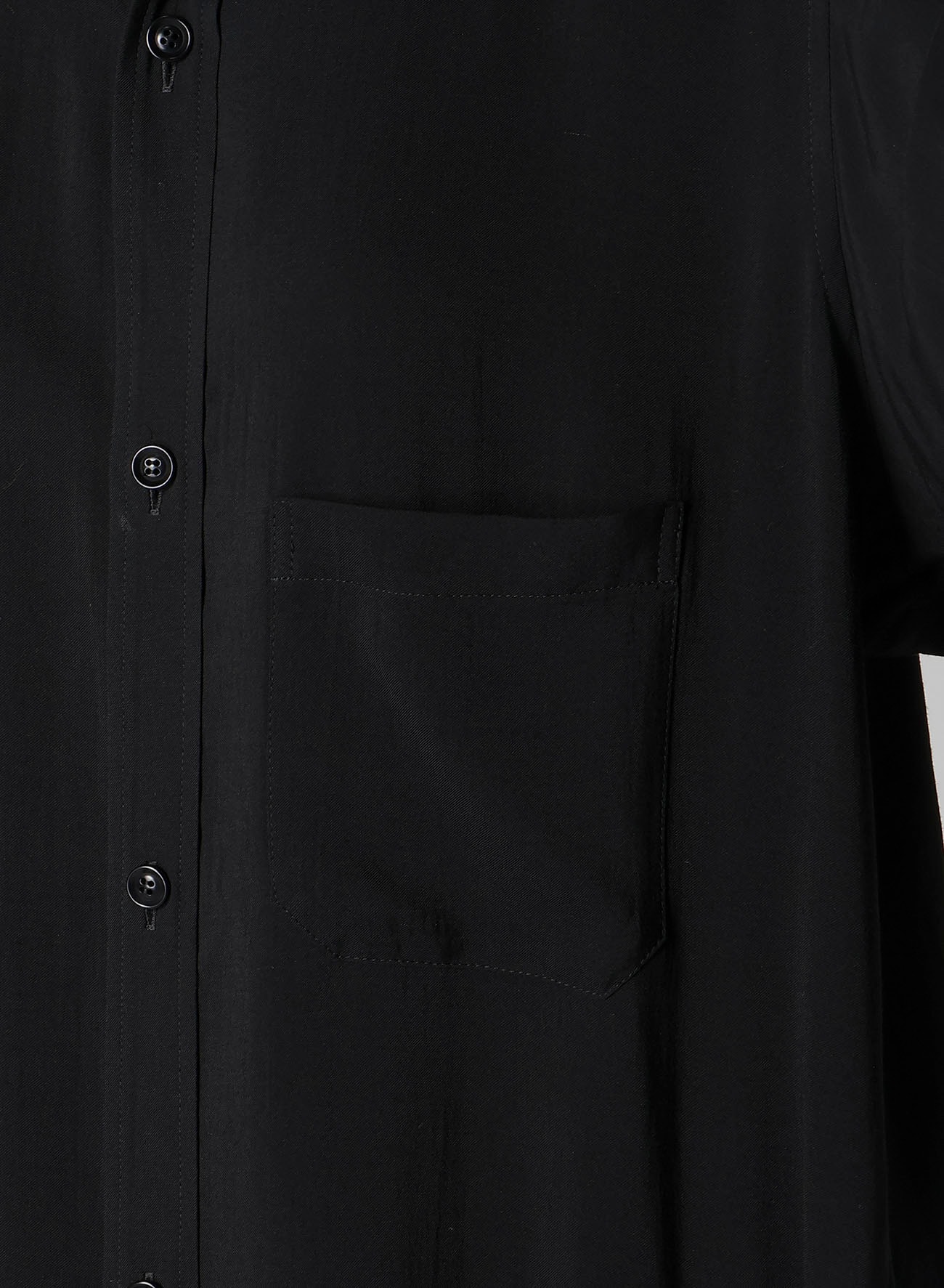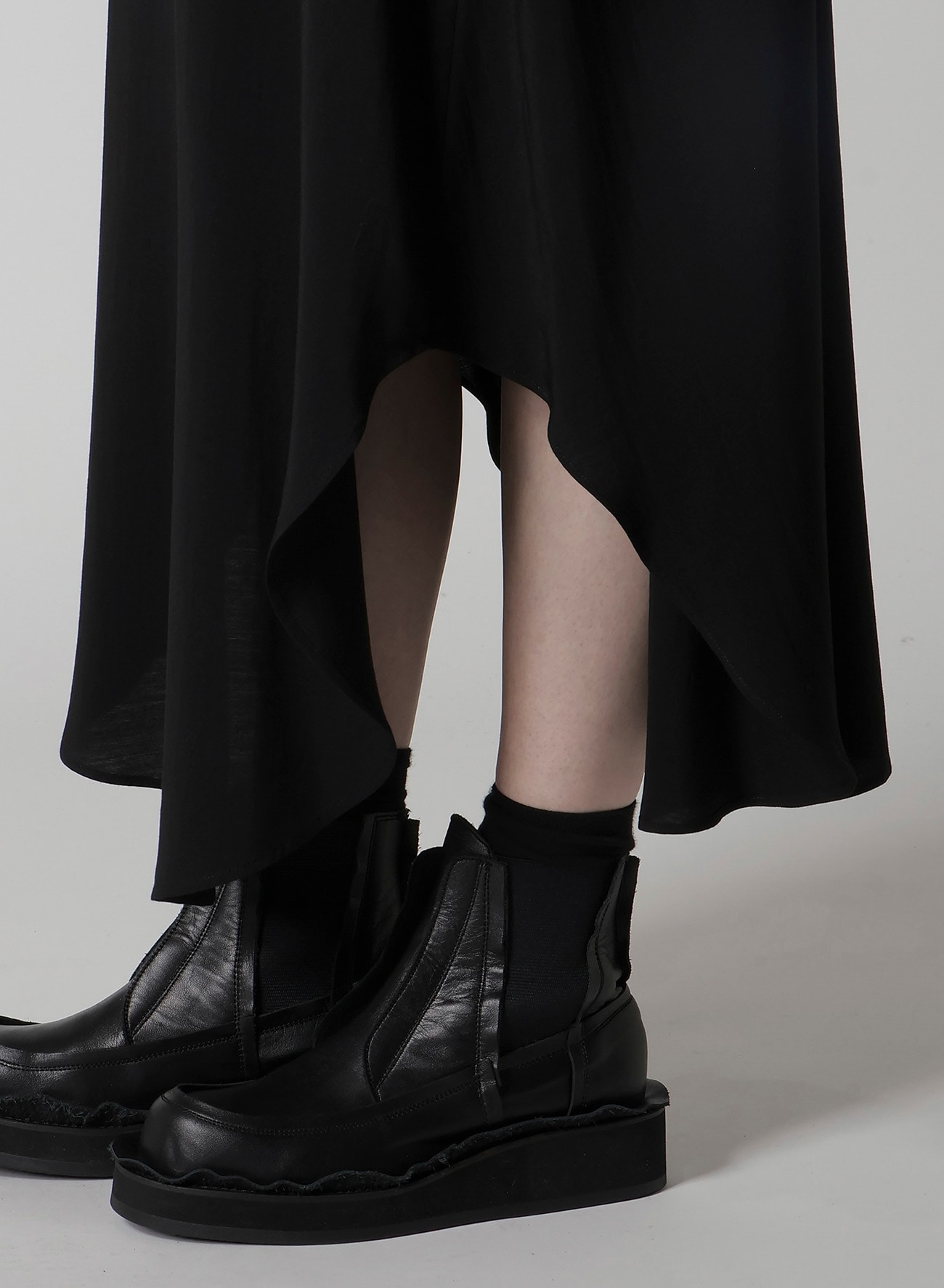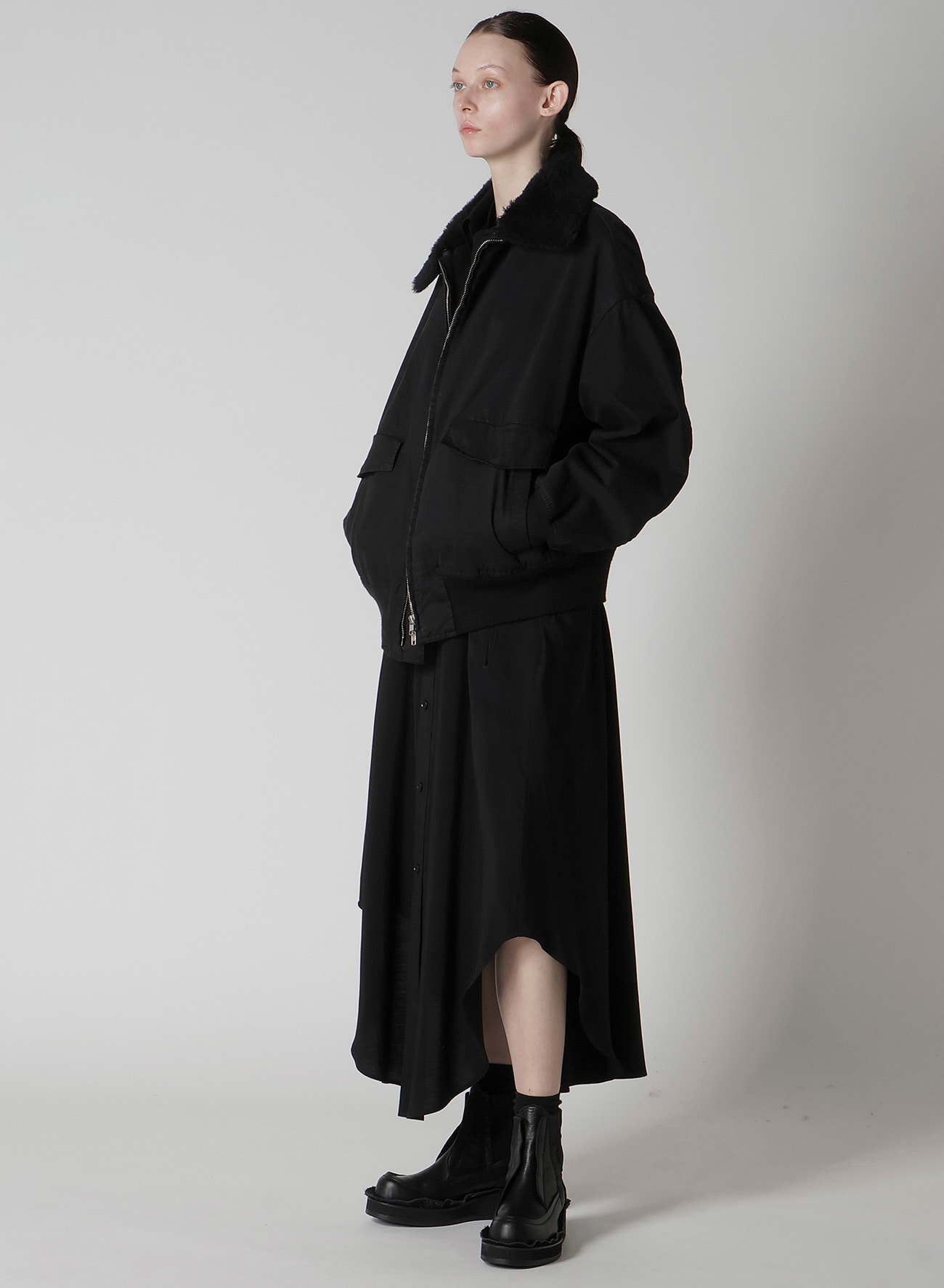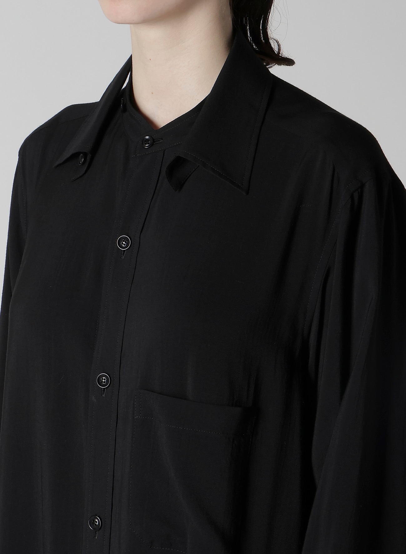 シャツカラーのIラインドレス。しなやかでドレープ感の強いキュプラとレーヨンの生地に、サーキュラー染色機を用いて濃度のある黒を表現し、天日で自然な風合いに仕上げています。一枚でドレスとしてはもちろん、ボタンを開けて羽織としてお召しいただけます。