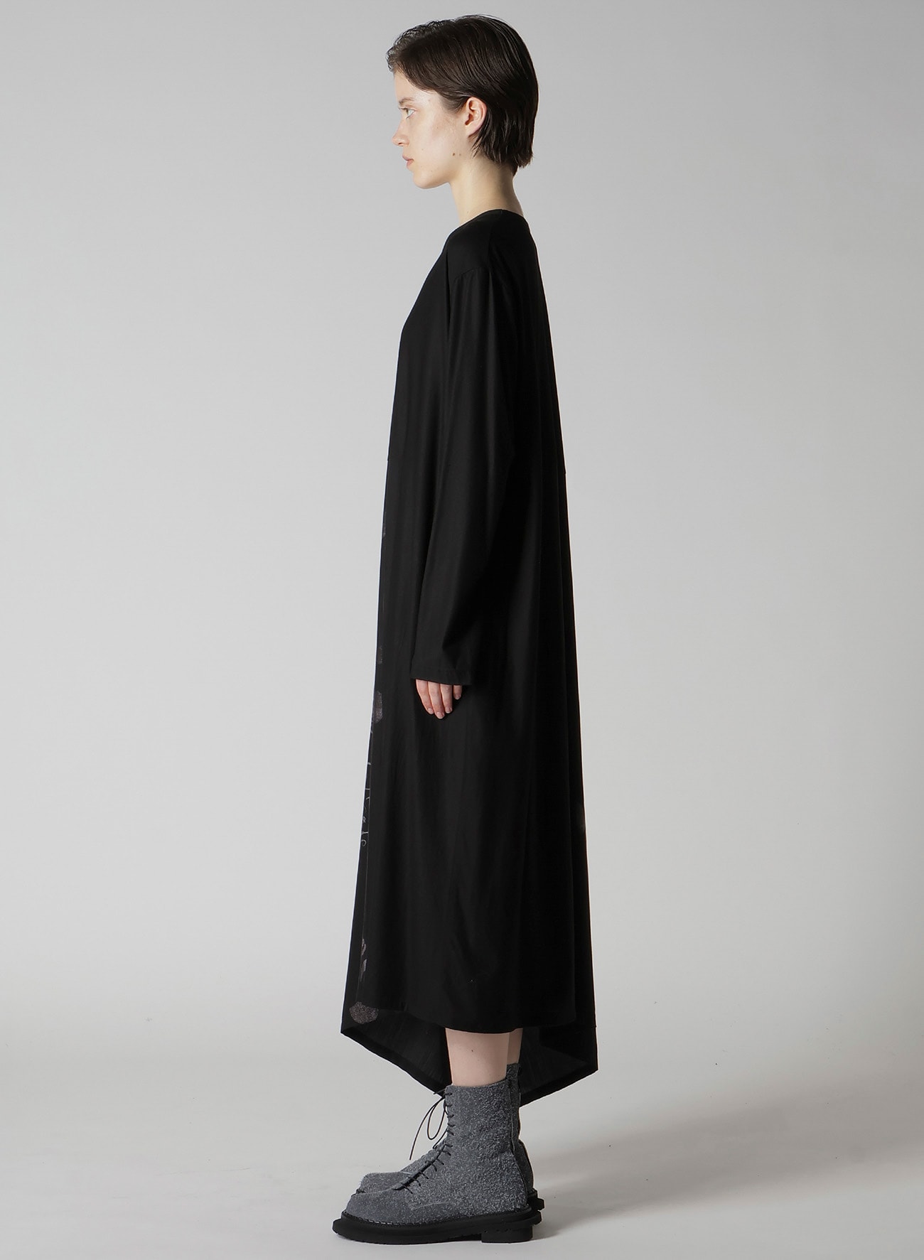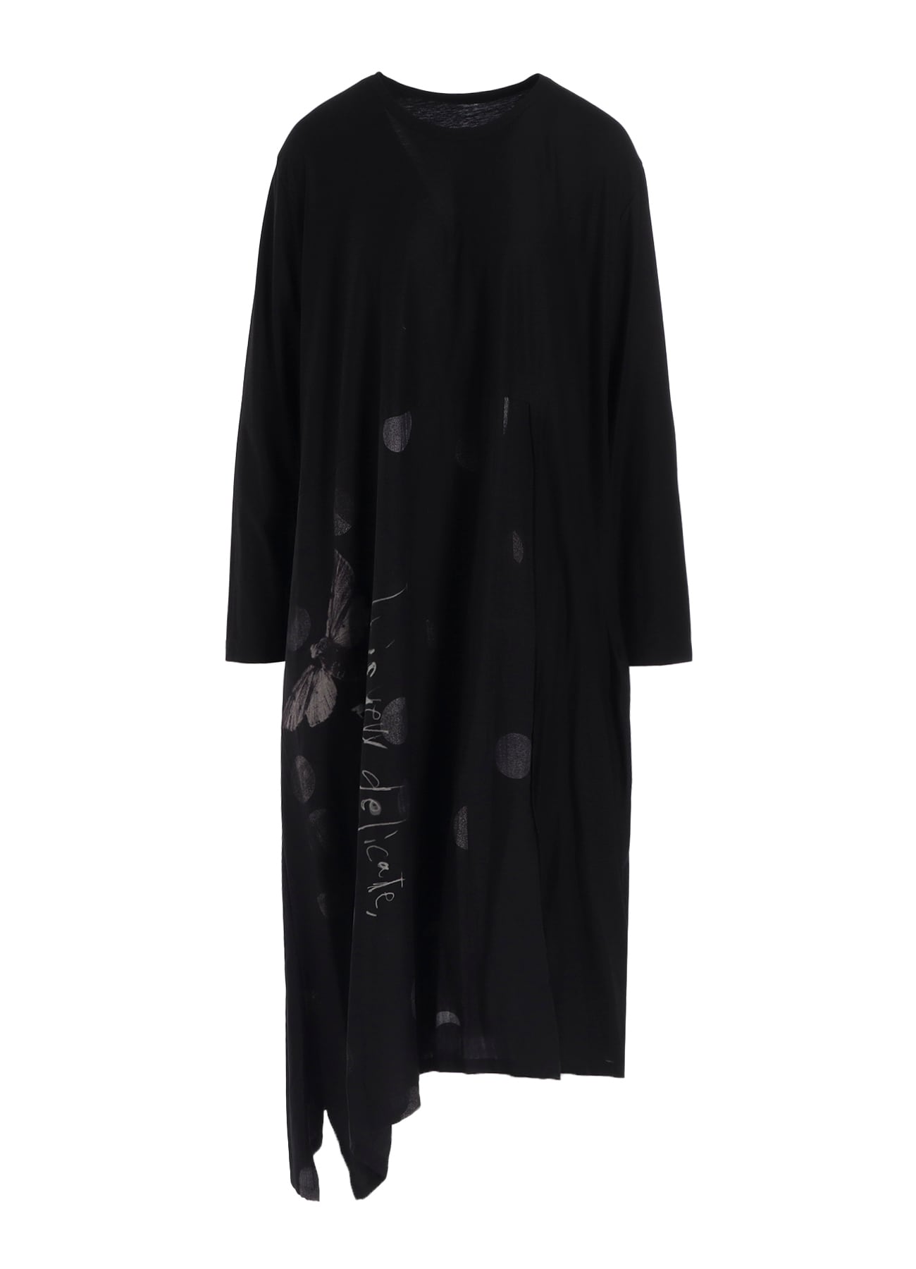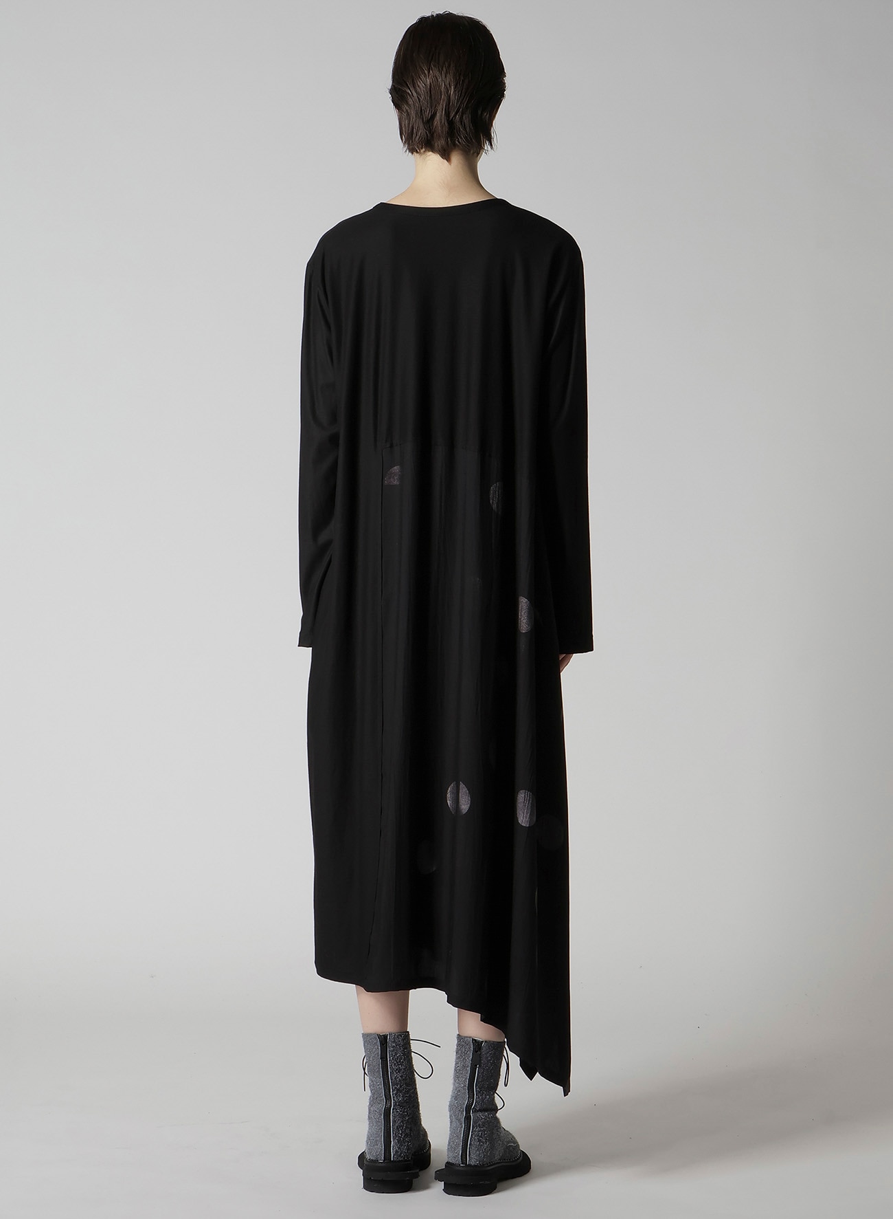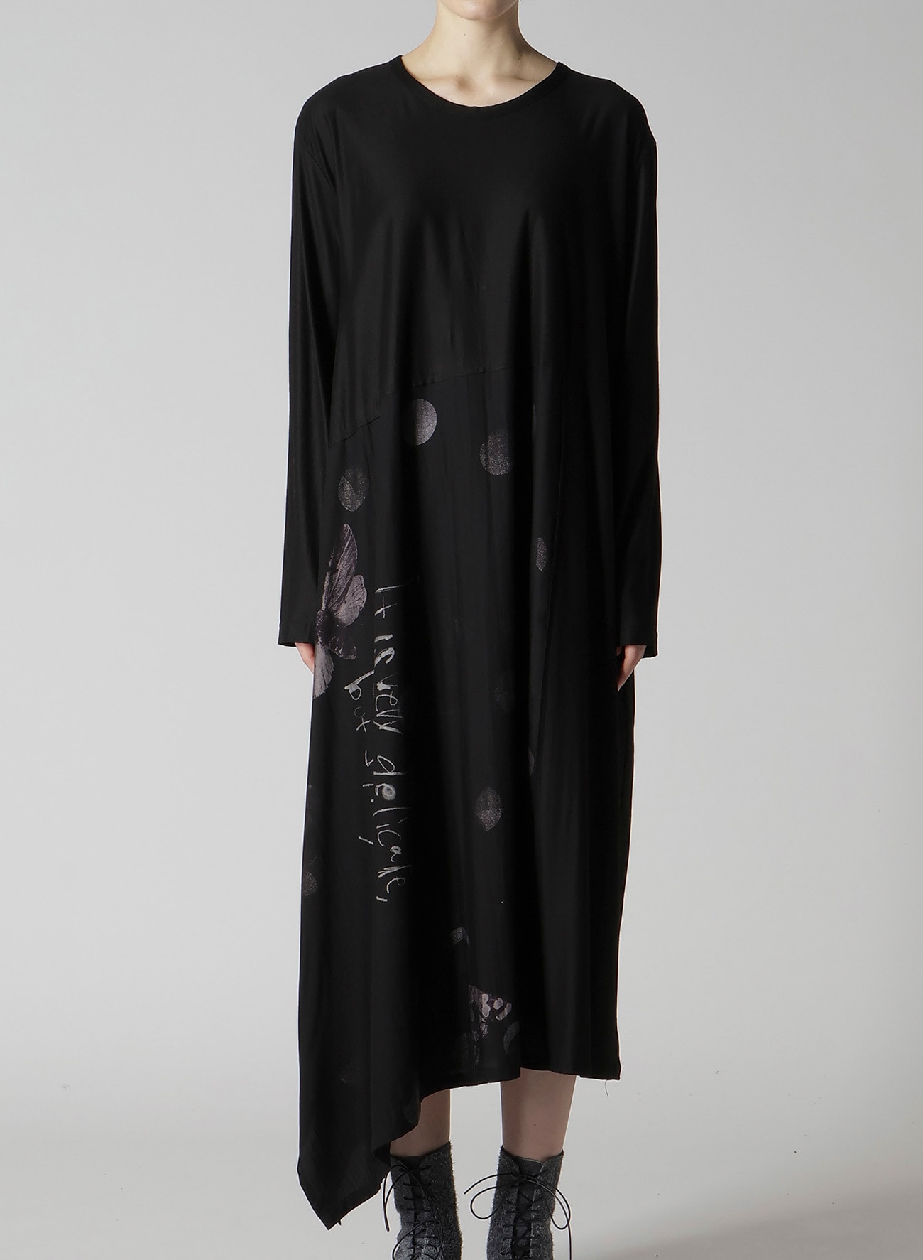 長袖のアシンメトリードレス。水玉柄に蝶が集まってくるイメージと山本耀司の「t's very delicate, but strong(繊細でありながらも力強く)」というメッセージで構成されたデザイン。なめらかなキュプラの生地にハイゲージで目面が美しいソフトな風合いの生地を組み合わせています。