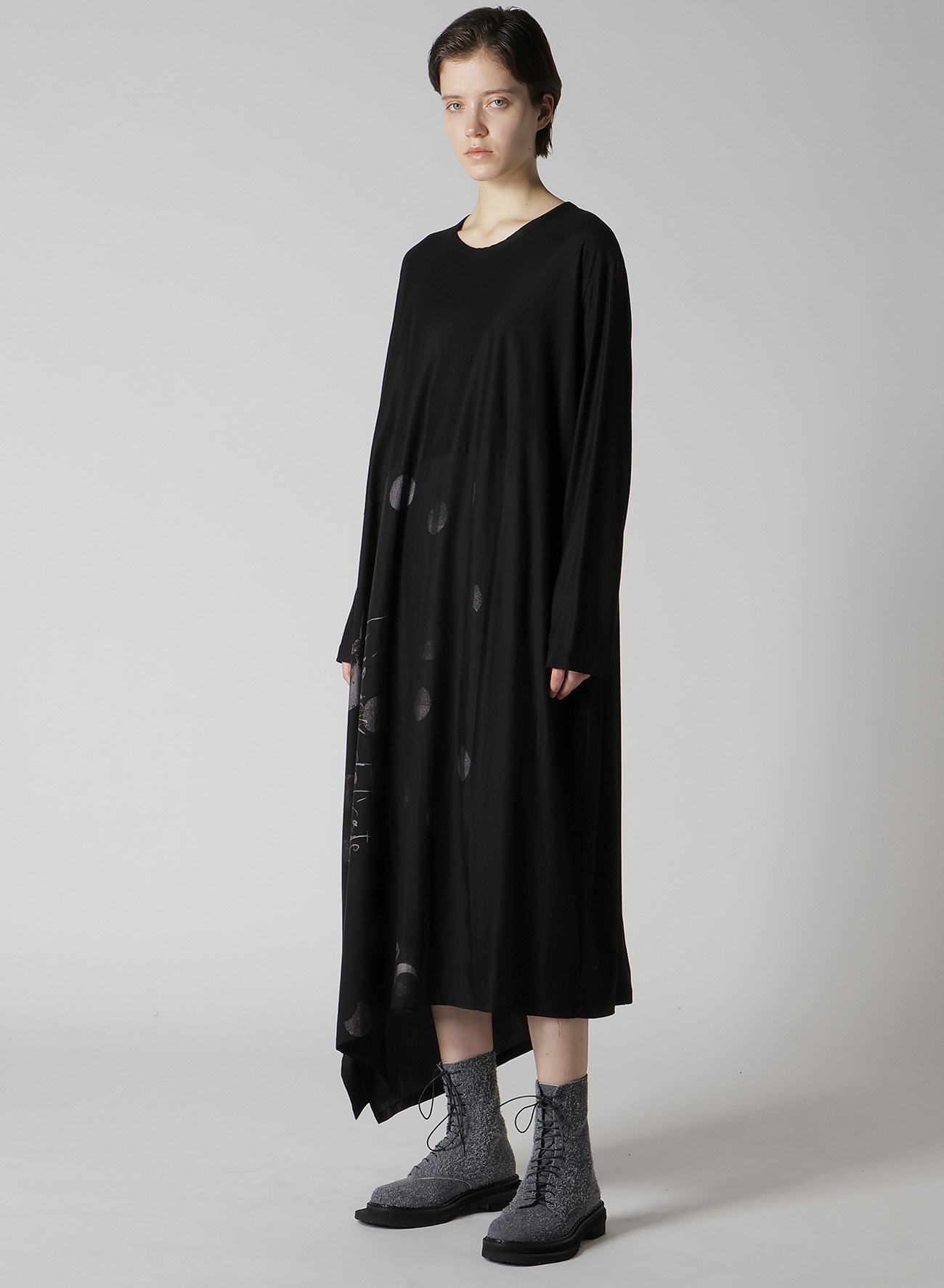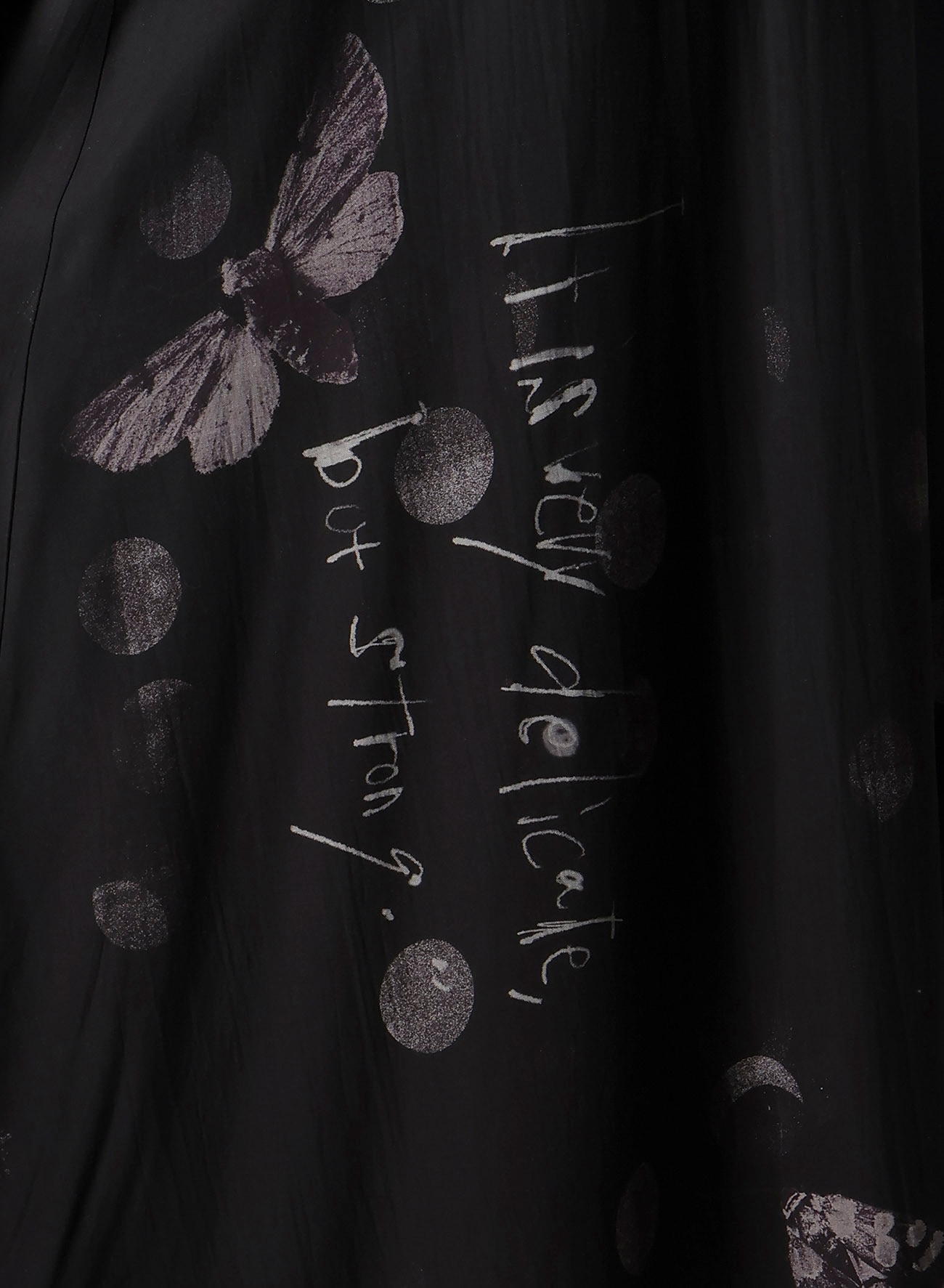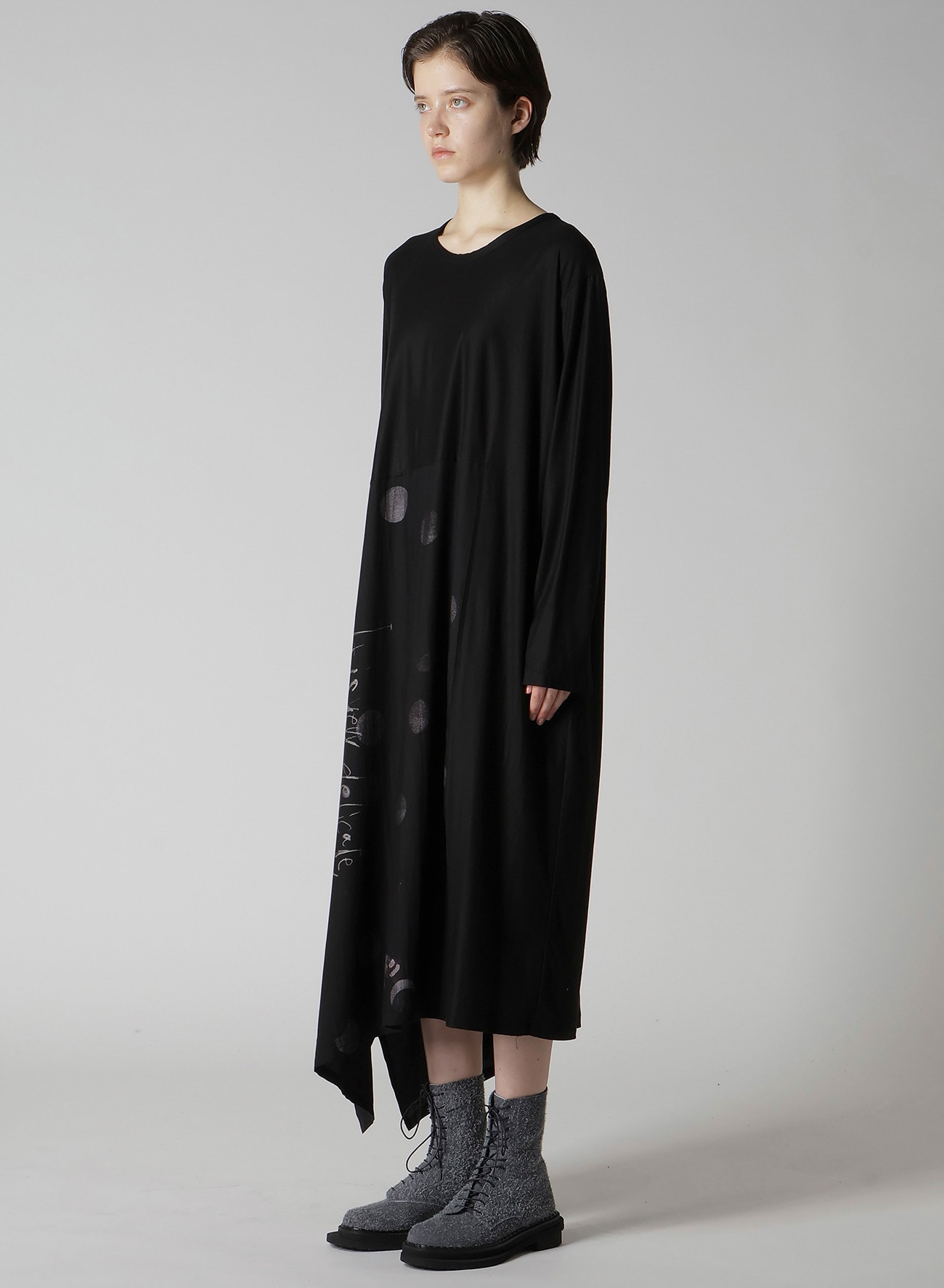 長袖のアシンメトリードレス。水玉柄に蝶が集まってくるイメージと山本耀司の「t's very delicate, but strong(繊細でありながらも力強く)」というメッセージで構成されたデザイン。なめらかなキュプラの生地にハイゲージで目面が美しいソフトな風合いの生地を組み合わせています。