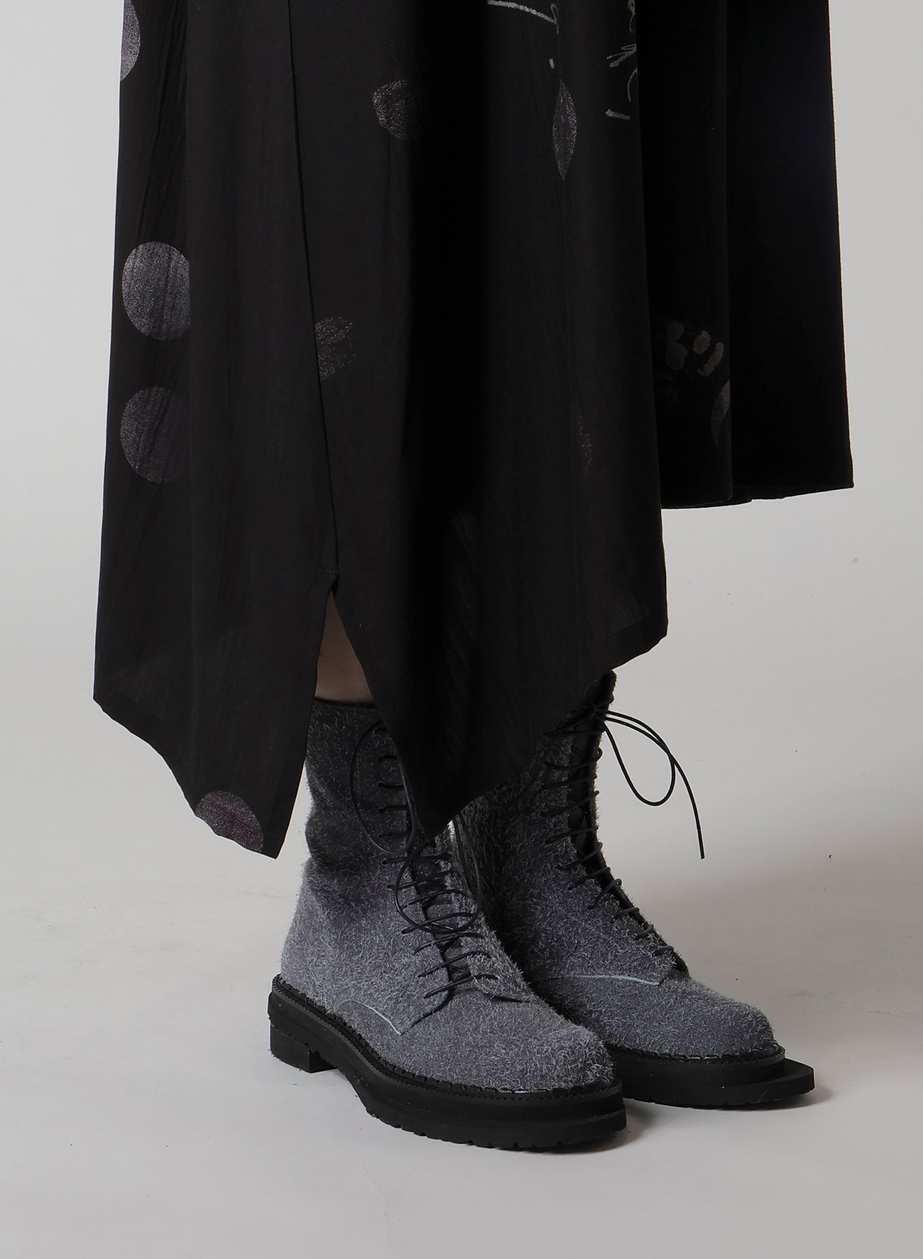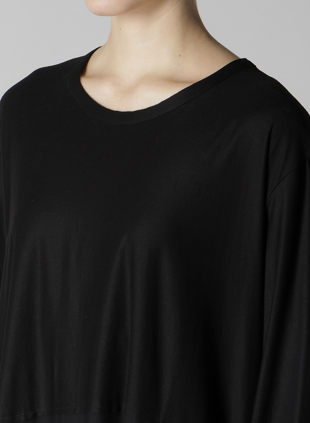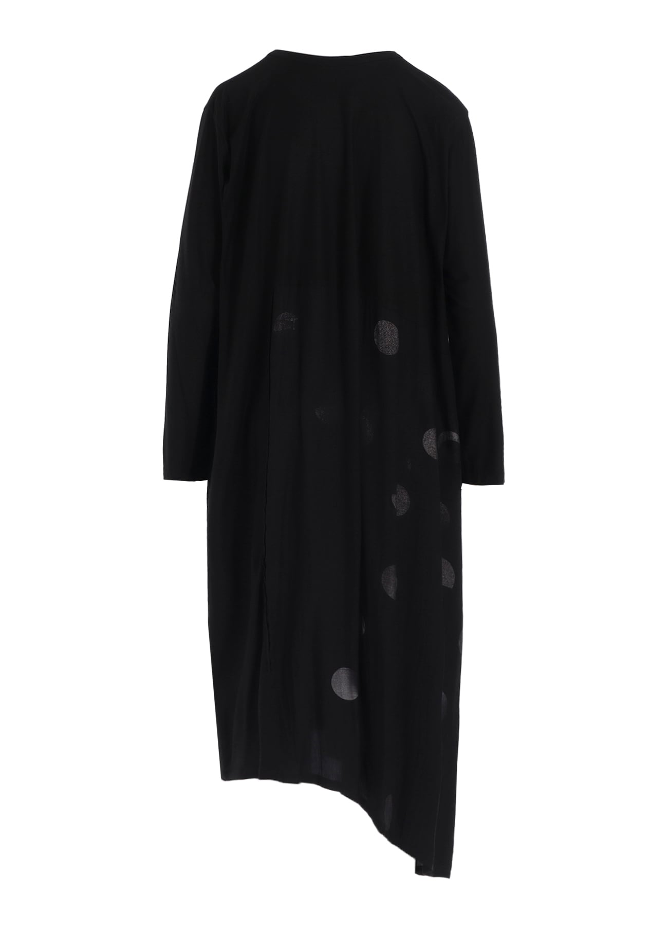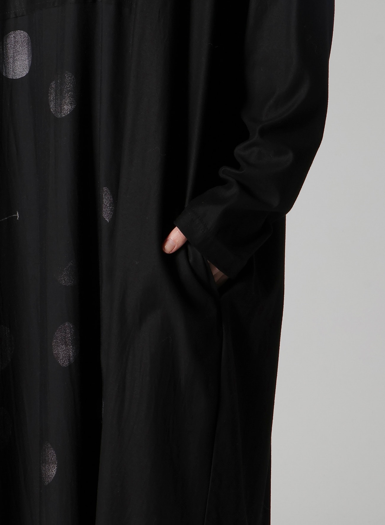 長袖のアシンメトリードレス。水玉柄に蝶が集まってくるイメージと山本耀司の「t's very delicate, but strong(繊細でありながらも力強く)」というメッセージで構成されたデザイン。なめらかなキュプラの生地にハイゲージで目面が美しいソフトな風合いの生地を組み合わせています。