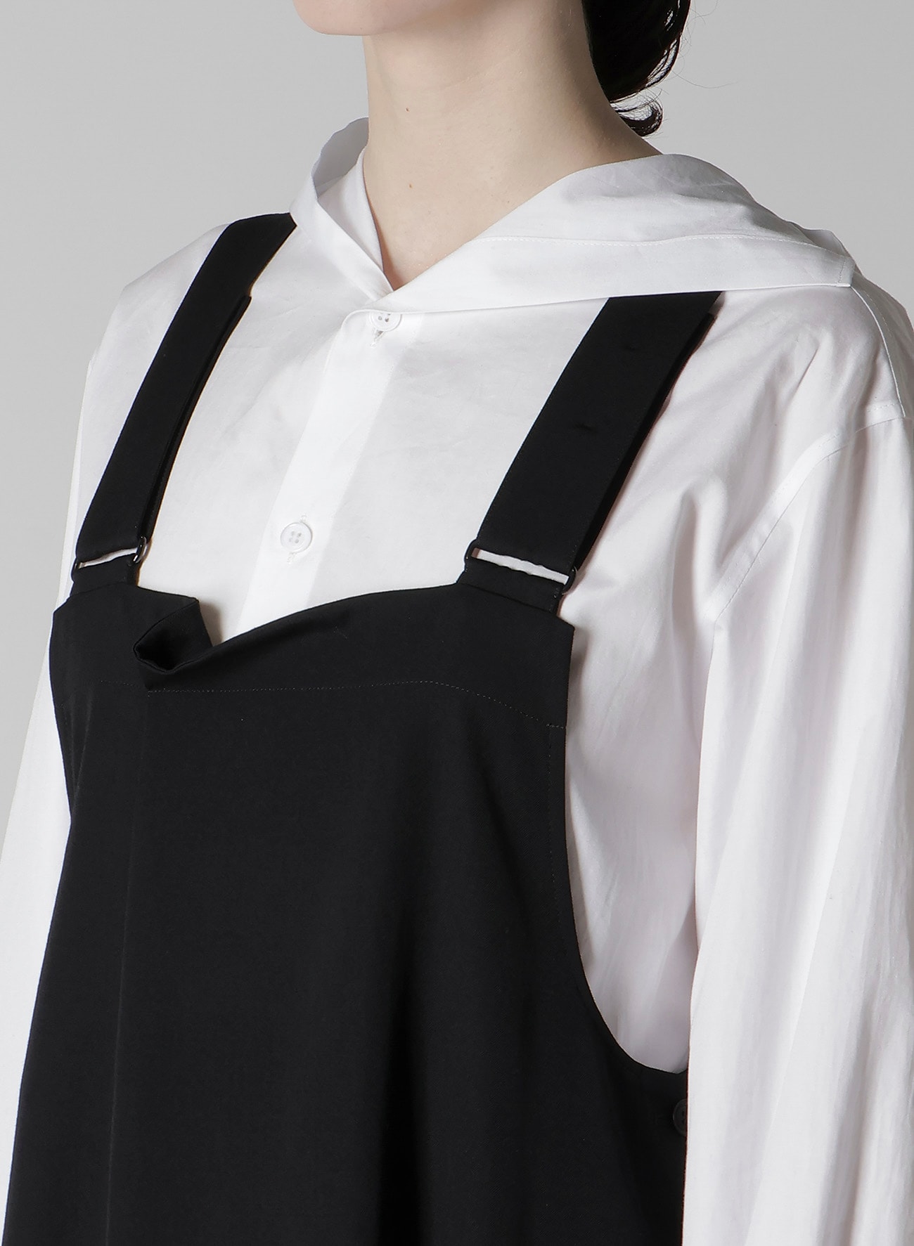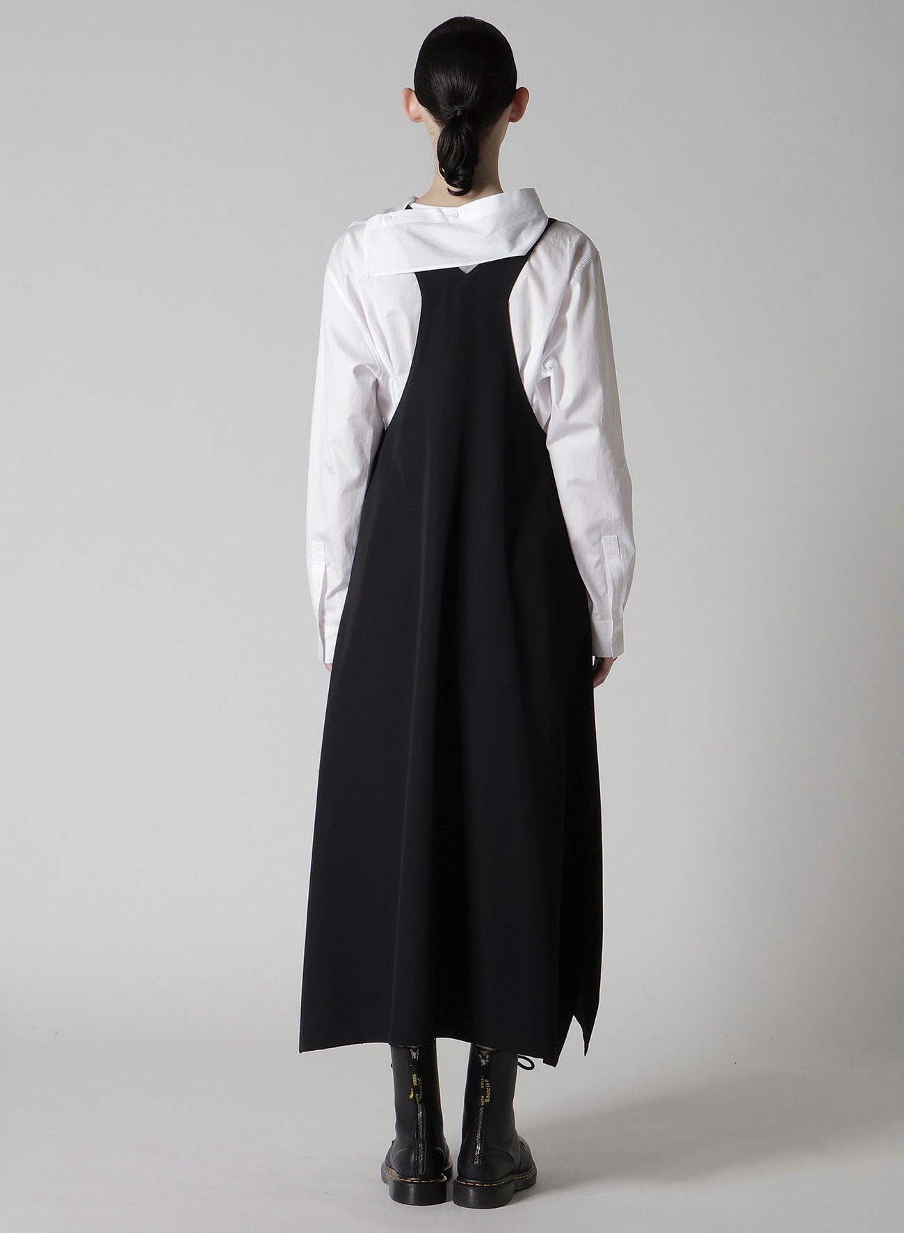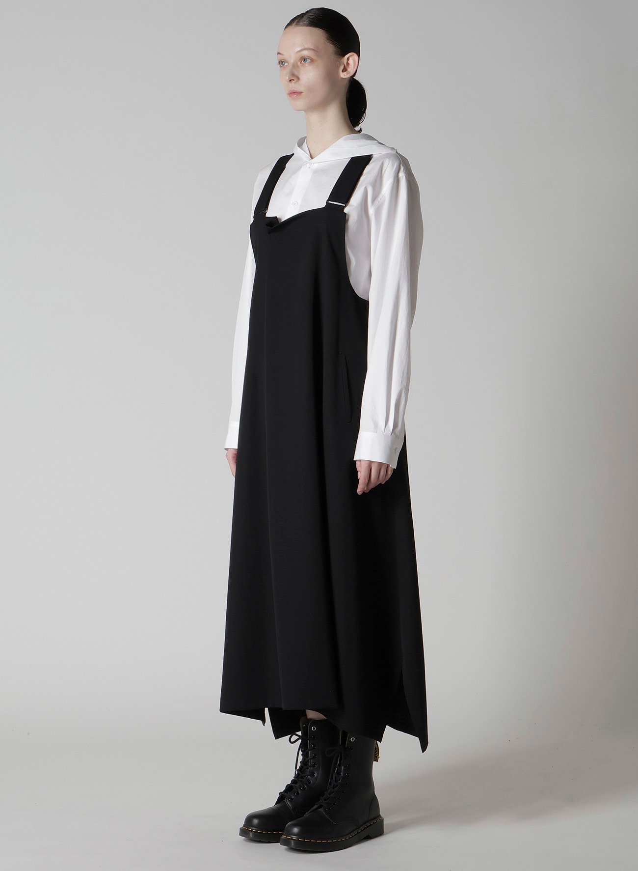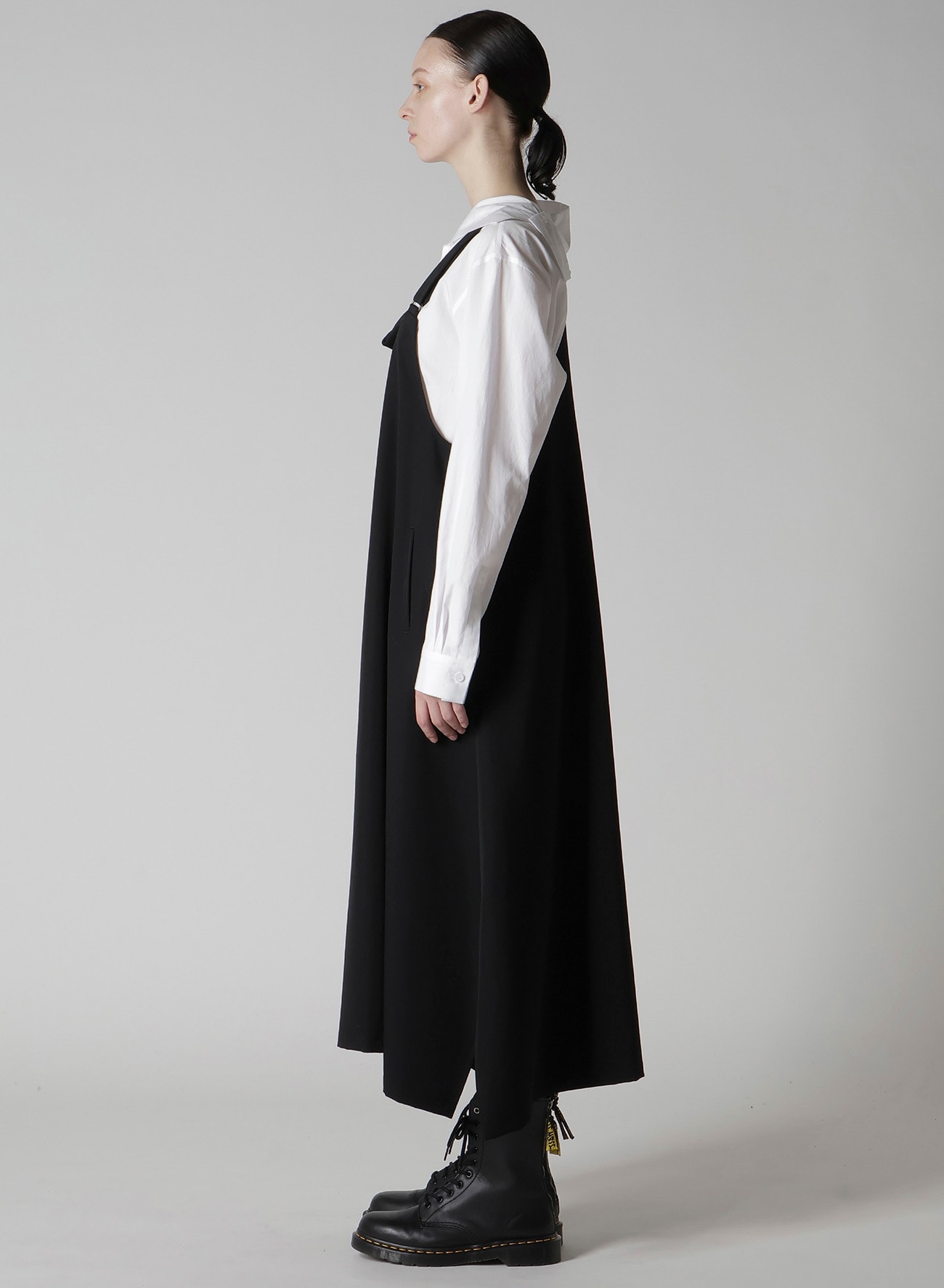 ワイズの代表的な素材、ウールギャバジンを使用したオーバーオール型のワンピース。生地の仕上げ工程で織物に軽くシワやシボを付け、ウール本来の風合いに仕上げています。ゆったりとしたワイズらしいシルエットがポイントです。ブラウスやカットソーにあわせたレイヤードスタイルをお楽しみいただけます。