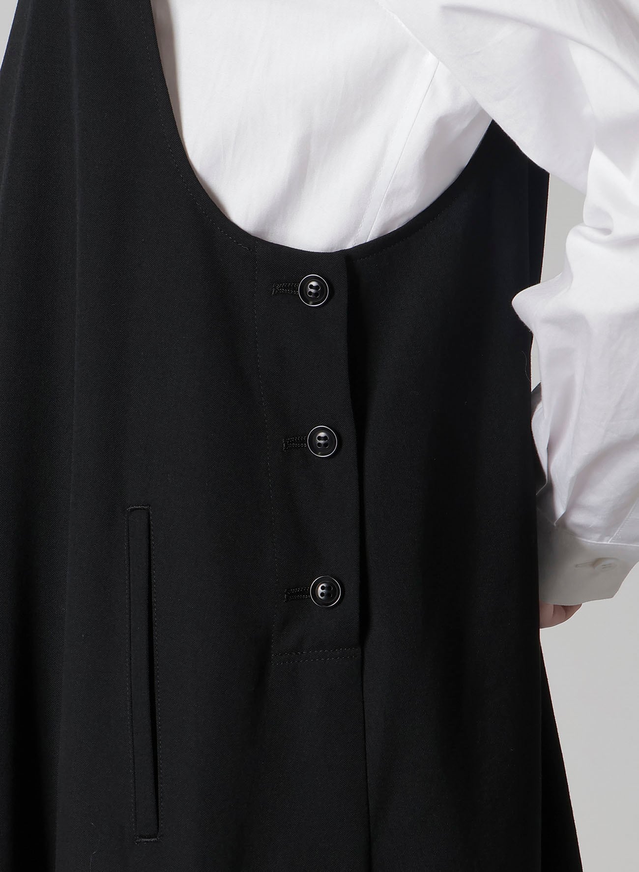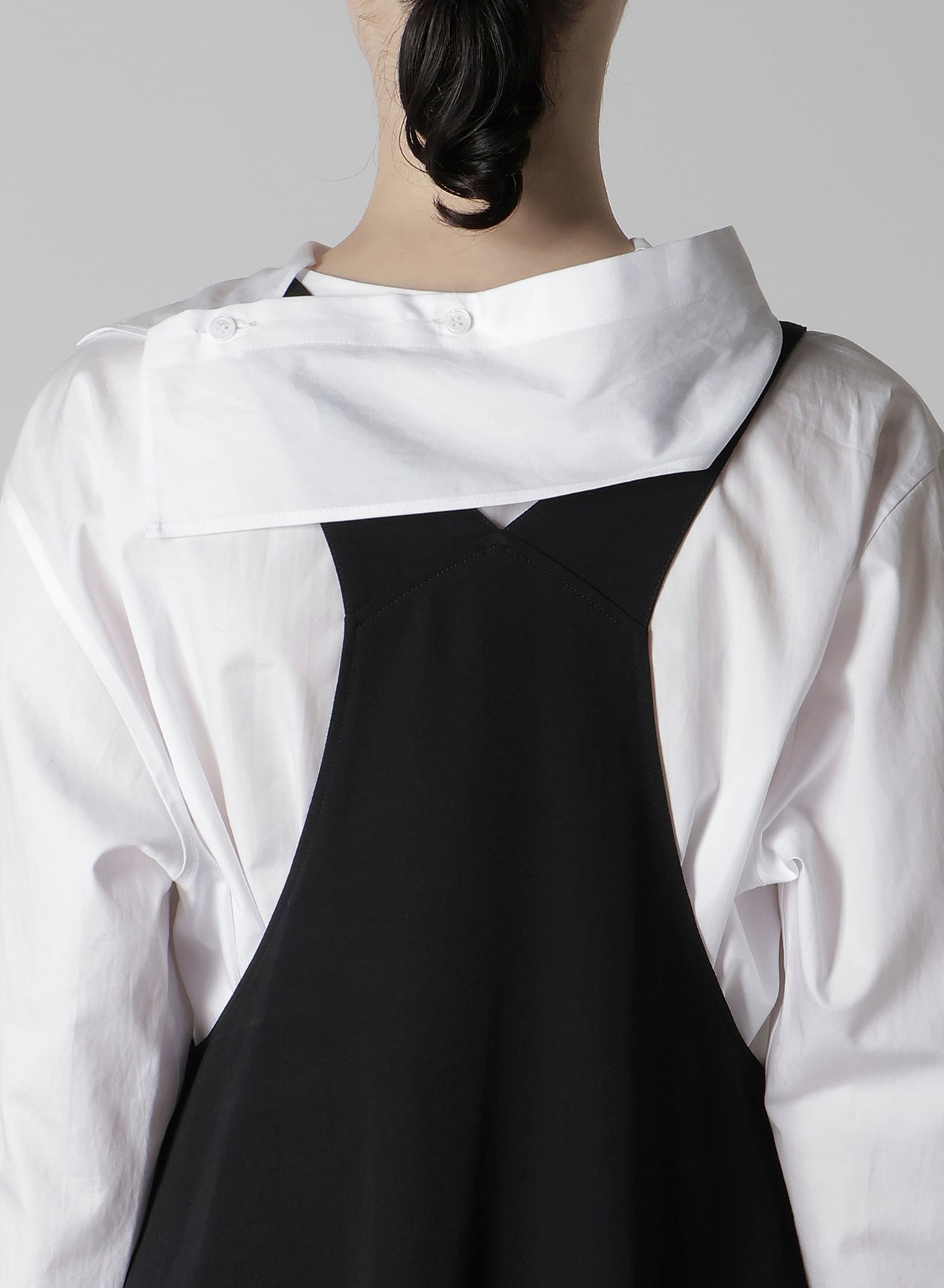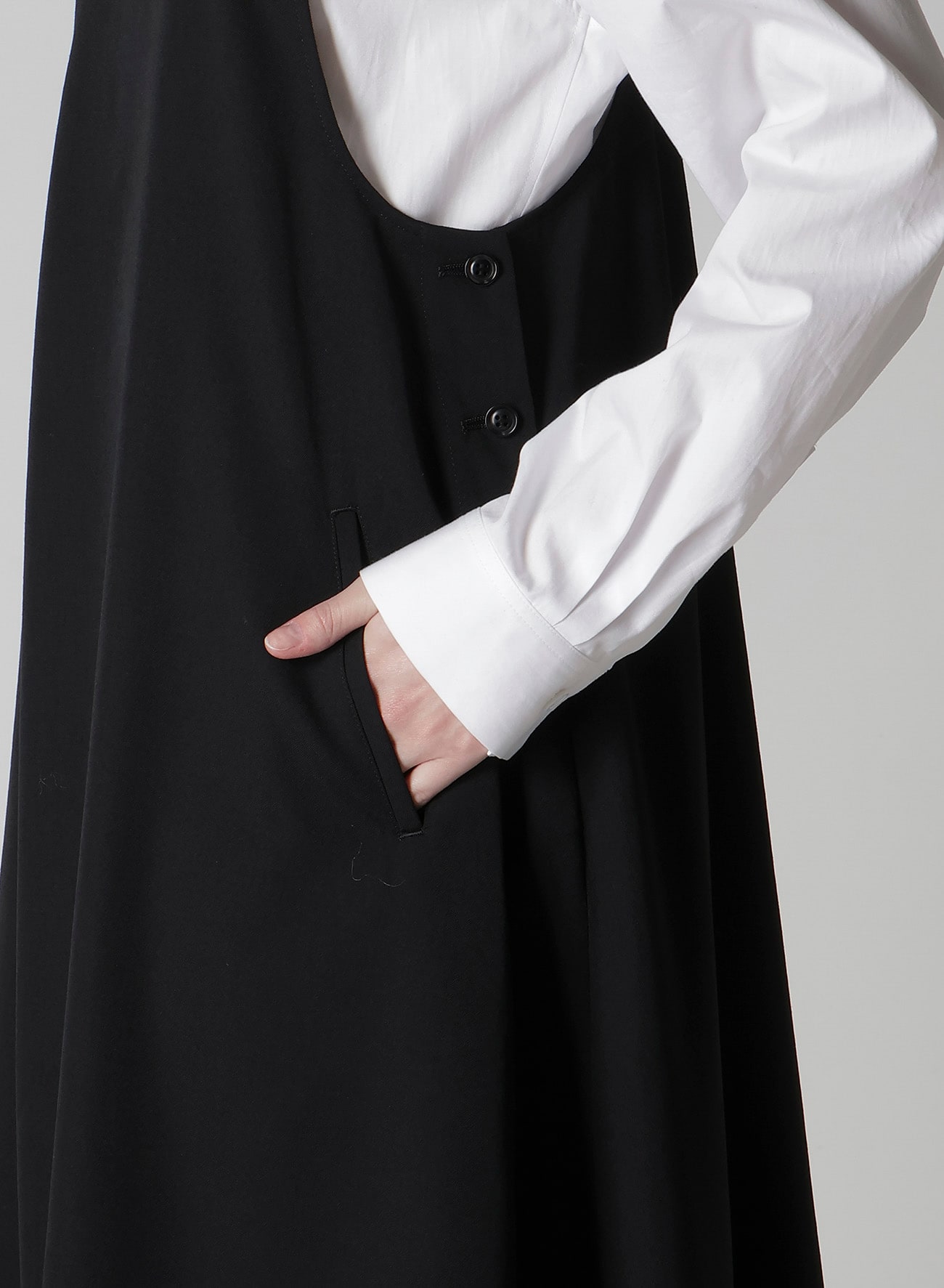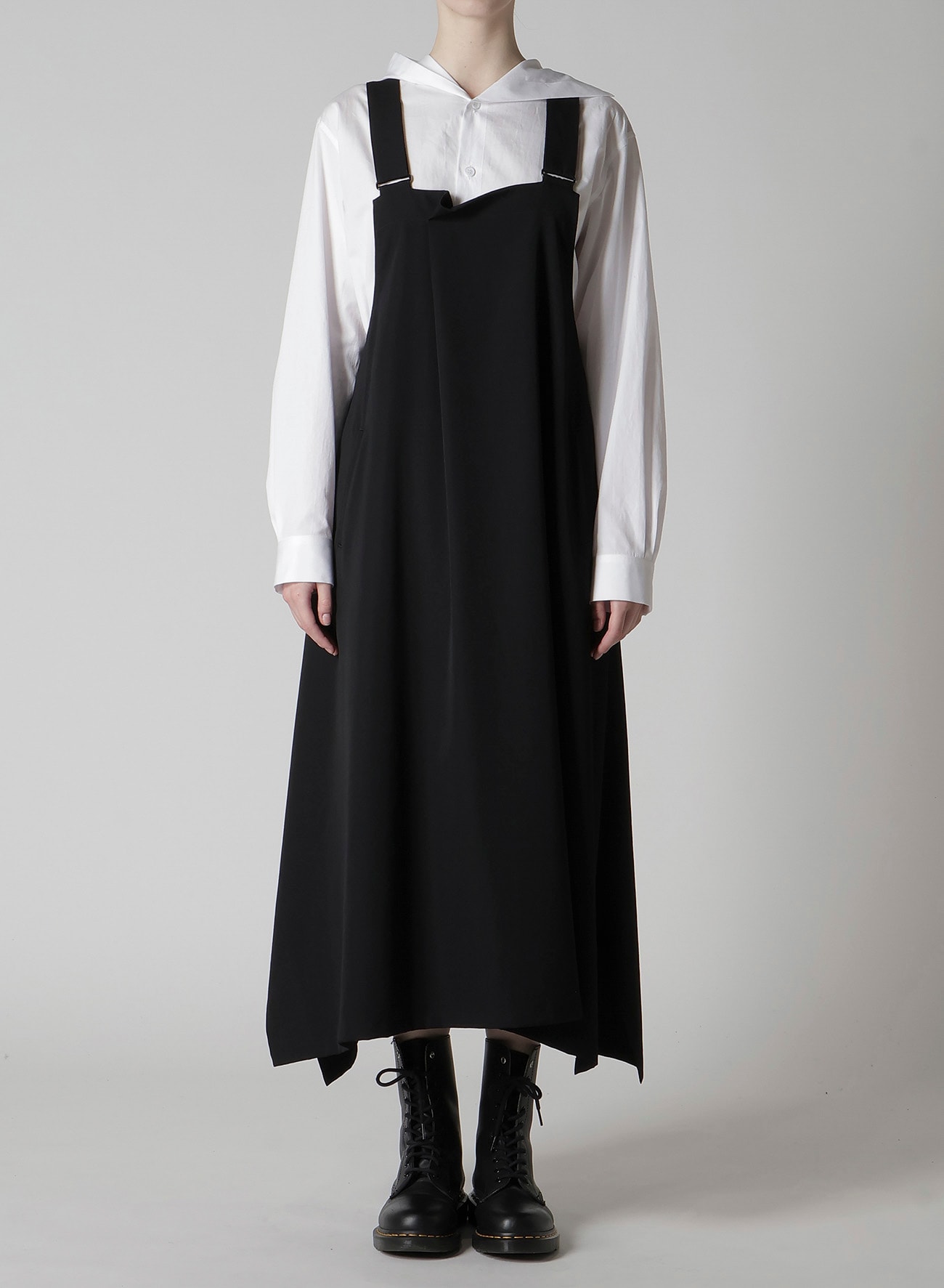 ワイズの代表的な素材、ウールギャバジンを使用したオーバーオール型のワンピース。生地の仕上げ工程で織物に軽くシワやシボを付け、ウール本来の風合いに仕上げています。ゆったりとしたワイズらしいシルエットがポイントです。ブラウスやカットソーにあわせたレイヤードスタイルをお楽しみいただけます。