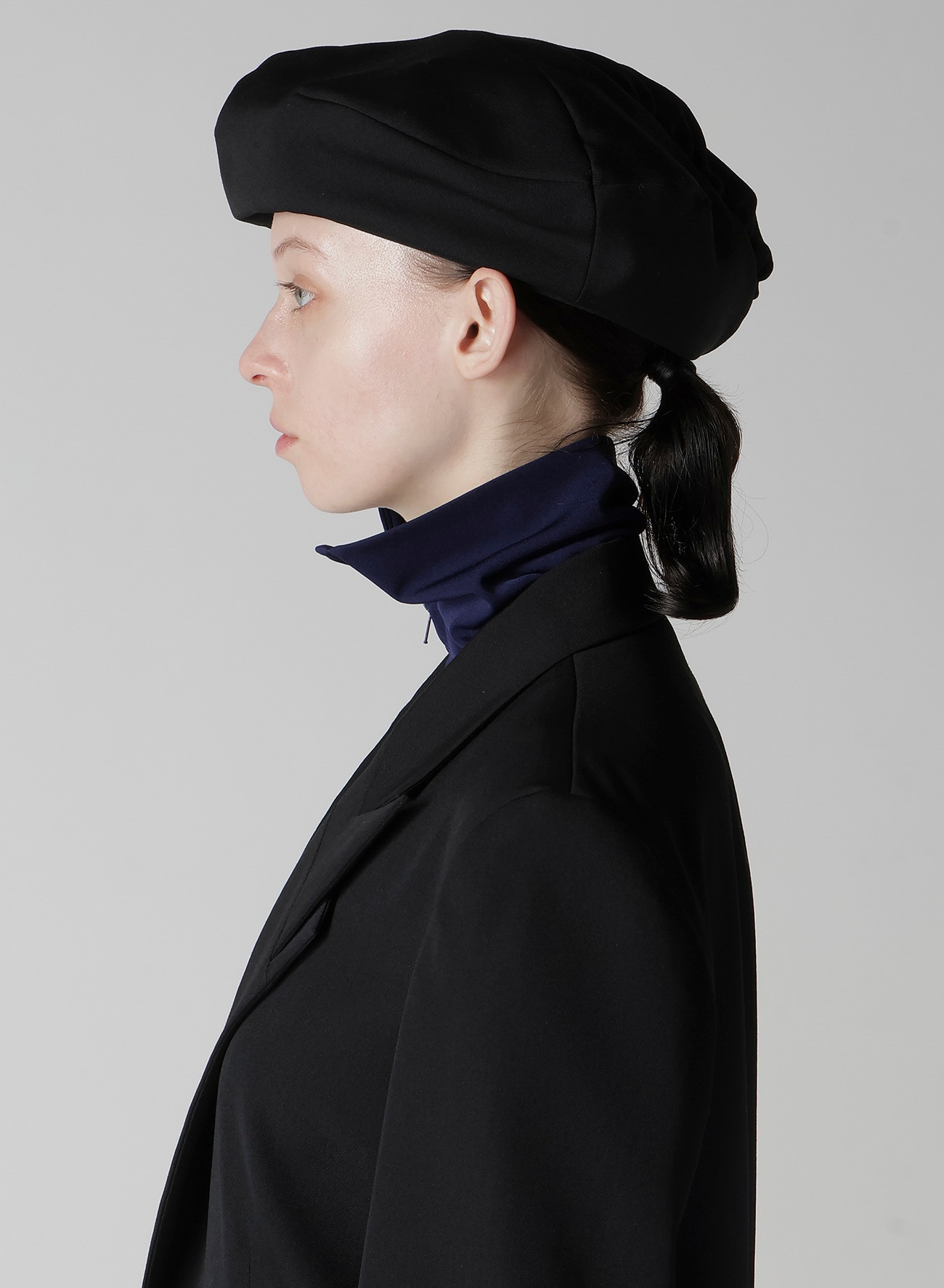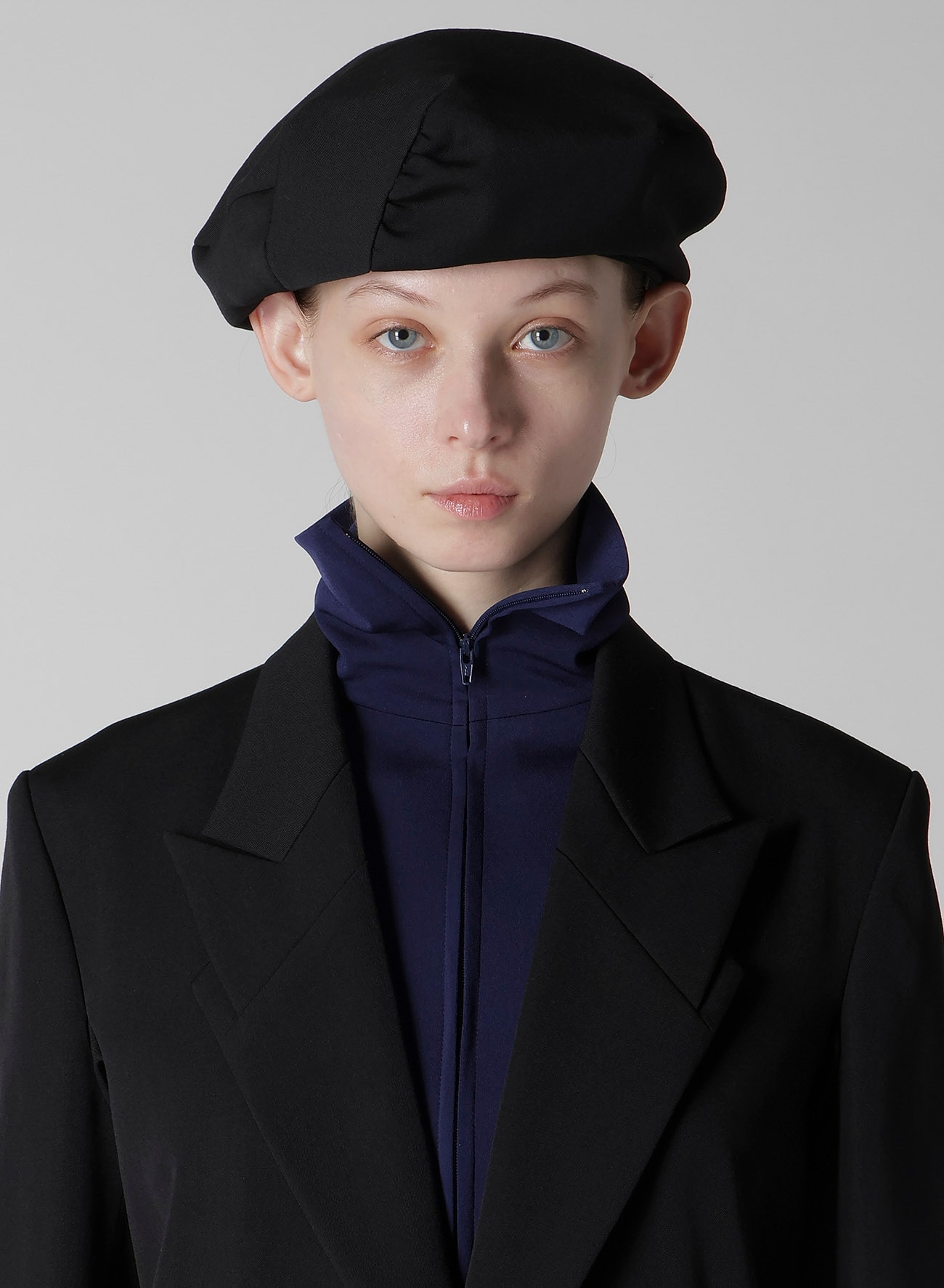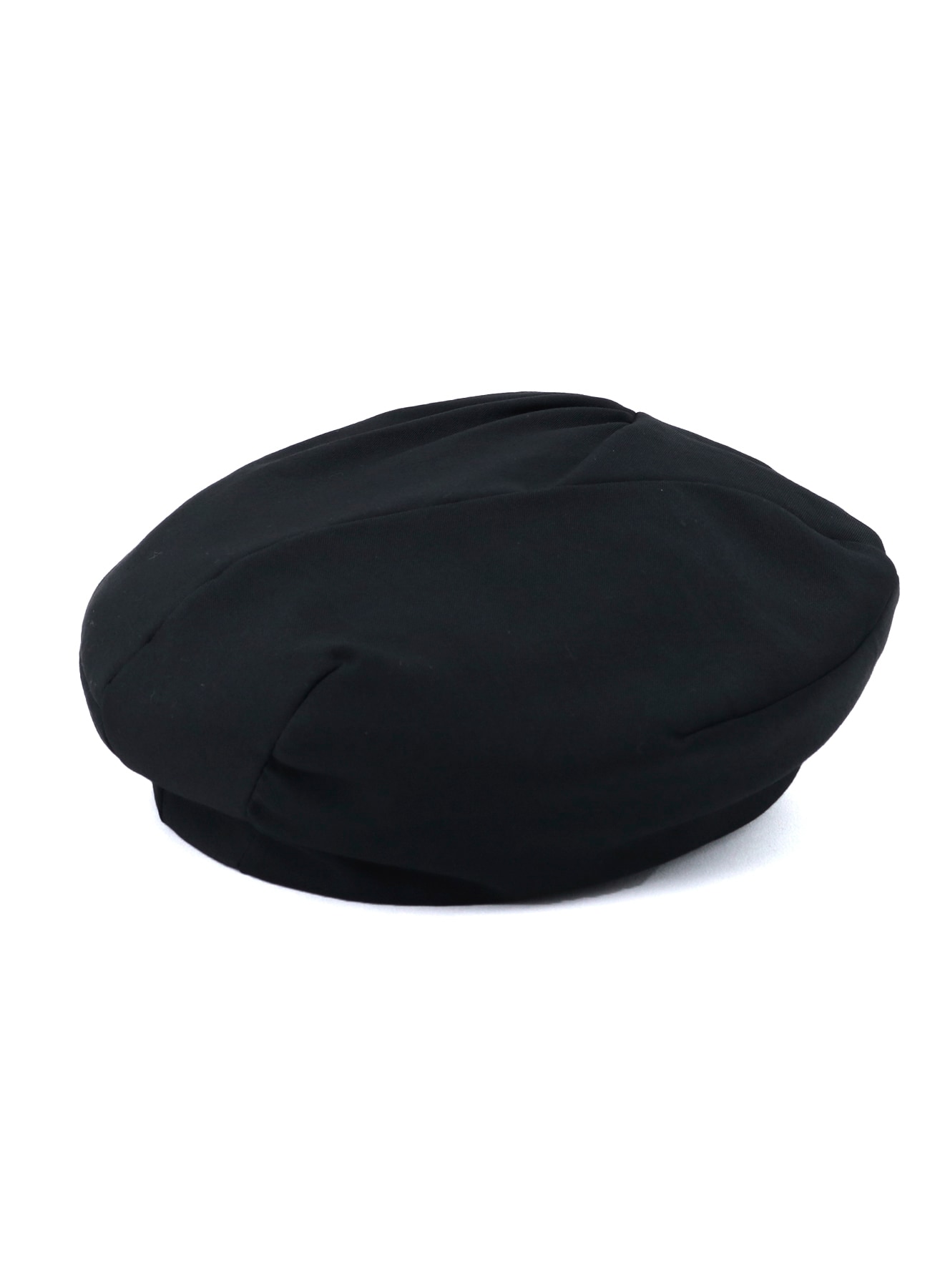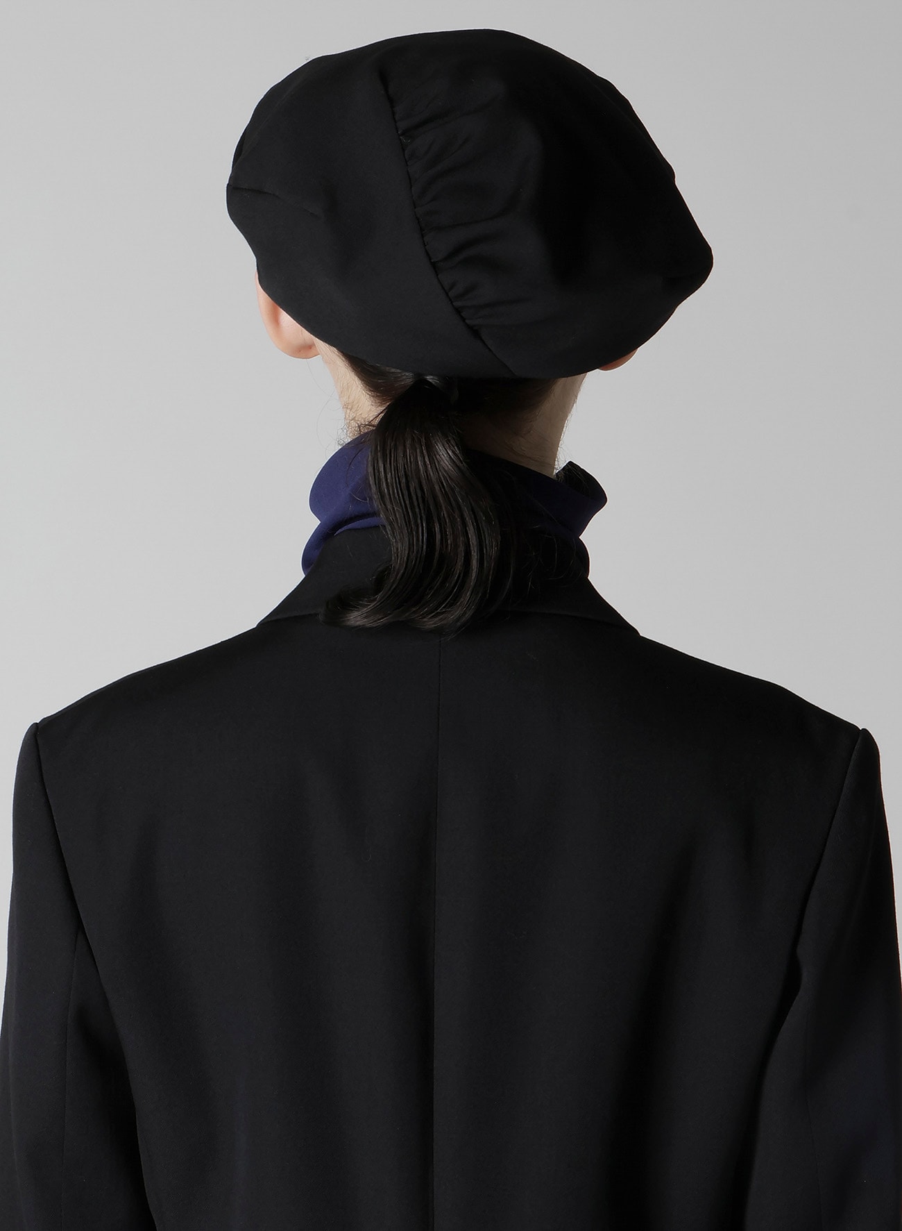 ワイズの代表的な素材、ウールギャバジンを使用したベレー帽子。生地の仕上げ工程で織物に軽くシワやシボを付け、ウール本来の風合いに仕上げています。不均等なダーツと部分的なギャザーで立体を作り、モードな印象に仕上げました。