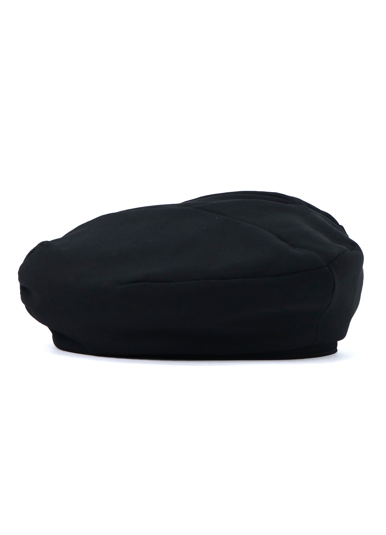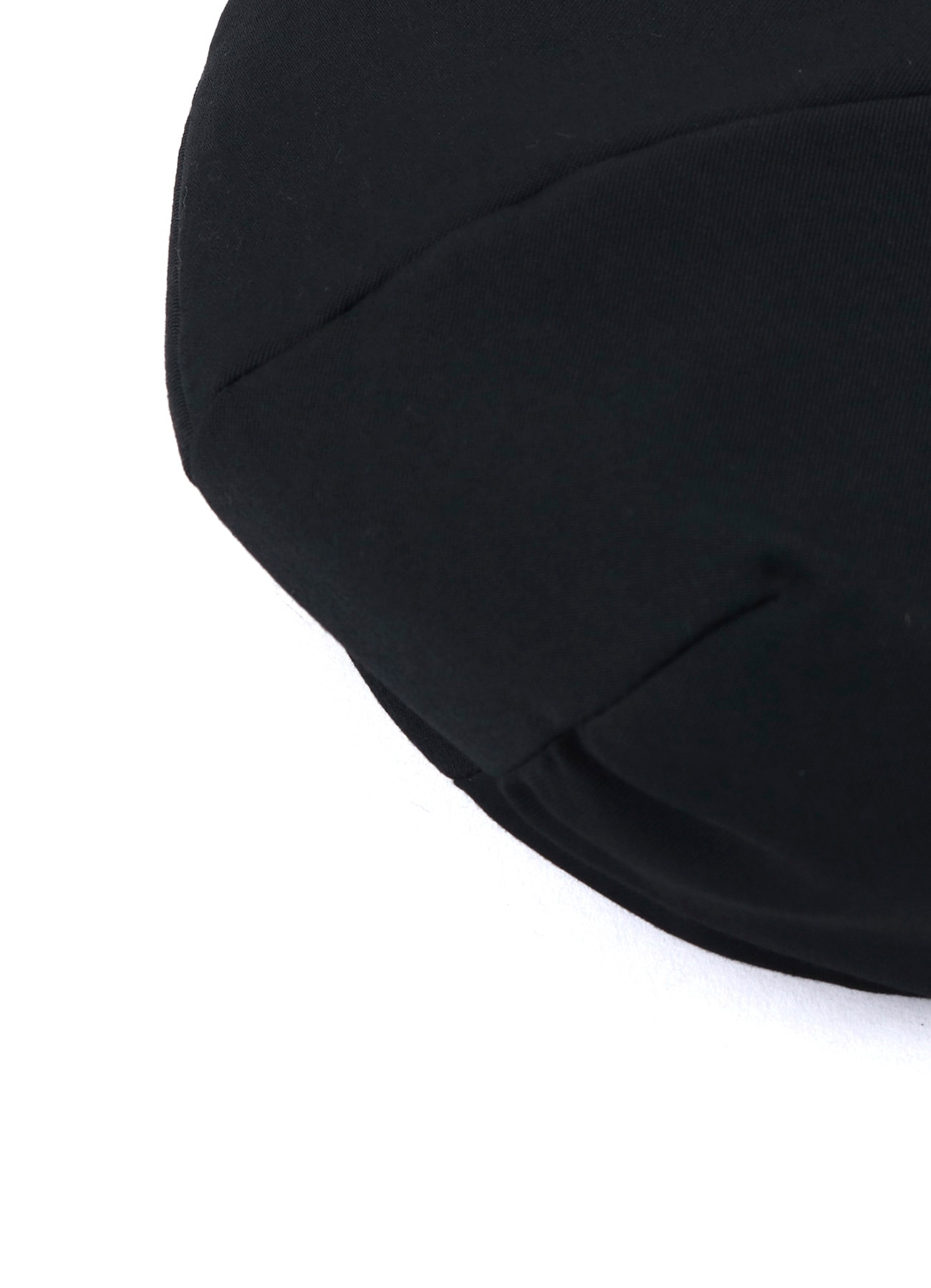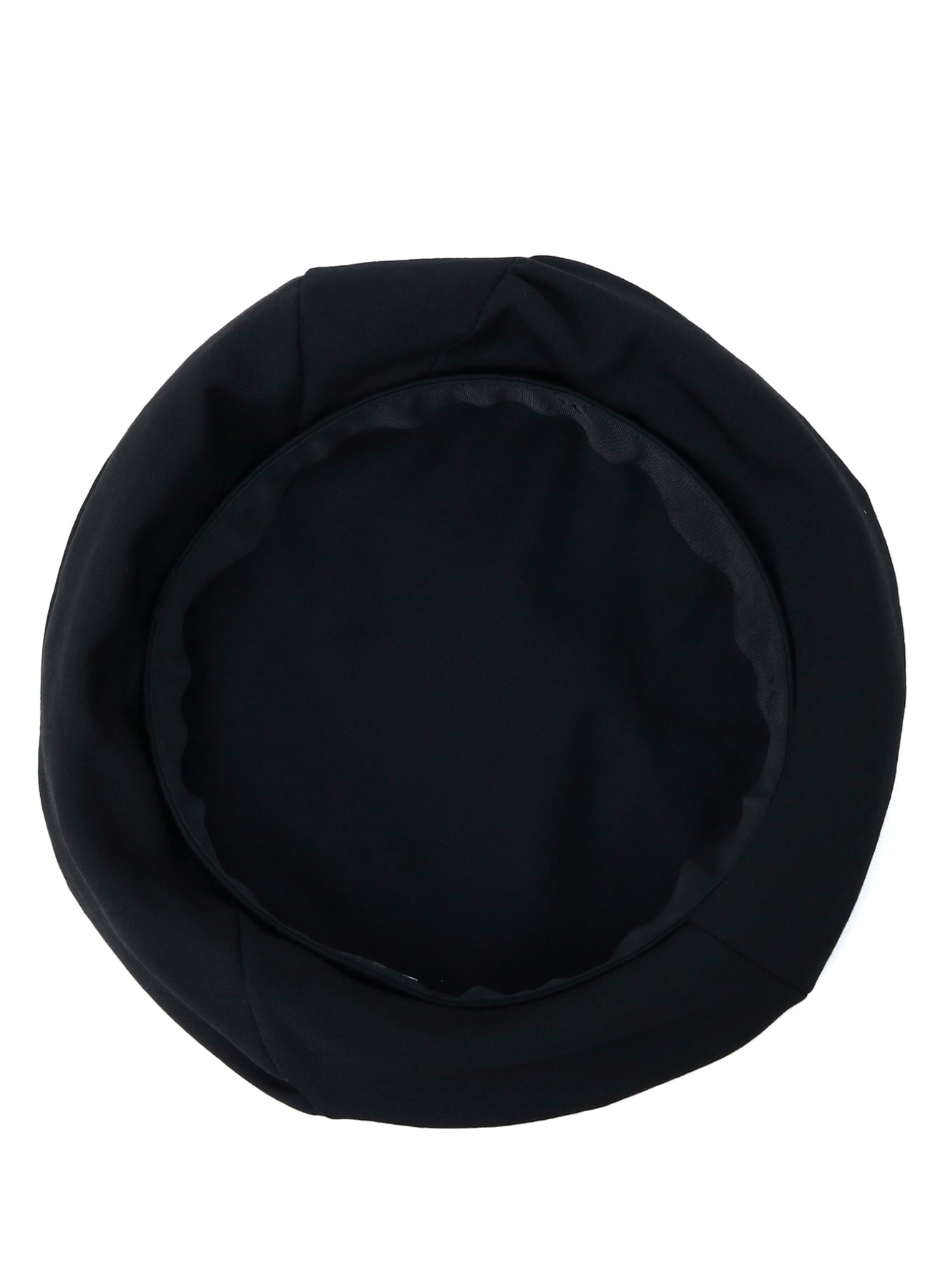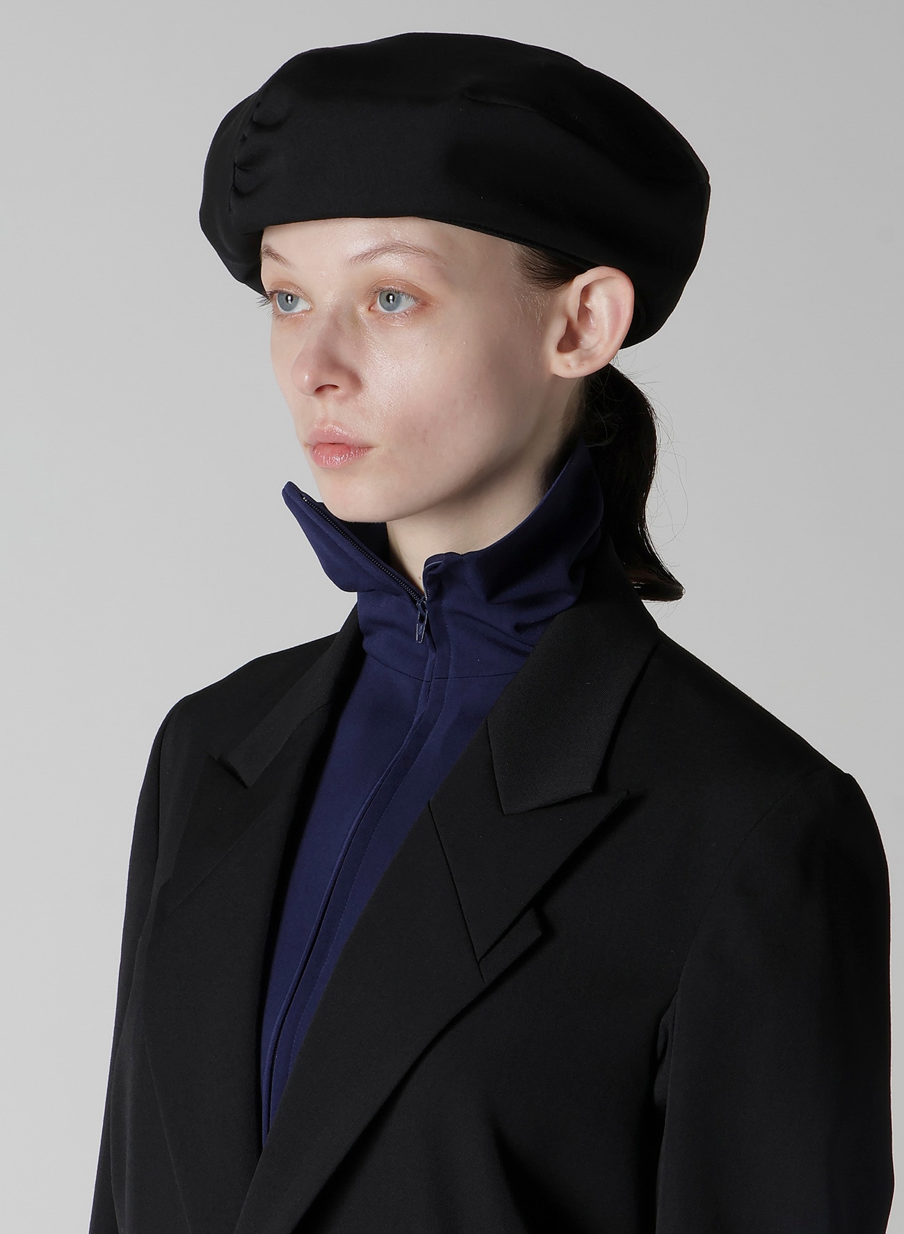 ワイズの代表的な素材、ウールギャバジンを使用したベレー帽子。生地の仕上げ工程で織物に軽くシワやシボを付け、ウール本来の風合いに仕上げています。不均等なダーツと部分的なギャザーで立体を作り、モードな印象に仕上げました。