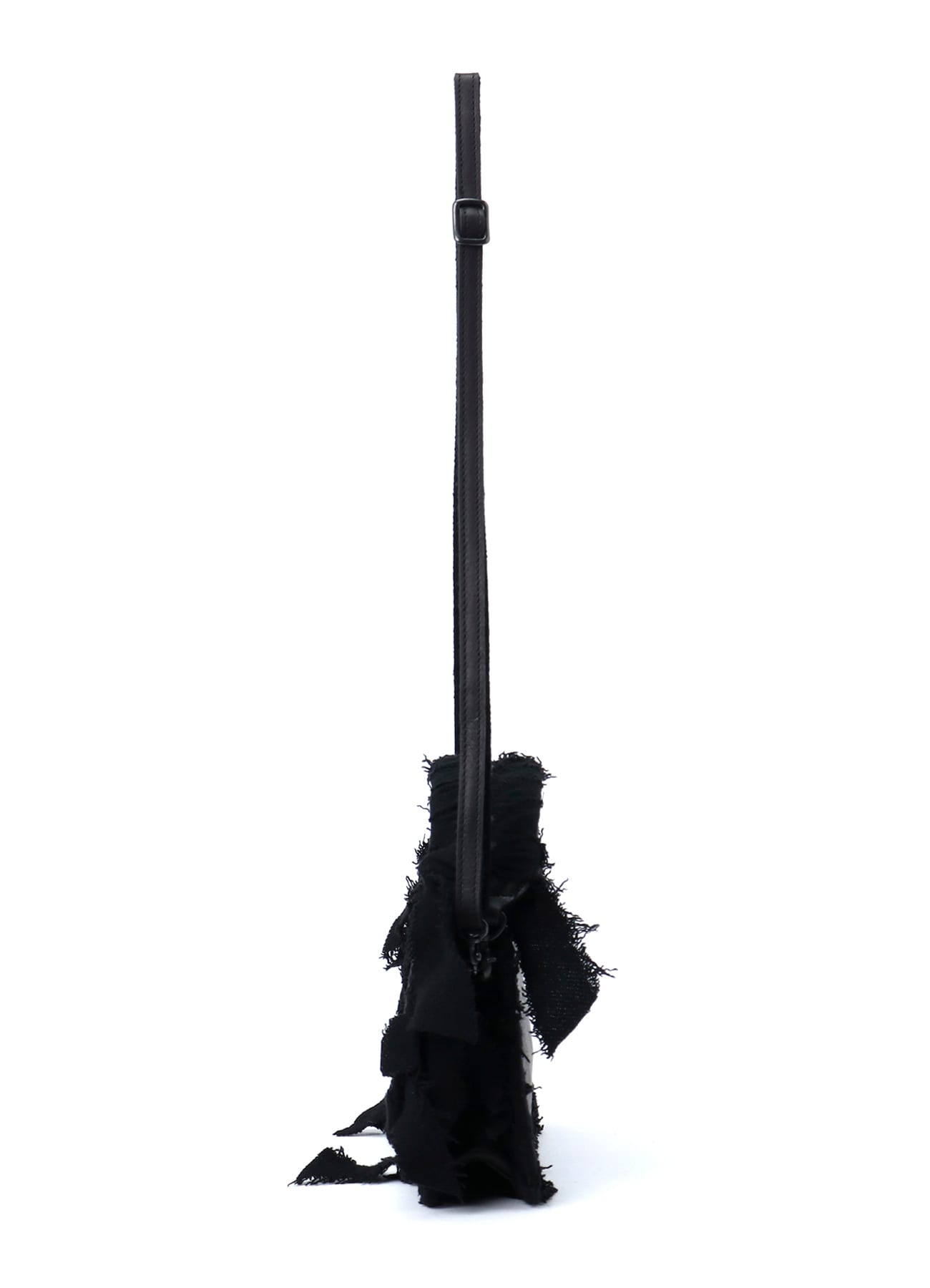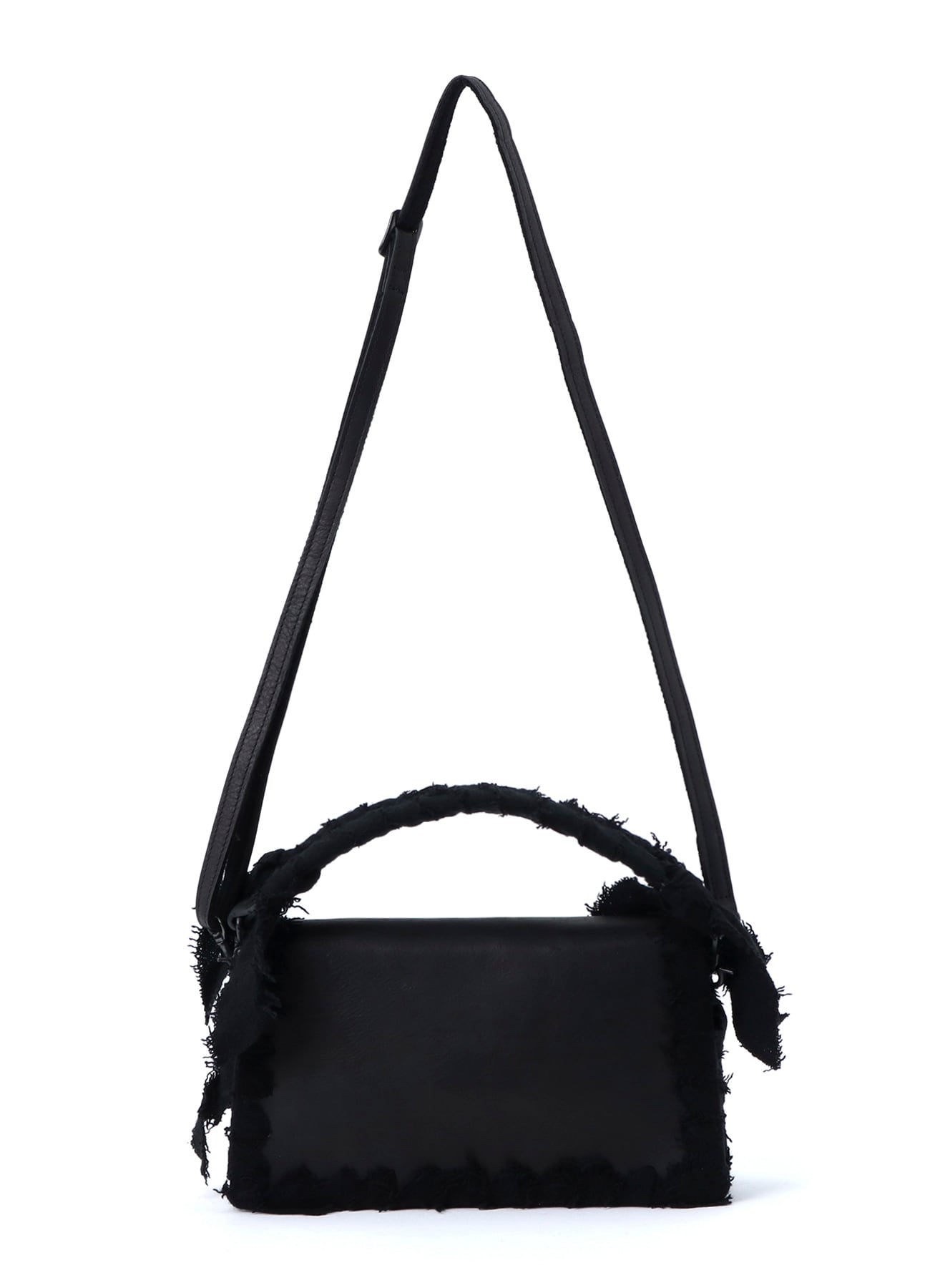 編み編みがアクセントのレザーショルダーバッグ。革本来の表面を活かした素上げ調レザーの端をテープで手作業でかがっています。あえて所々結び目を出したり、ほつれを目立たせたりと粗雑な要素を加えることで、整った形状のレザーバッグをワイズらしく崩しました。革の性質上、発汗性および摩擦により若干の色落ちがあります。淡い色の衣服との使用時はご注意ください。