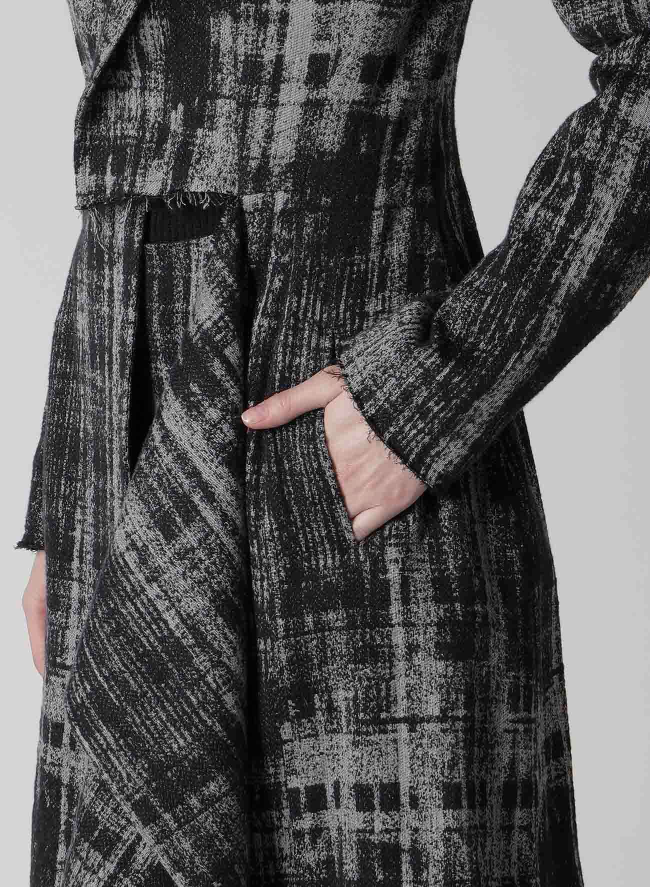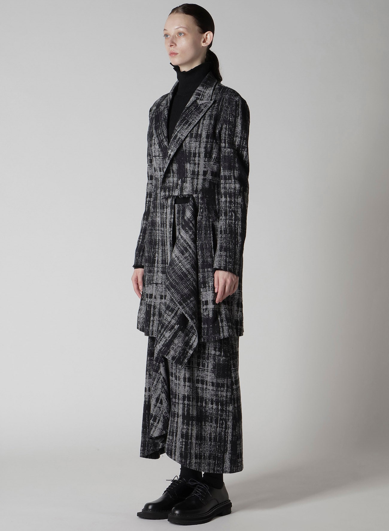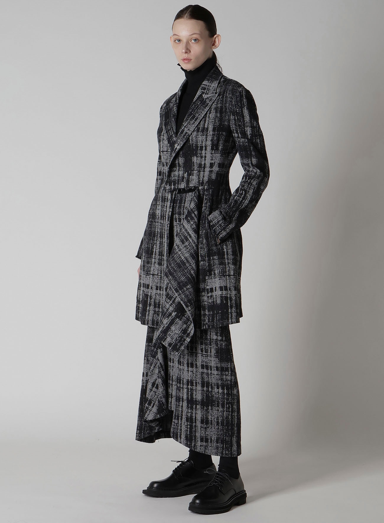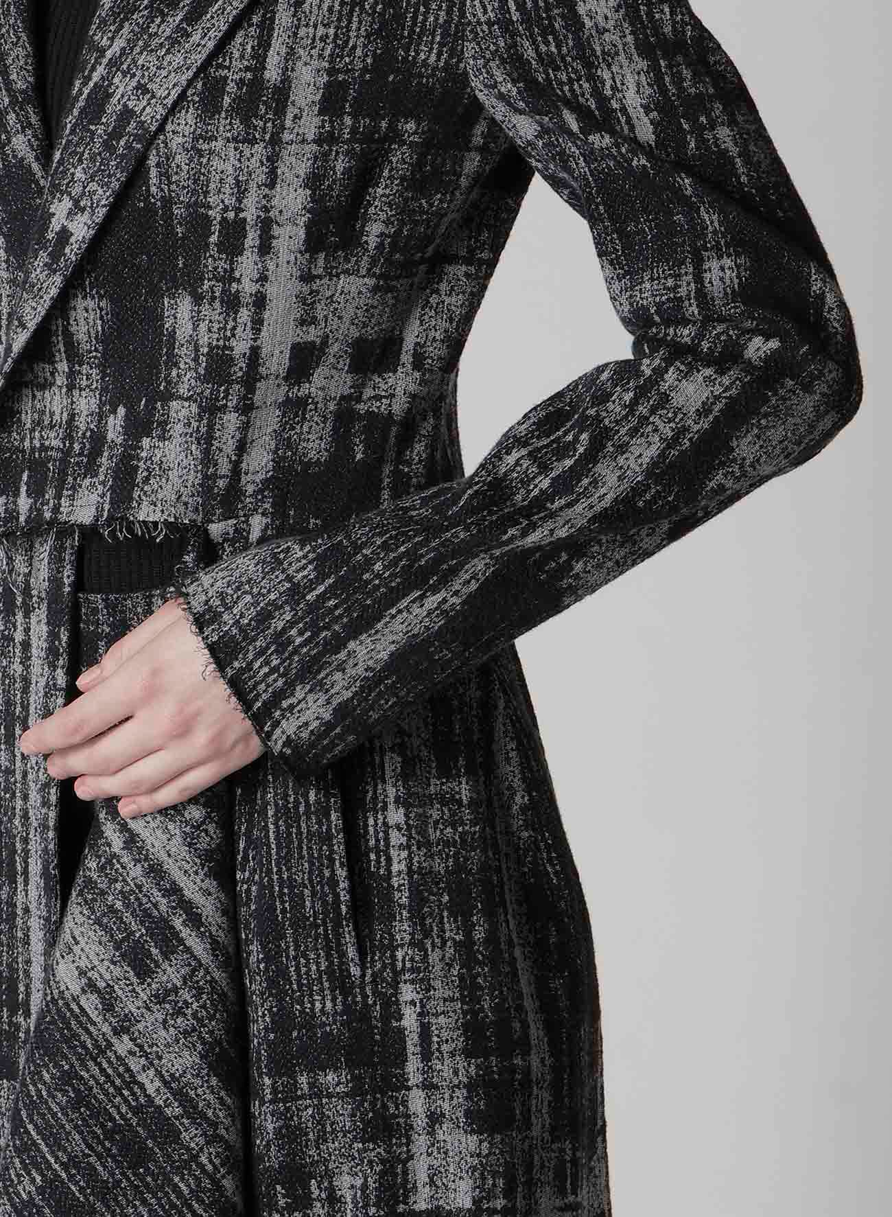 ドレープがポイントのジャケット。モノトーンでも単調にならないように細部にまで拘り、より深みのある表情を追求したジャガード生地。フロントの切り込みから布を落としたデザインにより、シルエットに動きが生まれます。ジャケットの構築性と布の動きがコントラストになった迫力のある一枚です。同素材のスカートとのセットアップでの着用も可能です。