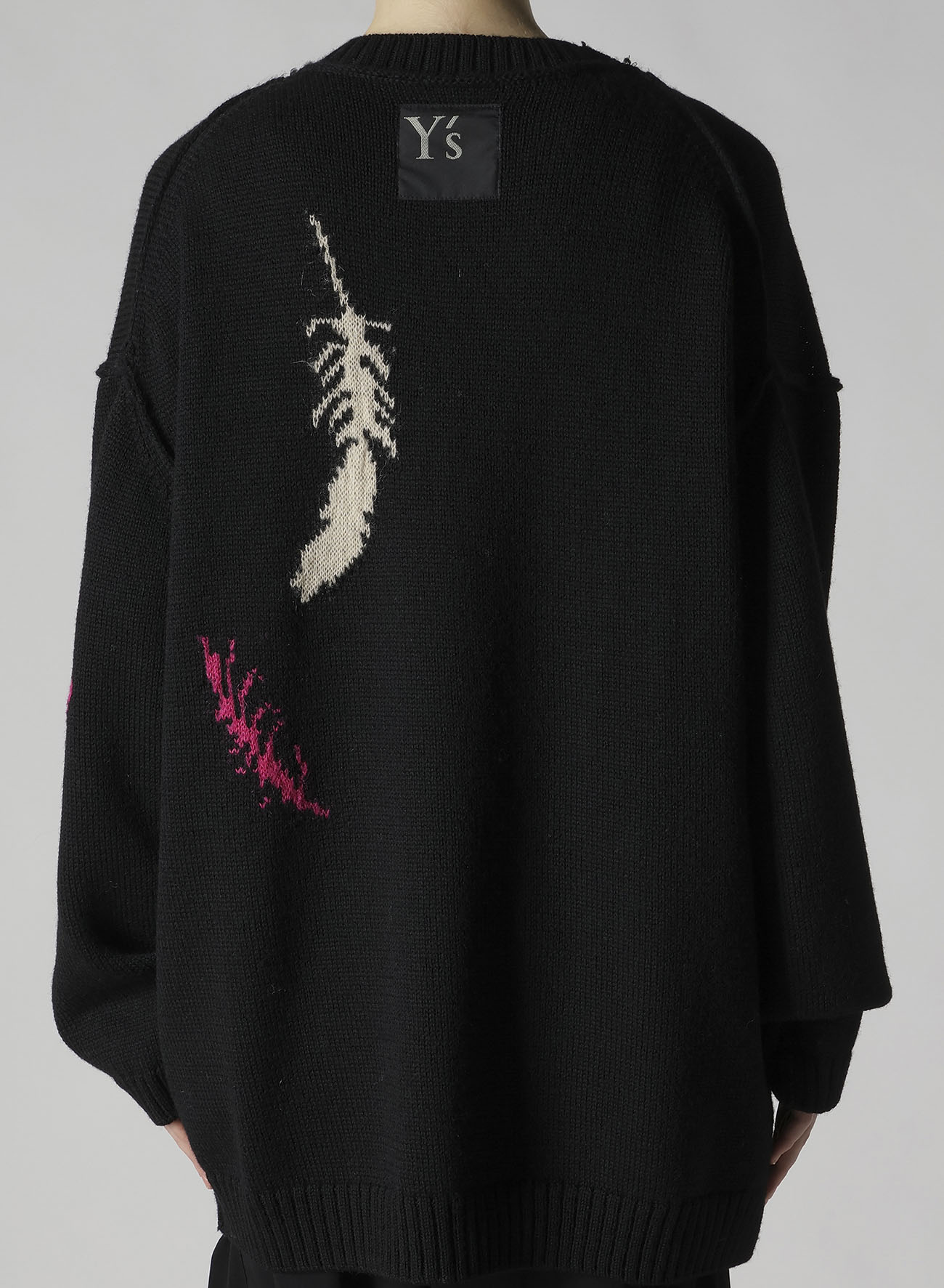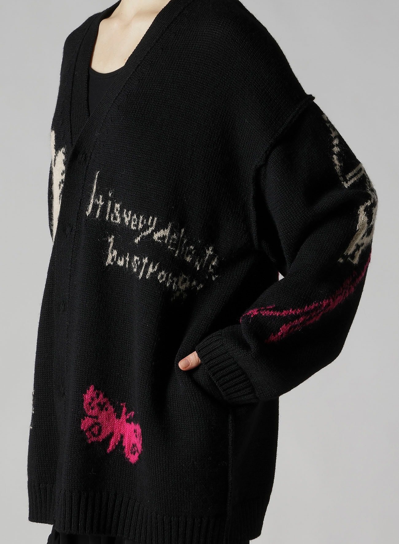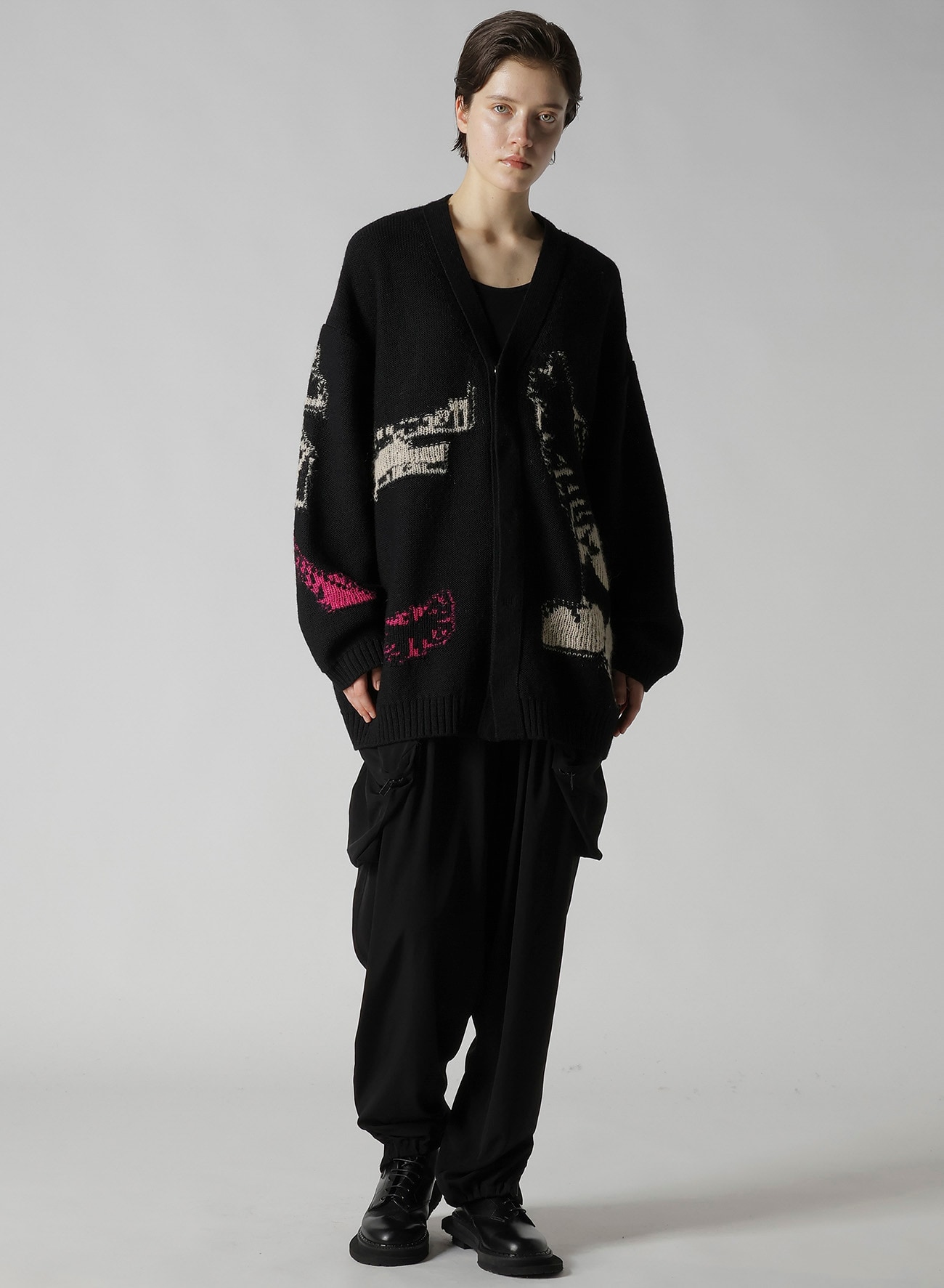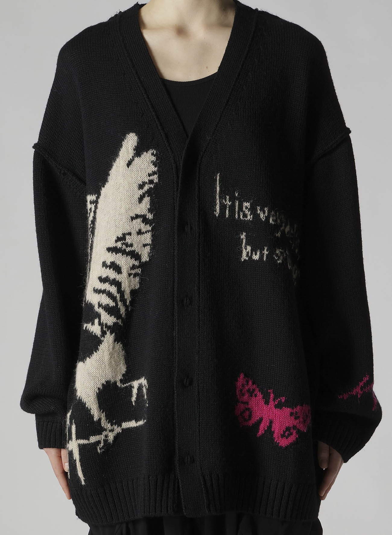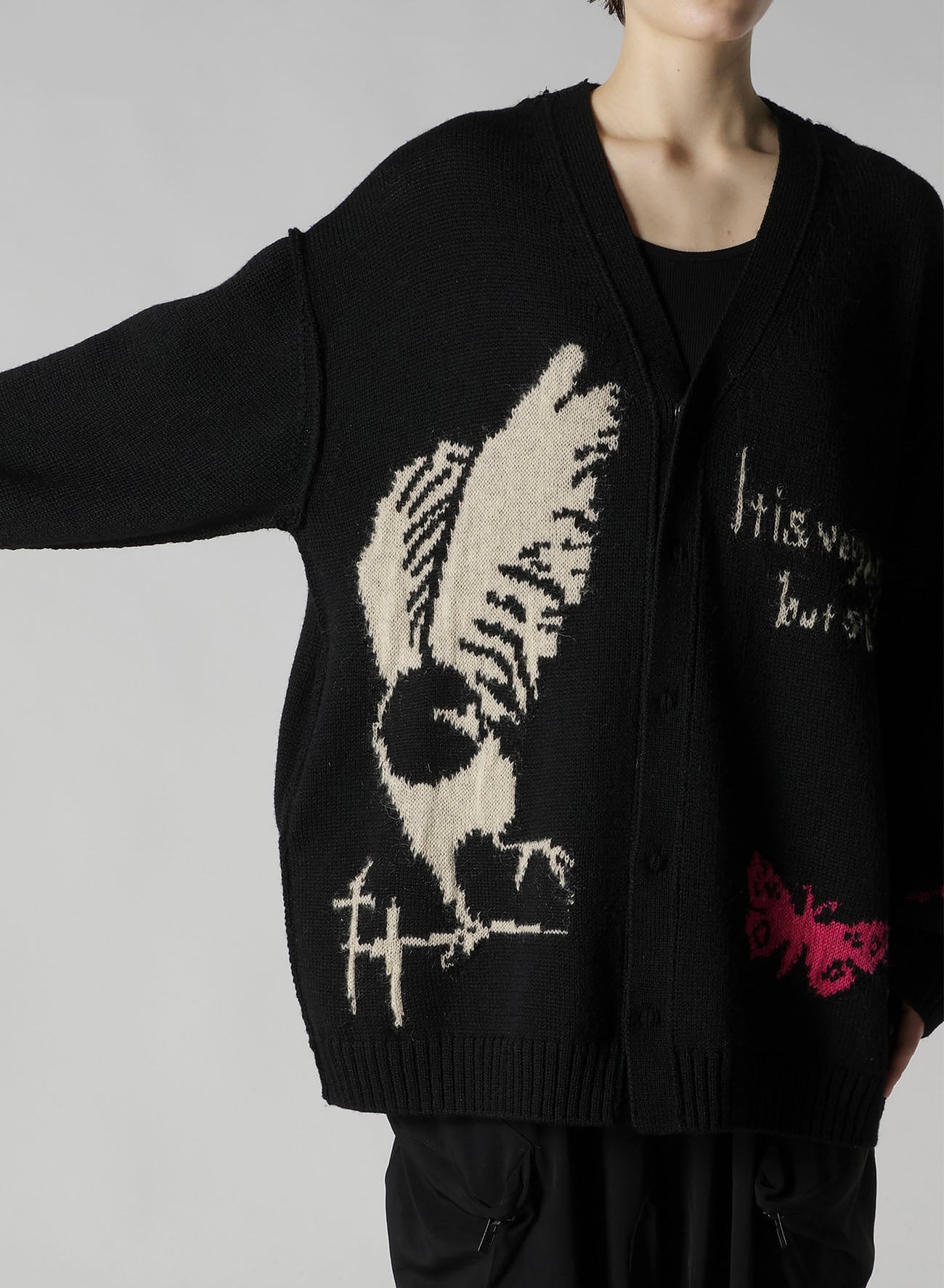 リバーシブルのVネックカーディガン。25AWシーズンに登場する鳥や羽のモチーフをジャカード編みで表現。リバーシブルでお召しいただくことができ、中表にするとコミカルなモチーフがくっきりと現れます。オーバーサイズのシルエットのため、男性にもおすすめです。